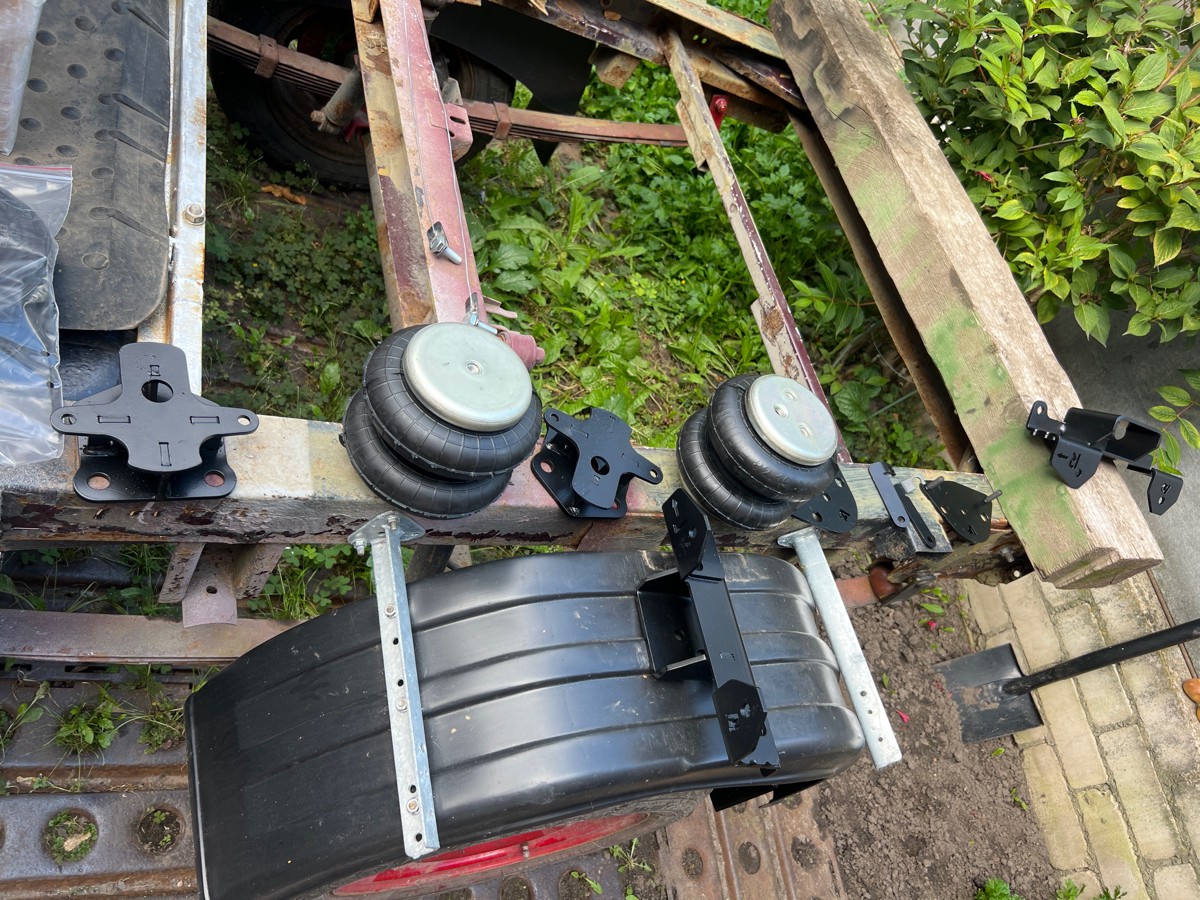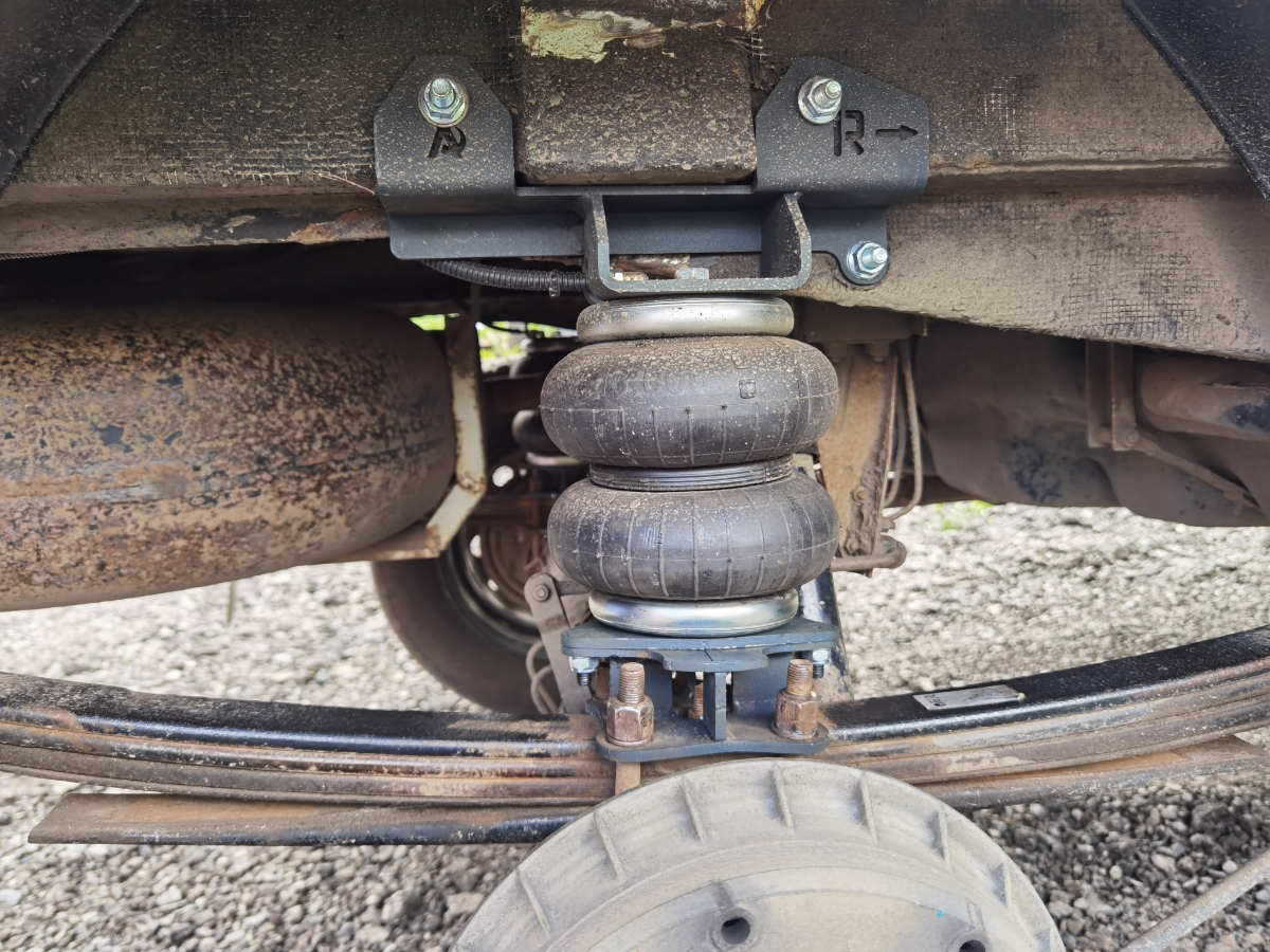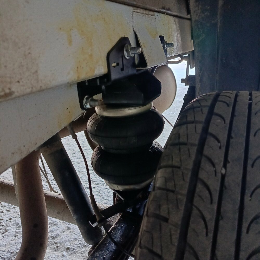 Комплект пневматической подвески разработан специально для автомобиля и включает в себя два пневмоэлемента, кронштейны для крепления к раме и мосту, крепеж, фурнитуру для накачки от внешнего компрессора, инструкцию по установки своими руками.