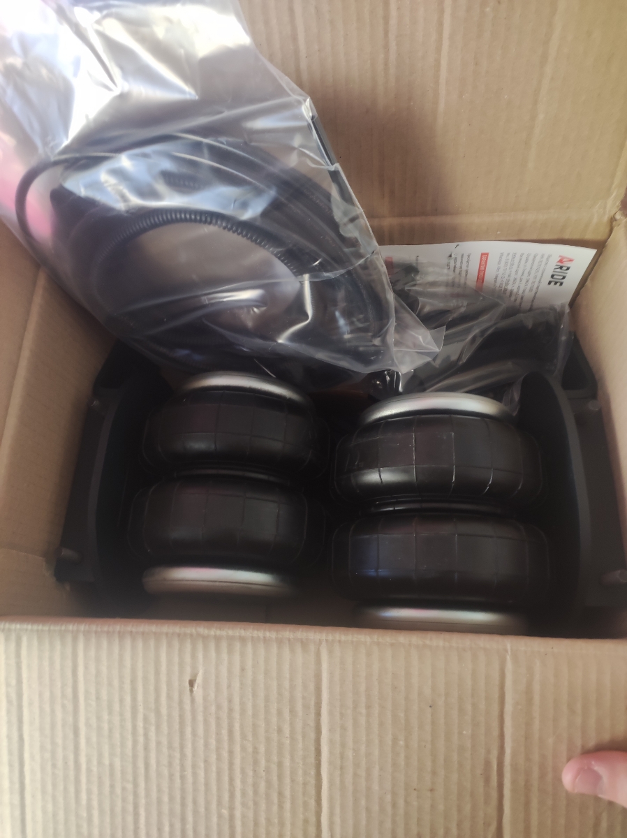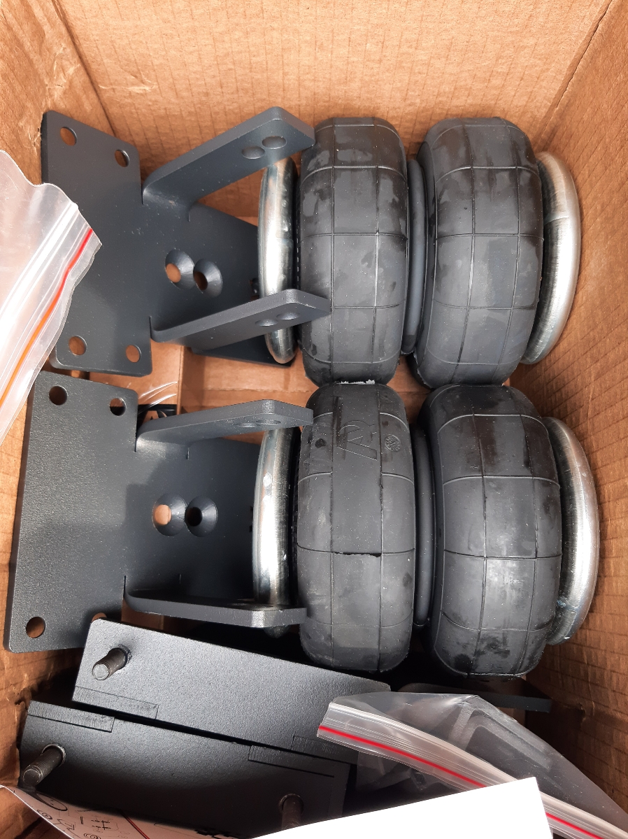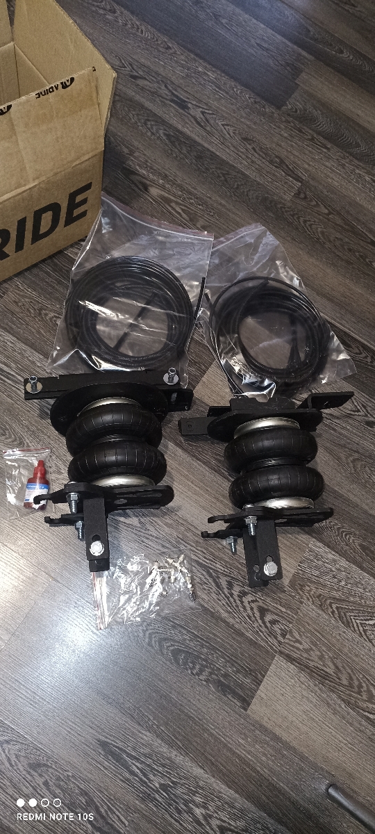 Комплект пневматической подвески разработан специально для автомобиля и включает в себя два пневмоэлемента, кронштейны для крепления к раме и мосту, крепеж, фурнитуру для накачки от внешнего компрессора, инструкцию по установки своими руками.