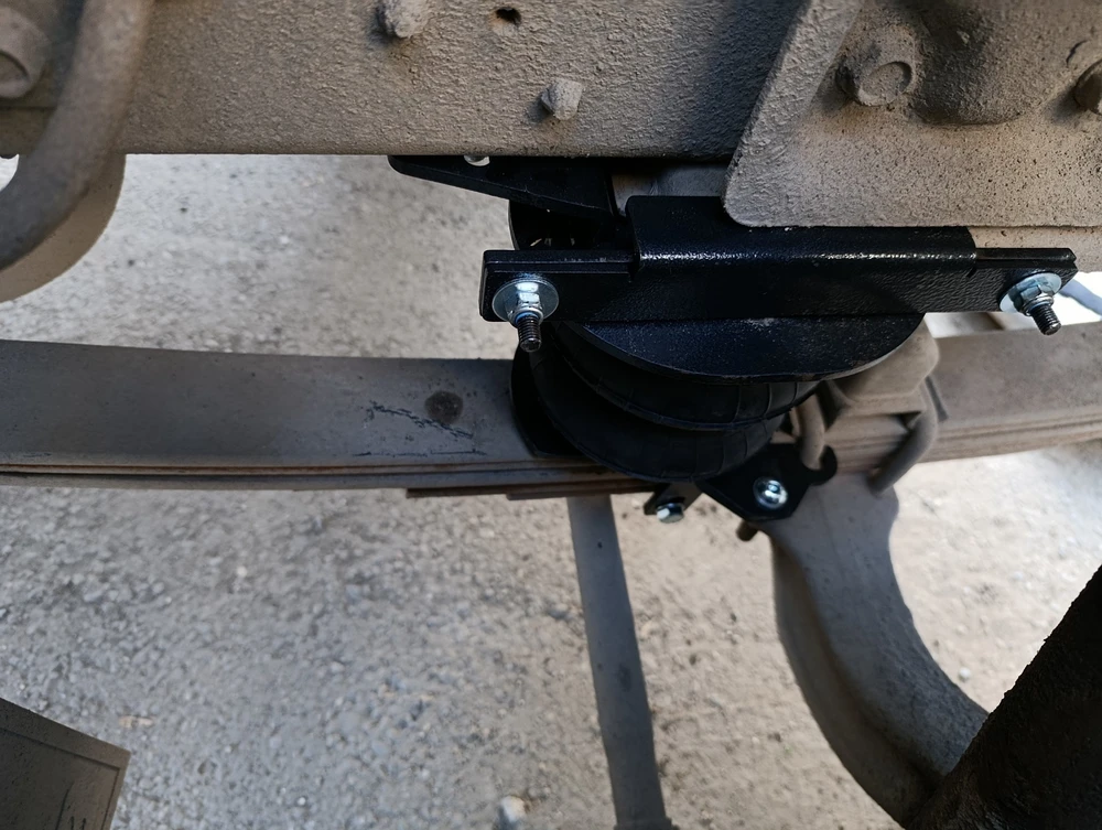 Комплект пневмоподвески устанавливается в дополнение к штатным рессорам и не вносит изменения в штатные элементы подвески. Следовательно, данный комплект не требует вносить изменения в ПТС автомобиля. Пневмоподушка ставится между рамой с рессорами на специальных крепежных пластинах, идущих в комплекте. Верхняя крепежная пластина ставится на раму в штатные отверстия, между крепления ставится дополнительная поперечная распорка для усиления рамы и распределения нагрузки. Нижняя крепежная пластина ставится на мост.