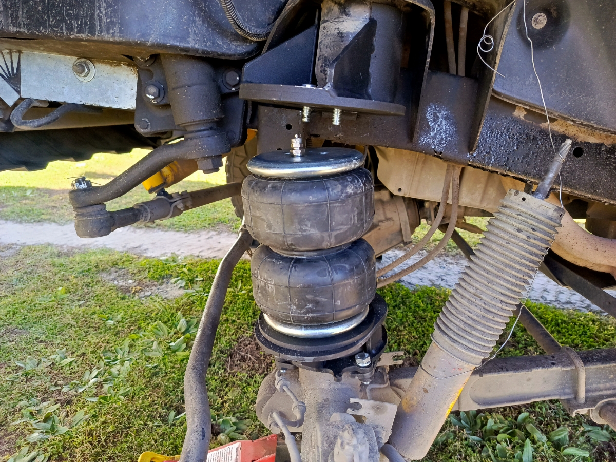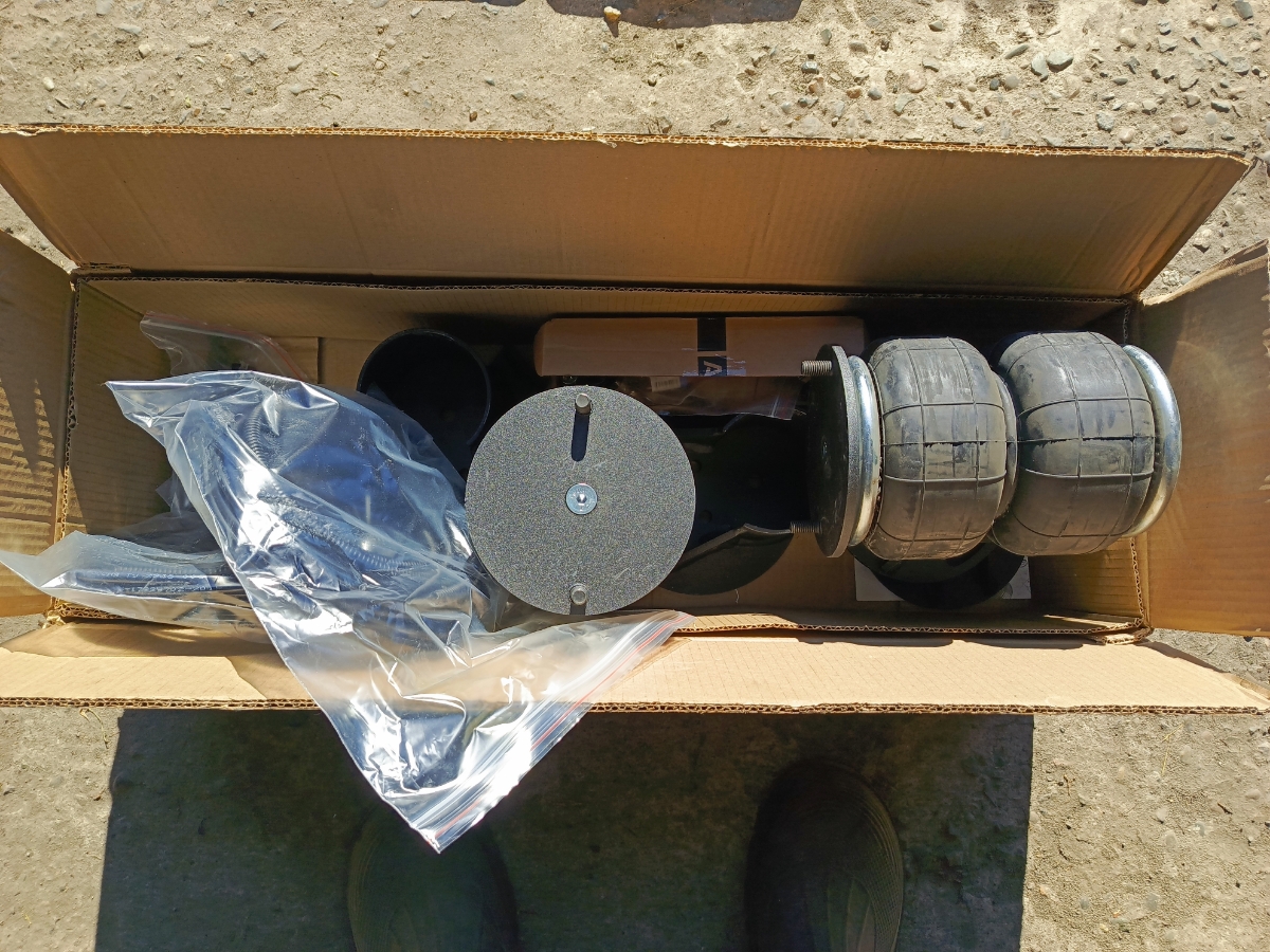 Комплект пневматической подвески разработан специально для автомобиля и включает в себя два пневмоэлемента, кронштейны для крепления к раме и мосту, крепеж, фурнитуру для накачки от внешнего компрессора, инструкцию по установки своими руками.