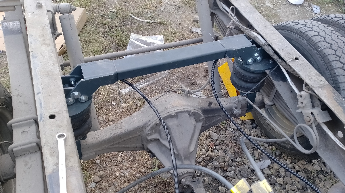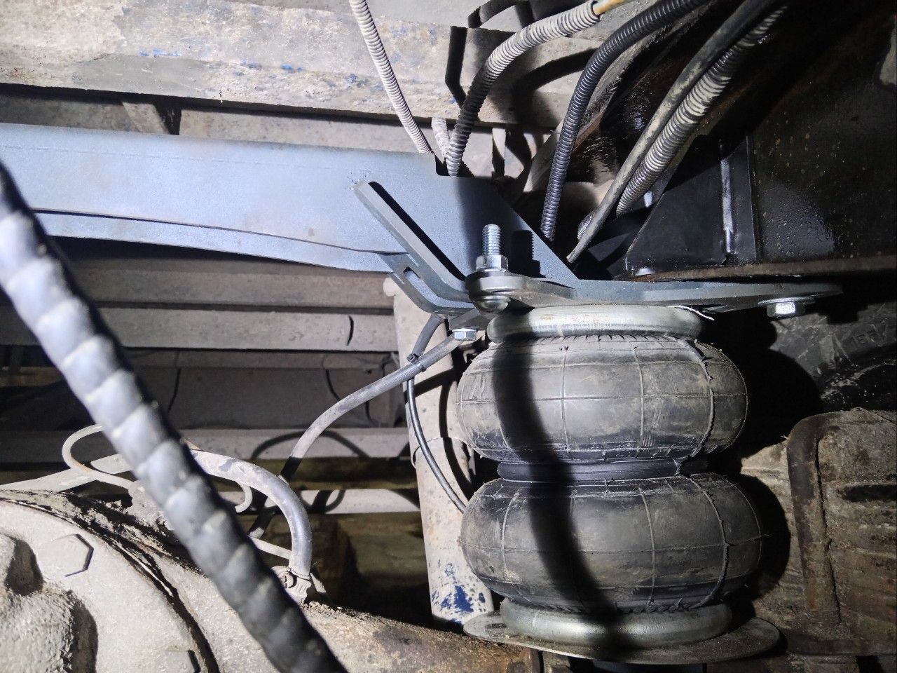 Комплект пневмоподвески устанавливается в дополнение к штатным рессорам и не вносит изменения в штатные элементы подвески. Следовательно, данный комплект не требует вносить изменения в ПТС автомобиля. Пневмоподушка ставится между рамой с рессорами на специальных крепежных пластинах, идущих в комплекте. Верхняя крепежная пластина ставится на раму в штатные отверстия, между крепления ставится дополнительная поперечная распорка для усиления рамы и распределения нагрузки. Нижняя крепежная пластина ставится на мост.