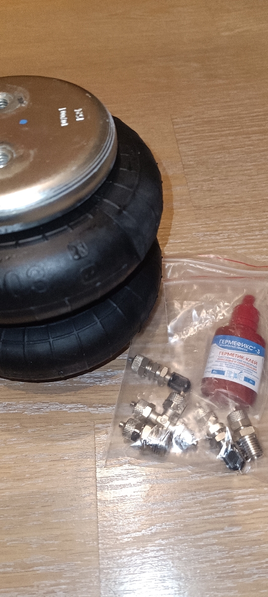 Комплект пневматической подвески разработан специально для автомобиля и включает в себя два пневмоэлемента, кронштейны для крепления к раме и мосту, крепеж, фурнитуру для накачки от внешнего компрессора, инструкцию по установки своими руками.