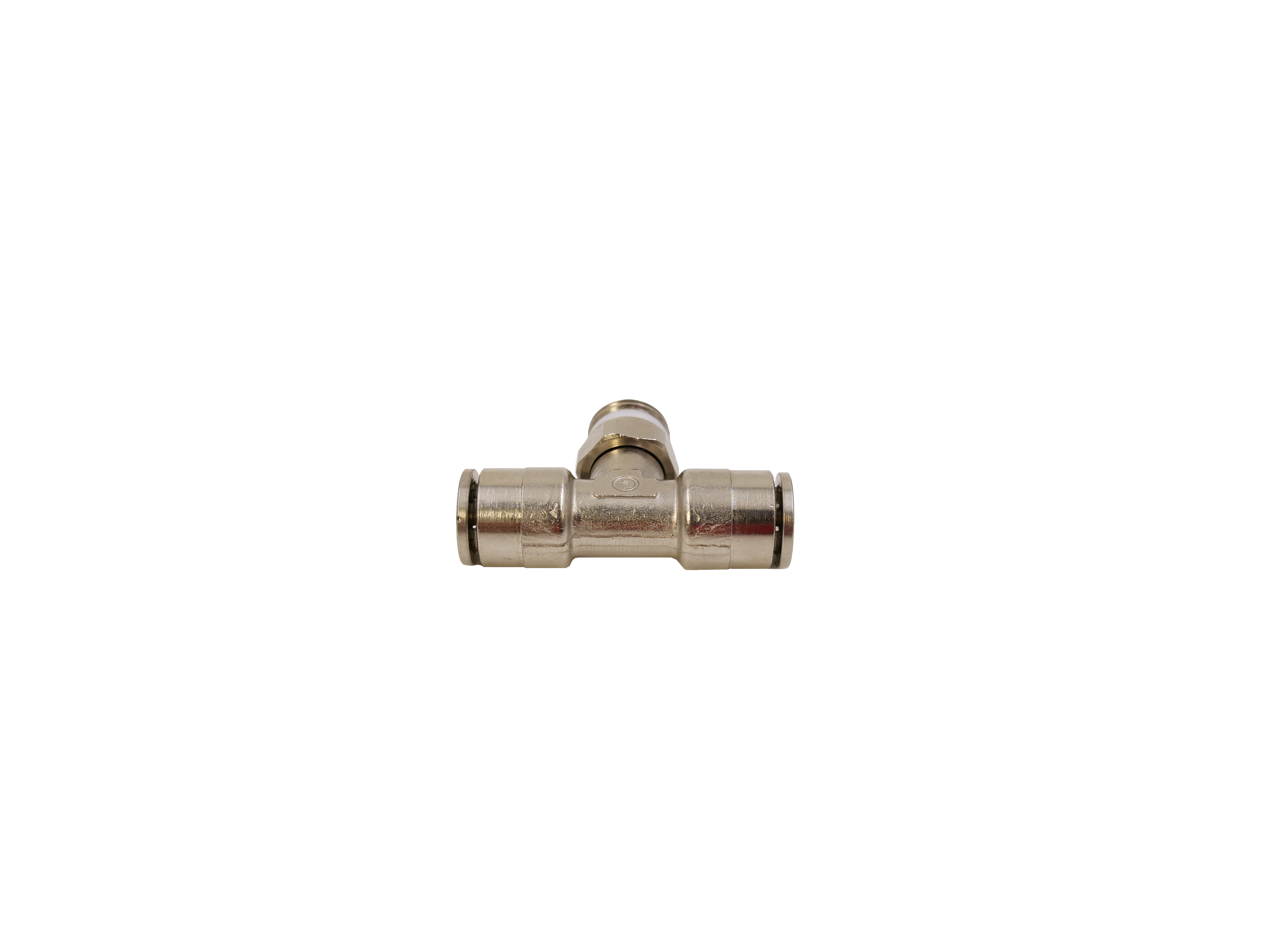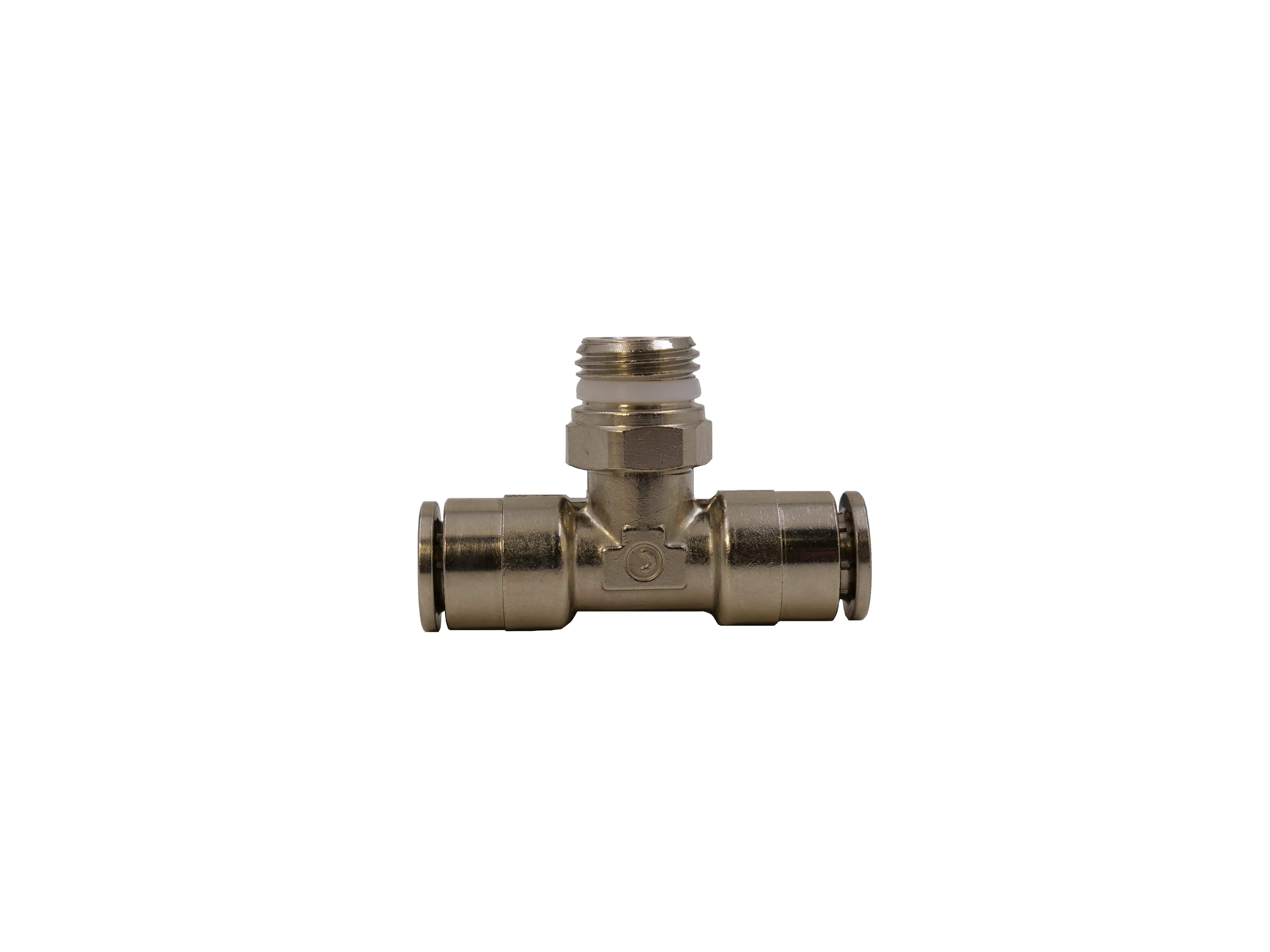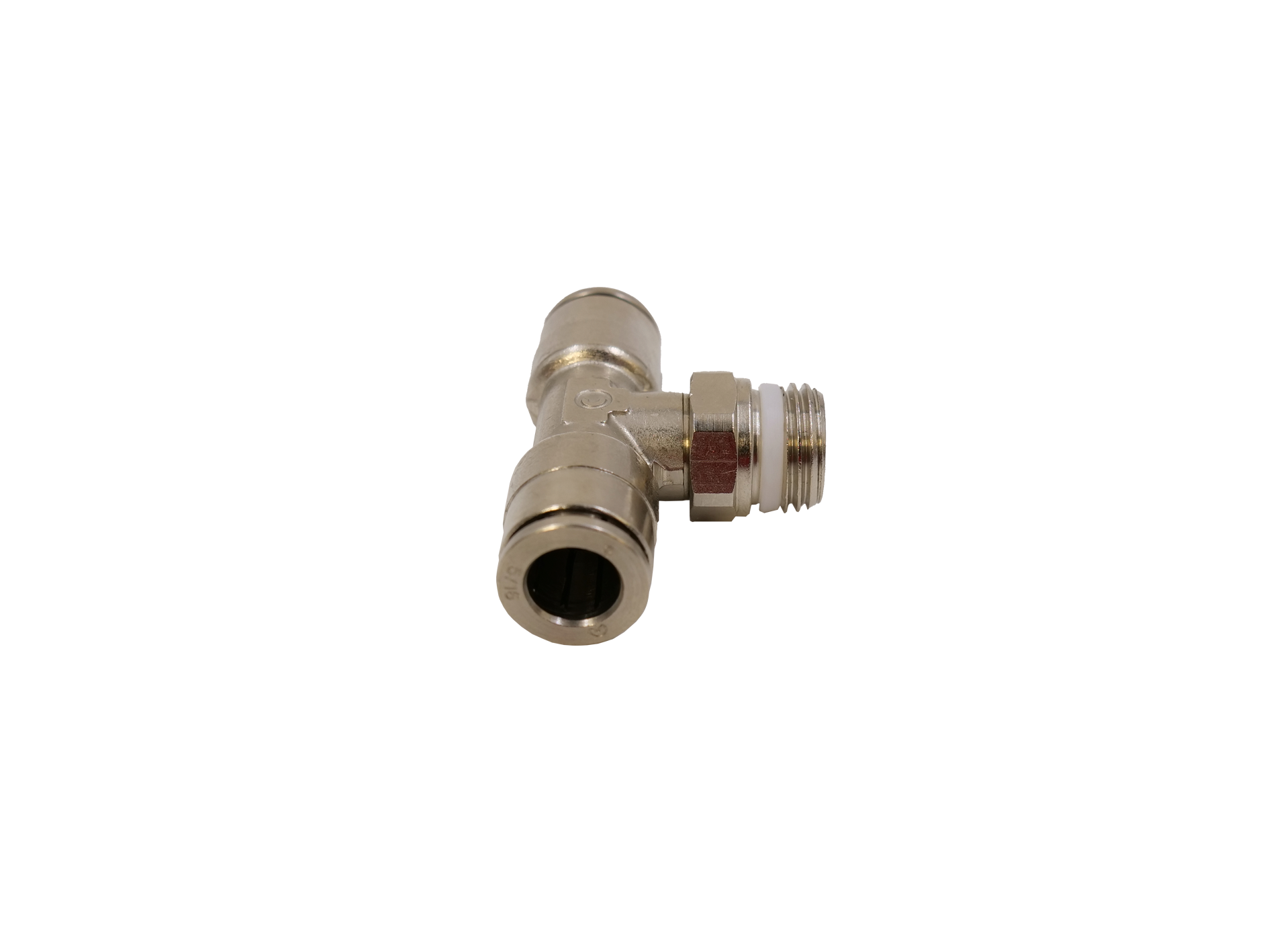 Тройник цанговый поворотный Camozzi, наружная резьба G1/4" с уплотнительным фторопластовым кольцом PTFE, цанговые зажимы под трубку с наружным диаметром 5 мм.