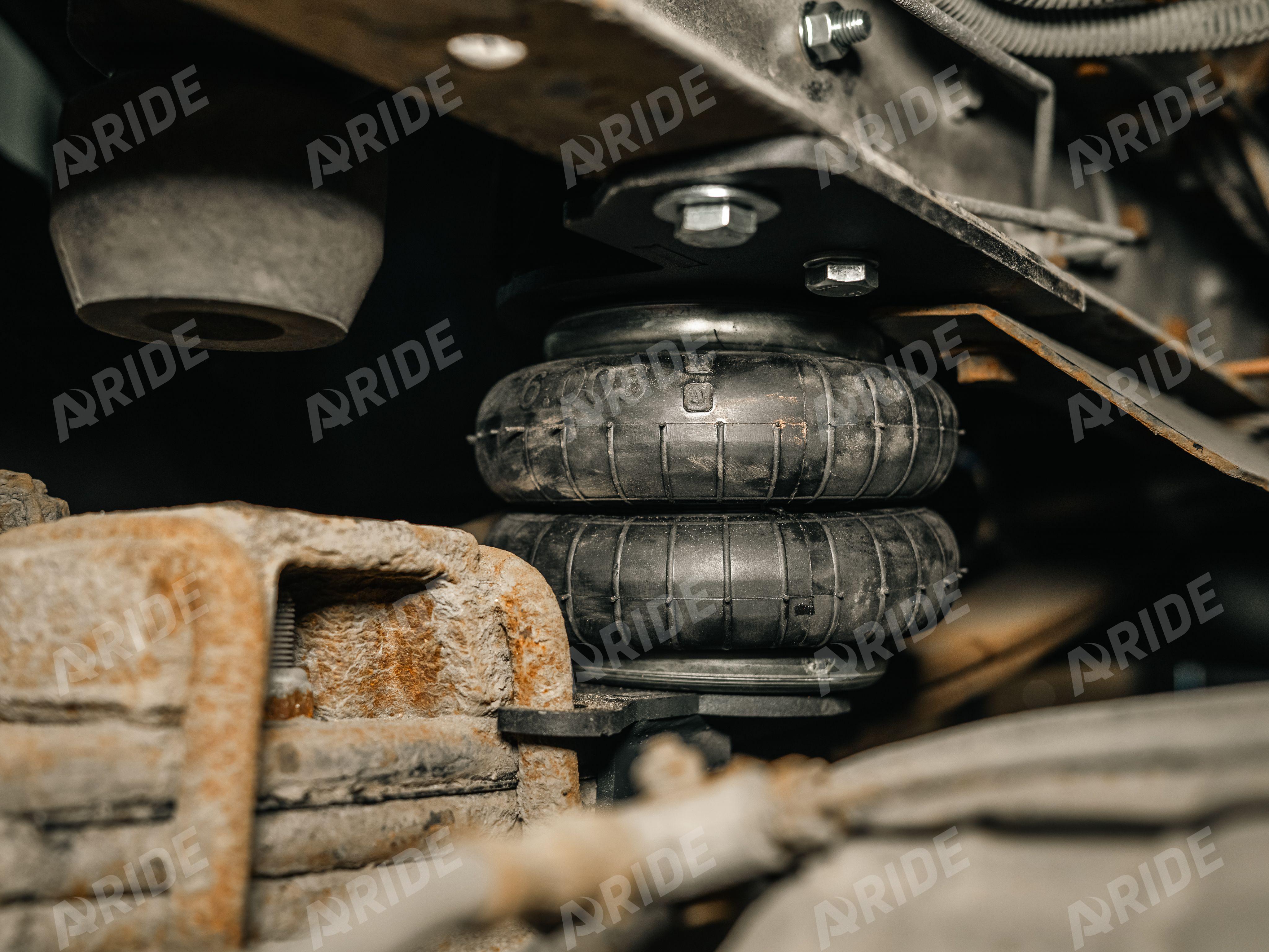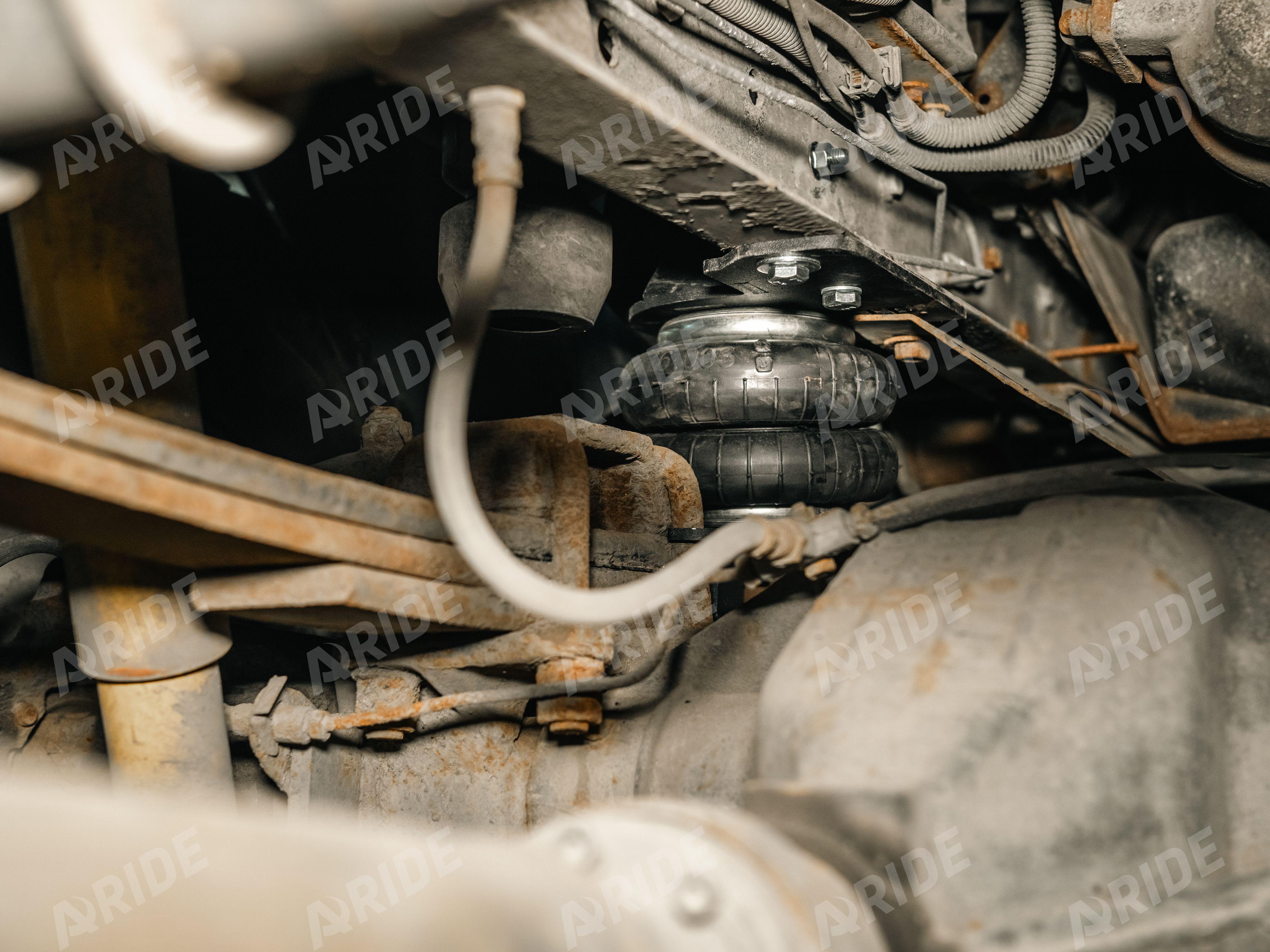Комплект устанавливается на переднюю ось. Подушки монтируются между рамой и рессорным пакетом. Каждая подушка монтируется за счёт специальных кронштейнов, верхние кронштейны крепятся к раме через заводские отверстия, нижние кронштейны крепятся к рессорному пакету. Данный вариант установки пневматических подушек максимально надёжен и позволяет равномерно распределить нагрузку между рессорами и подушками.
