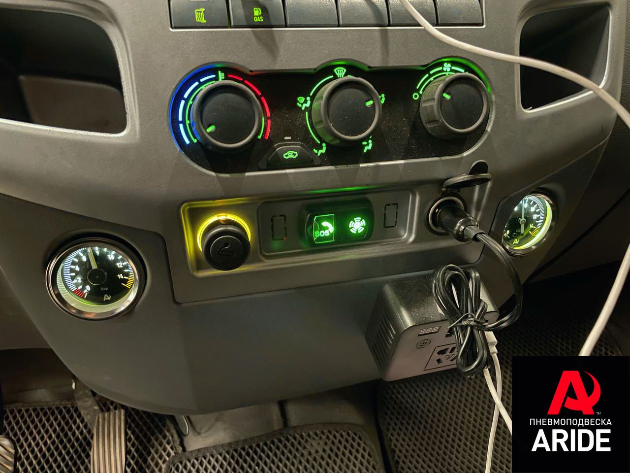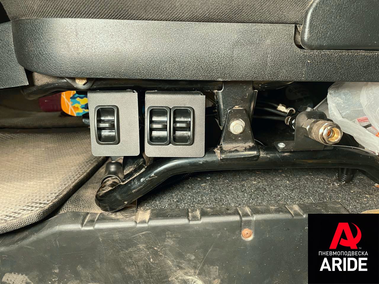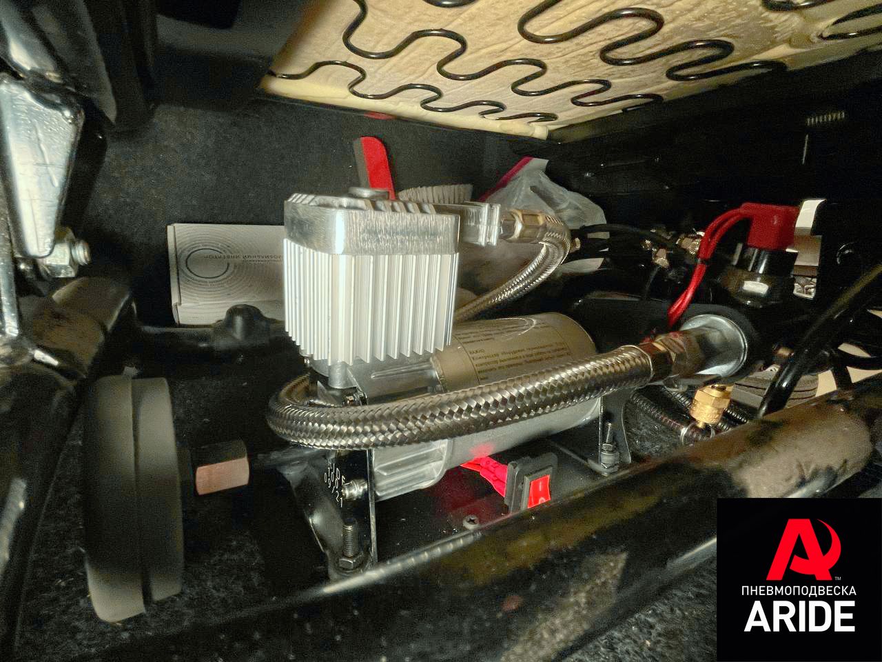 Управление пневматическими подушками реализовано за счёт трёхконтурной системы 3.120.ПС. По желанию клиента, компрессор был установлен под водительское сидение, клавиши управления - слева от водительского сидения, а сами манометры были вмонтированы в панель. Данная система имеет три контура подкачки, один на переднюю ось, и два на заднюю ось. Два контура на задней оси обеспечивают не только плавность хода, уменьшения крена автомобиля, но и при помощи двух контуров есть возможность отдельно отрегулировать высоту каждой стороны. Так же в дополнение к системе управления, была установлена подкачка колёс. Быстросъём был выведен рядом с пневматическими клавишами. А витой шланг и пистолет с манометром убраны в специальный ящик.
