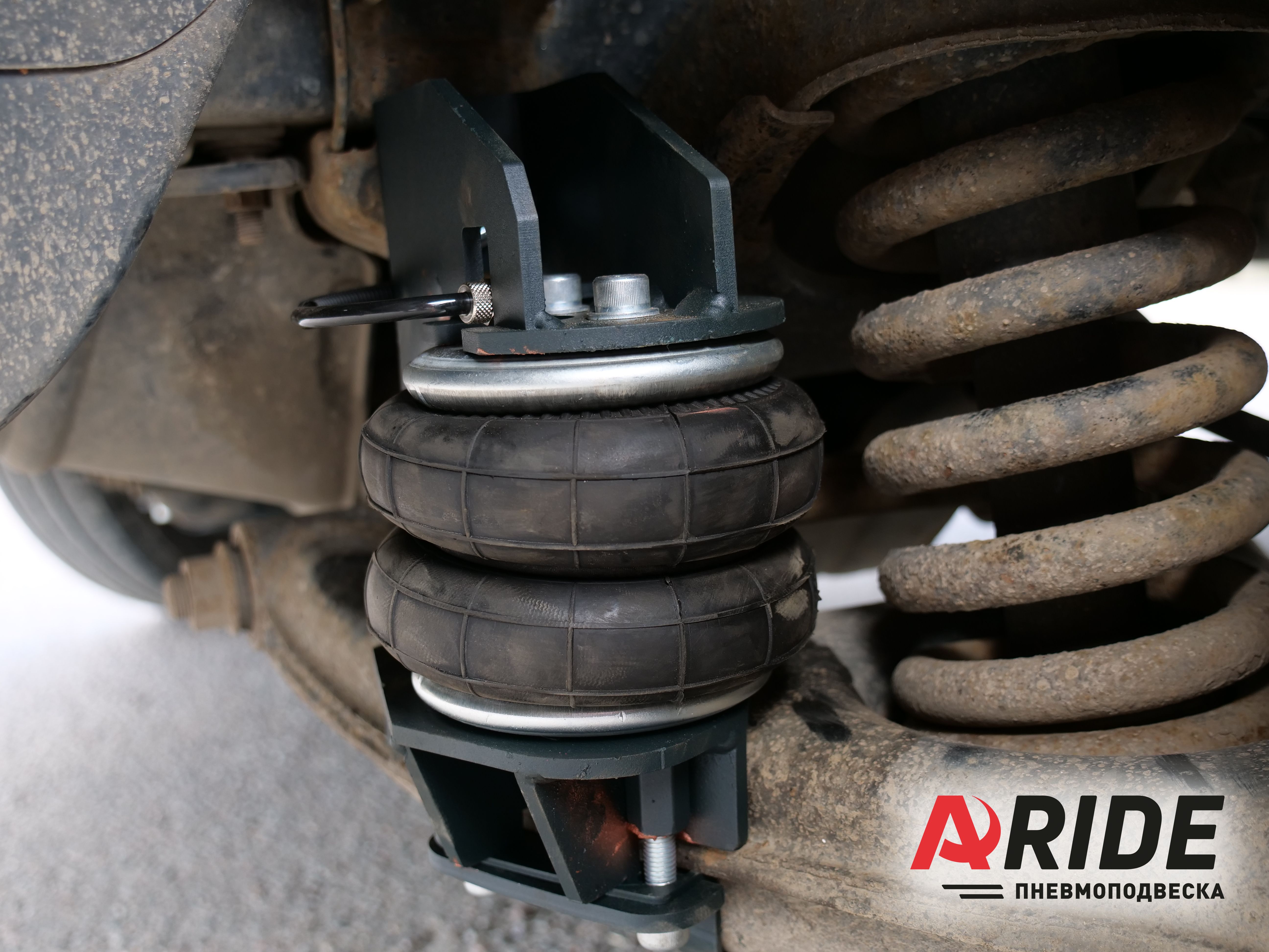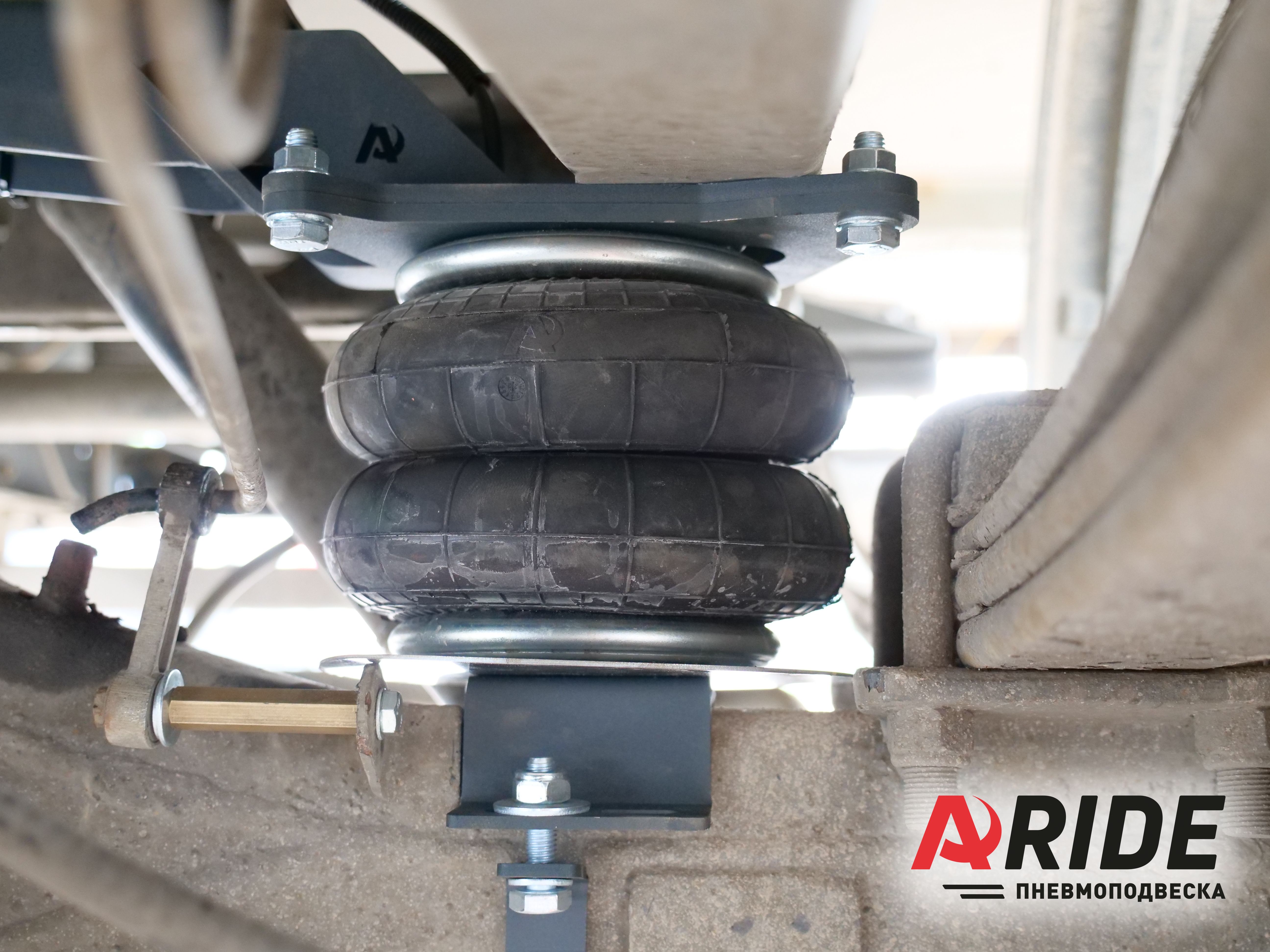 Передний комплект устанавливается в дополнение к заводским пружинам. Он способен снять до 2200 килограмм нагрузки. Пневмоэлементы устанавливаются на рычаг. Верхний кронштейн крепится к подрамнику.