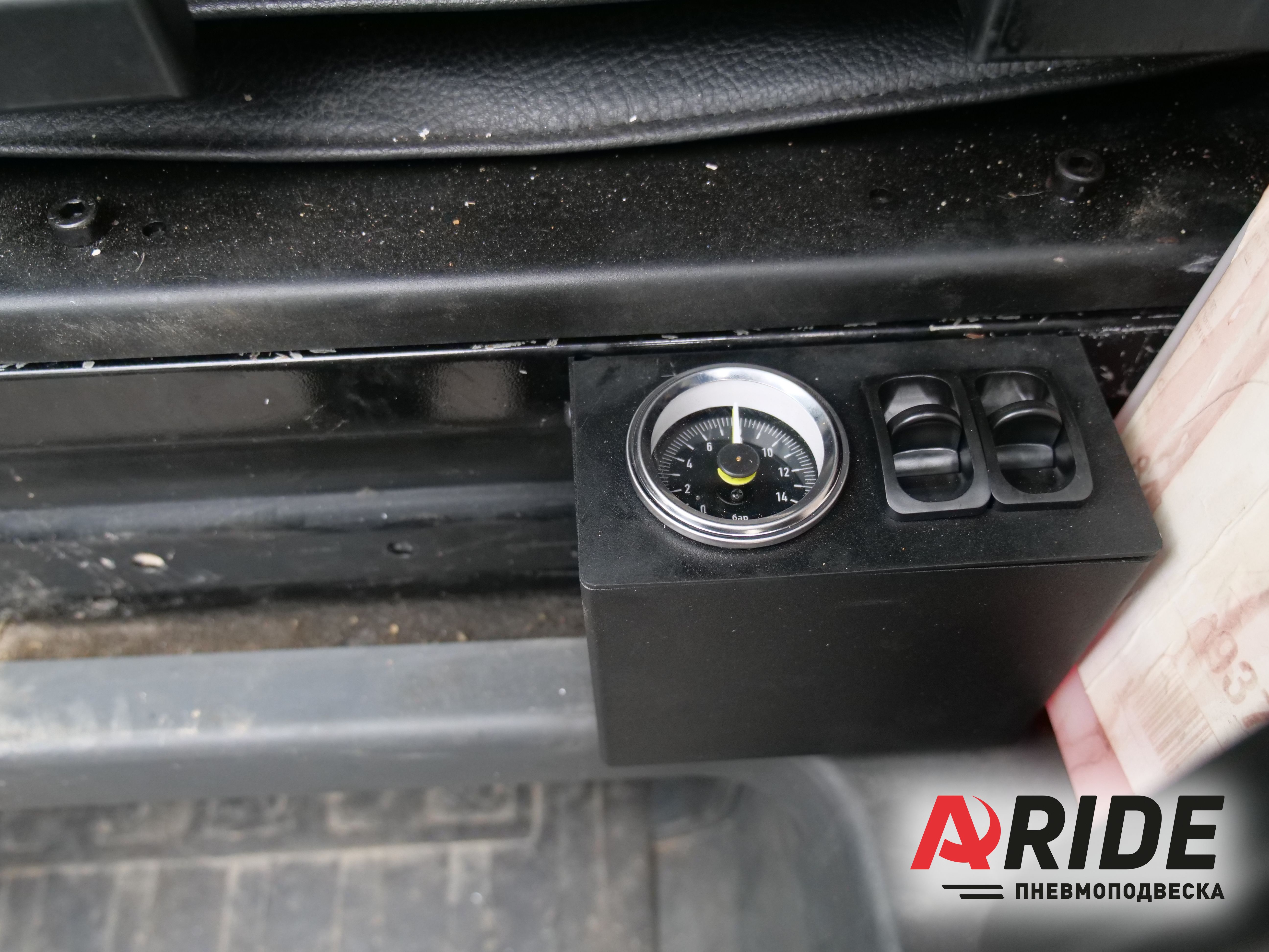 Сама же регулировка давления происходит при помощи установленной двухконтурной системы управления. В данном автомобиле устанавливается именно безкомпрессорная система, так как он оснащён собственным механическим компрессором. Регулировка происходит при помощи двух пневматических клавиш, а отслеживание за счёт двухстрелочного манометра. Сам блок управления располагается на левой стороне ниши водительского сидения.
