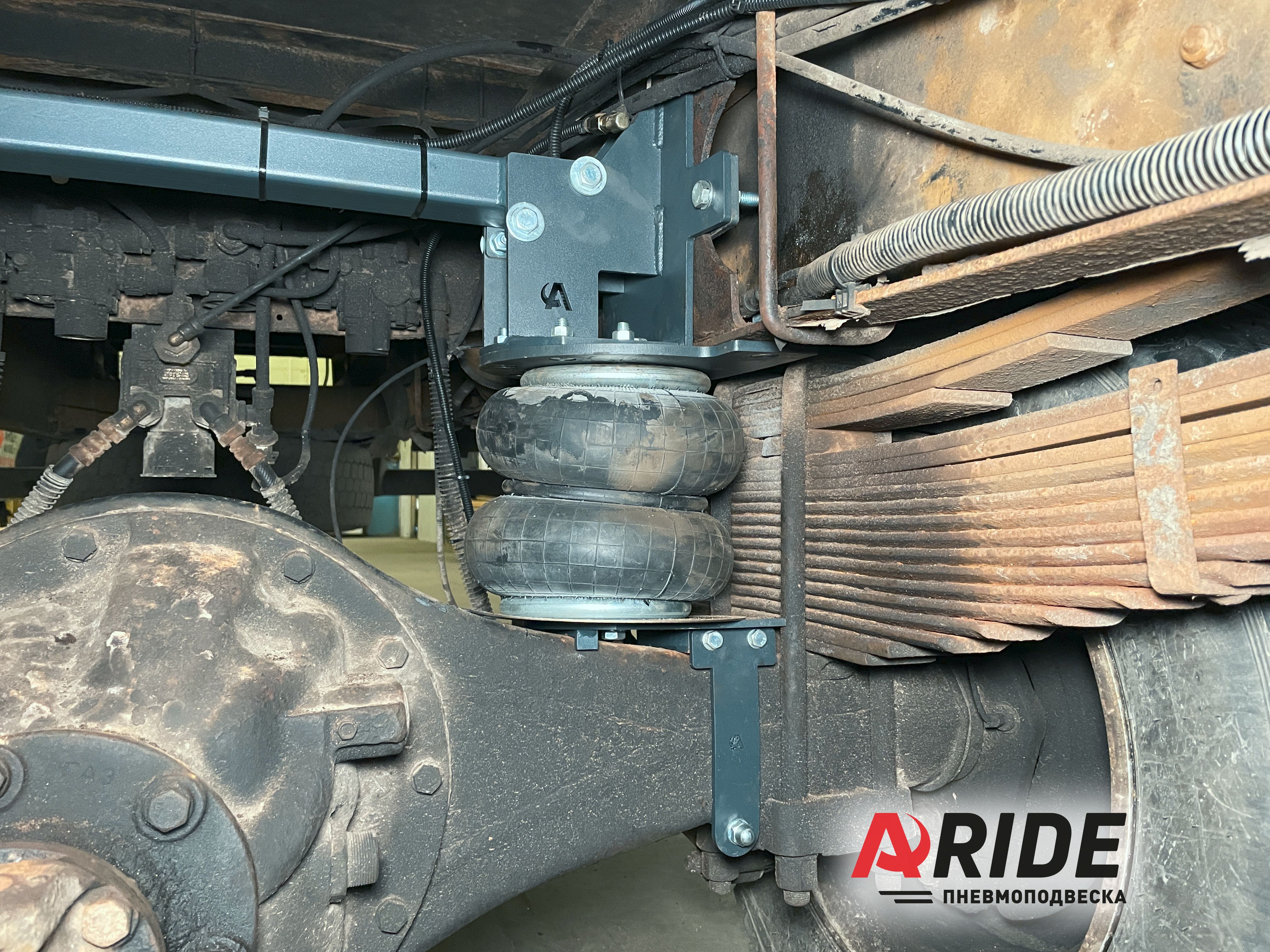 Комплект устанавливается на заднюю ось в дополнение к рессорам, для того чтобы разгрузить их и защитить от поломки. Ведь при эксплуатации данного автомобиля без вспомогательной пневмоподвески, происходят частые случаи поломки рессор, и не только из-за перегруза. Комплект сконструирован так, что бы при максимальном давлении в подушках, можно было компенсировать до 4000 килограмм нагрузки с задней оси. Комплект устанавливается на раму и на мост. Верхние кронштейны закреплены на раме при помощи болтов, а так же они упираются в верхнюю и нижнюю часть рамы. Для большей жёсткости всей конструкции, в данном комплекте применяется поперечный усилитель. Нижние кронштейны устанавливаются на чулок моста, и притягиваются за счёт боковых обхватов.