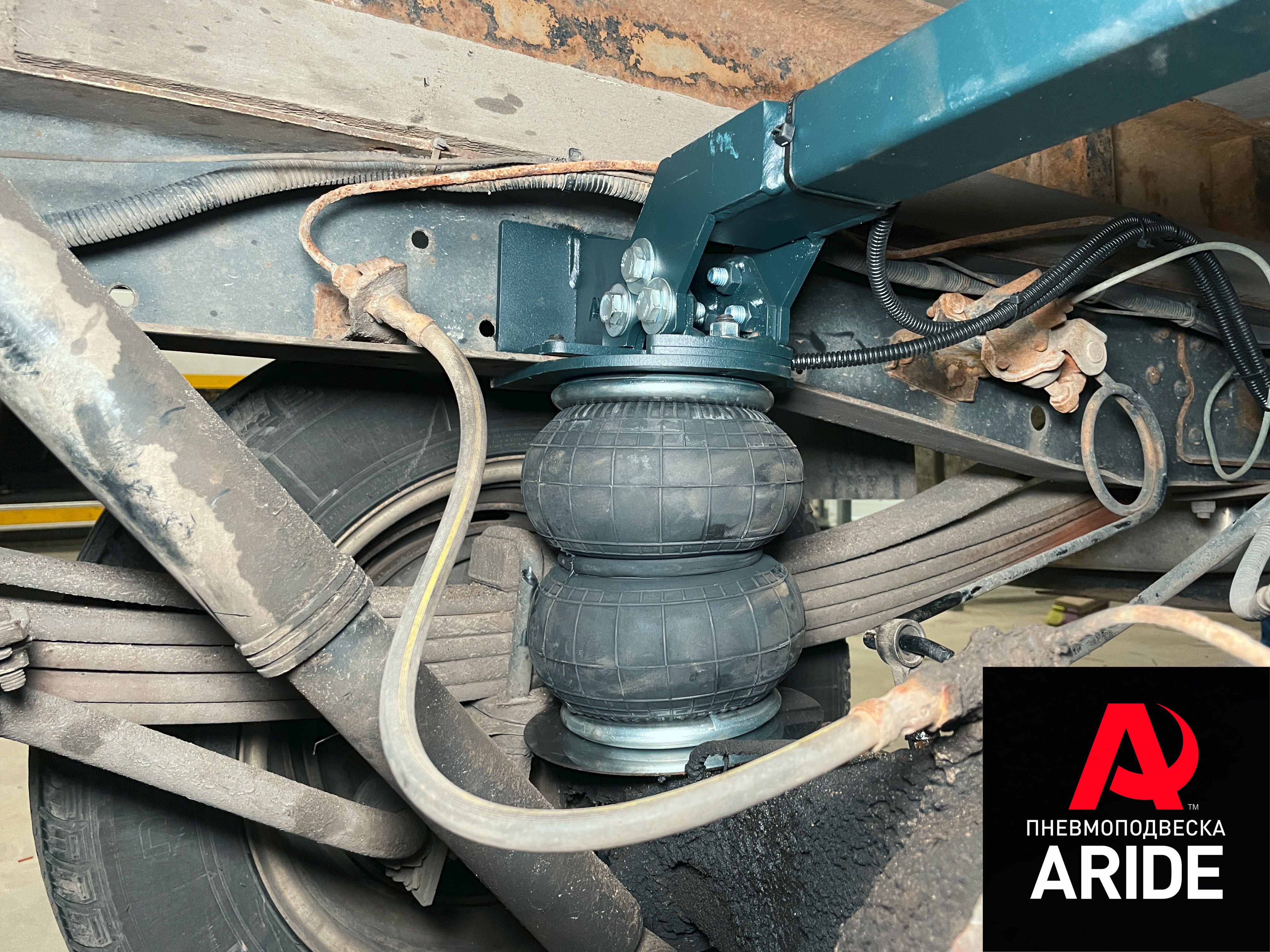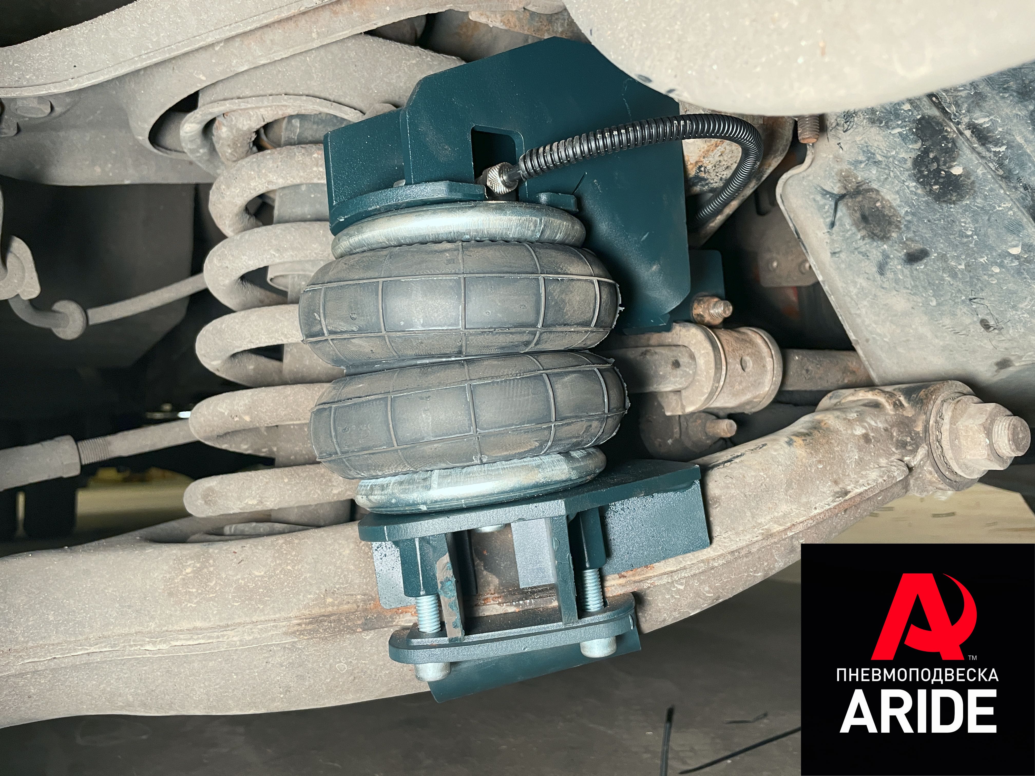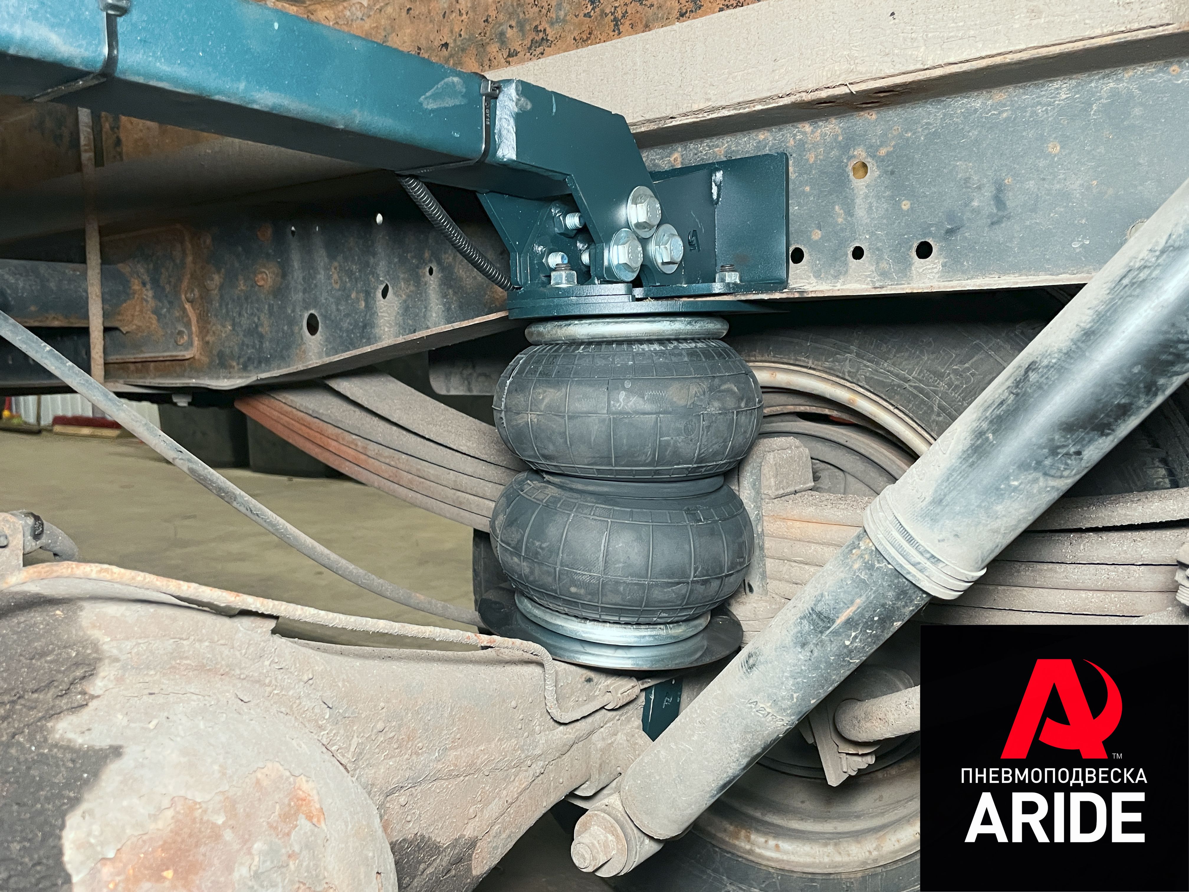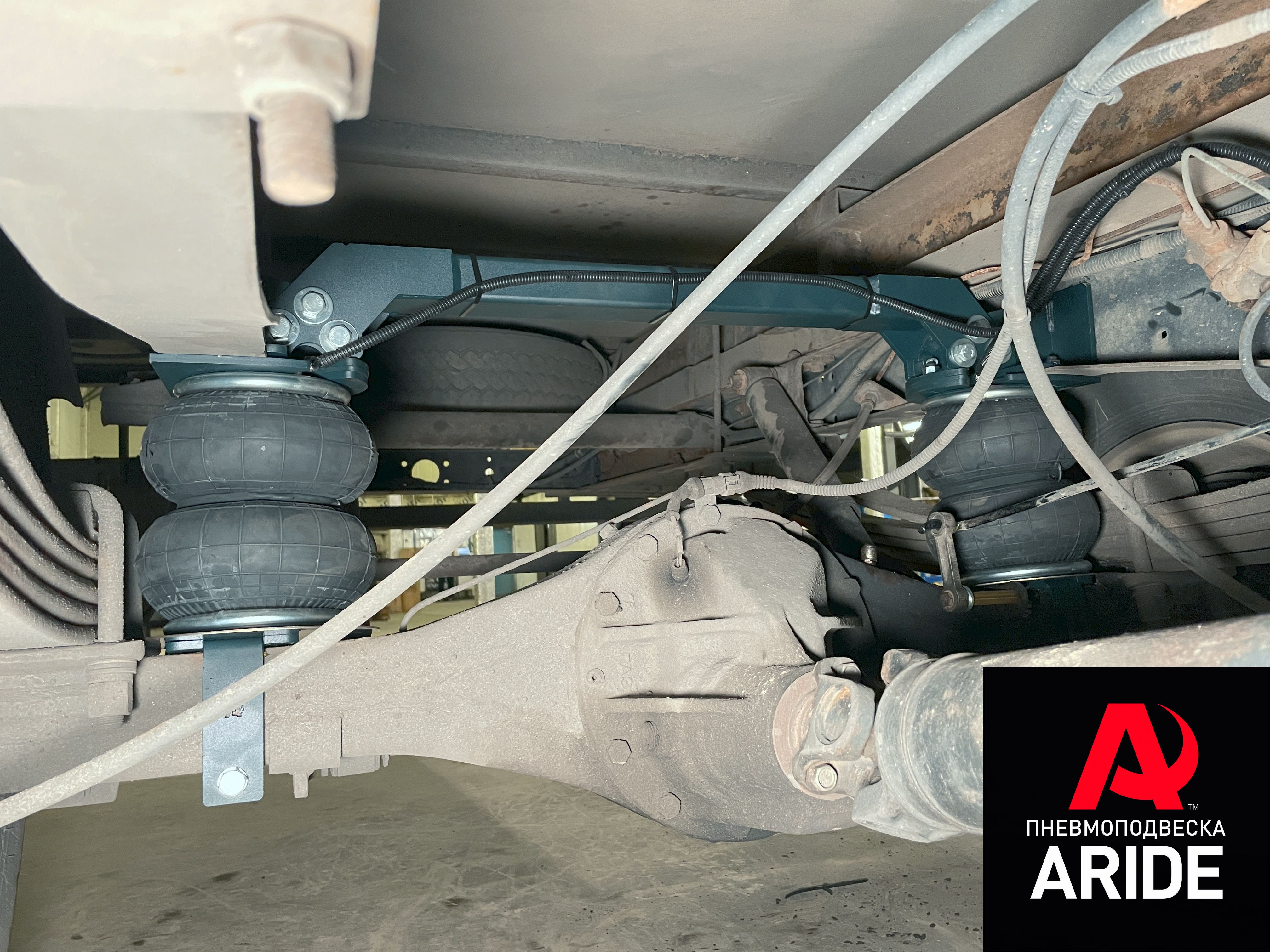 На заднюю ось были установлены пневмоподушки с артикулом 180D1, каждый из компенсирует до 1500 килограмм. Данные пневмоподушки устанавливаются так же при помощи специальных кронштейнов. Верхние кронштейны крепятся в раму, и притягиваются через отверстия для крепления отбойников. Нижние кронштейны устанавливаются на чулок моста и крепятся при помощи обхватов.