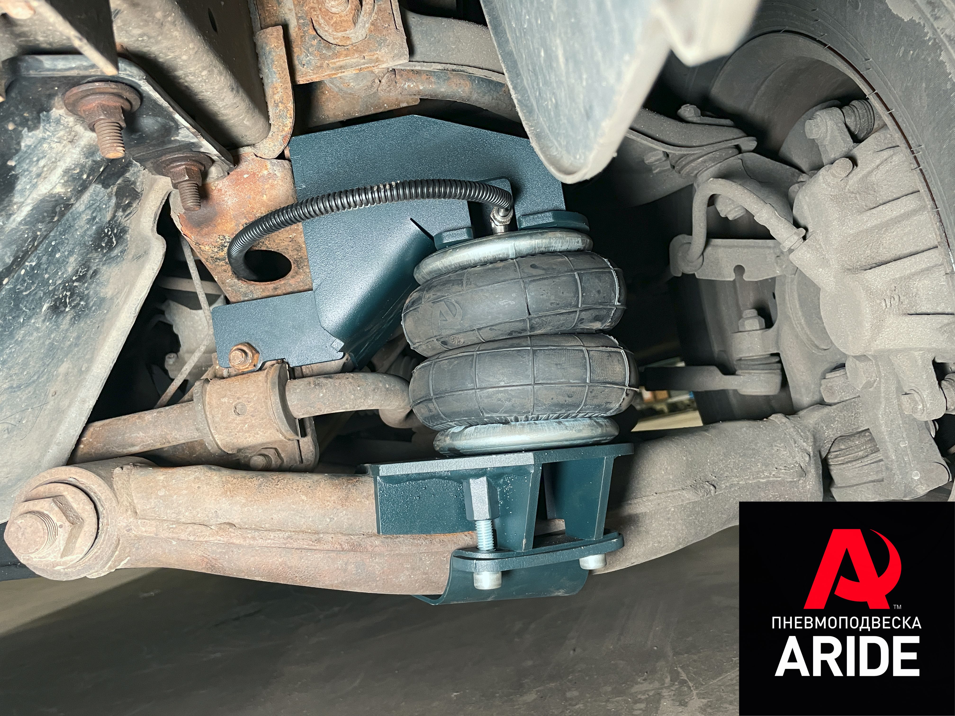 На данный автомобиль была произведена установка пневмоподушек как на переднюю ось, так и на заднюю ось. На передней оси были установлены два пневмоэлемента под артикулом 140/2. Каждый из этих пневмоэлементов способен компенсировать до 800 килограмм нагрузки. Подушки устанавливаются через специальные кронштейны. Верхние кронштейны крепятся к подрамнику через отверстия при помощи болтов М10, а так же притягиваются через шпильки крепления стабилизатора. Нижние кронштейны устанавливаются на рычаг, и притягиваются к нему при помощи обхватов. Так же нижний кронштейн защищён от смещения за счёт центрующего болта.