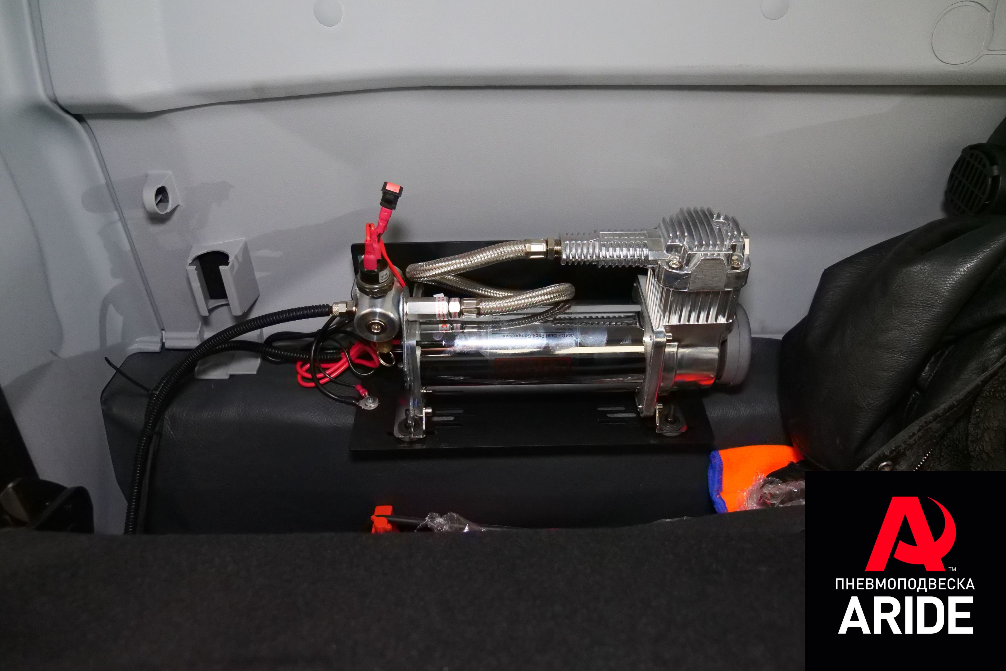 Для управления пневмоподвеской, нами была установлена 4х контурная система управления на 10 литровом ресивере и самым мощным компрессором VIAIR 444C.