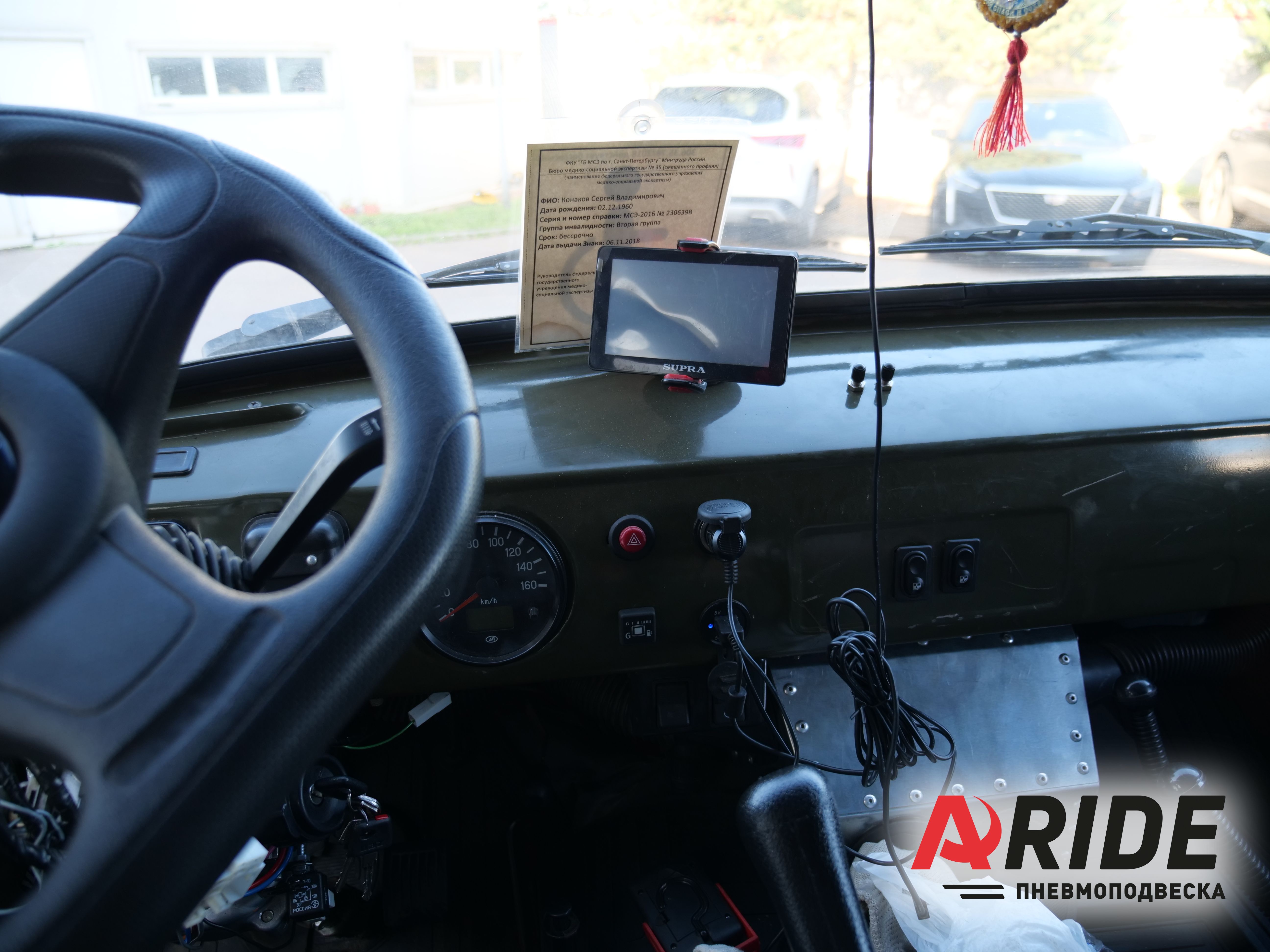 Верхние кронштейны монтируются на раму, а нижние устанавливаются на рессорный пакет. Между двумя кронштейнами устанавливаются пневматические подушки. Трубка выходящая из пневмоподушек, прокладывается вдоль рамы, и заходит в салон. По желанию клиента, ниппеля подкачки были установлены на центральную консоль.