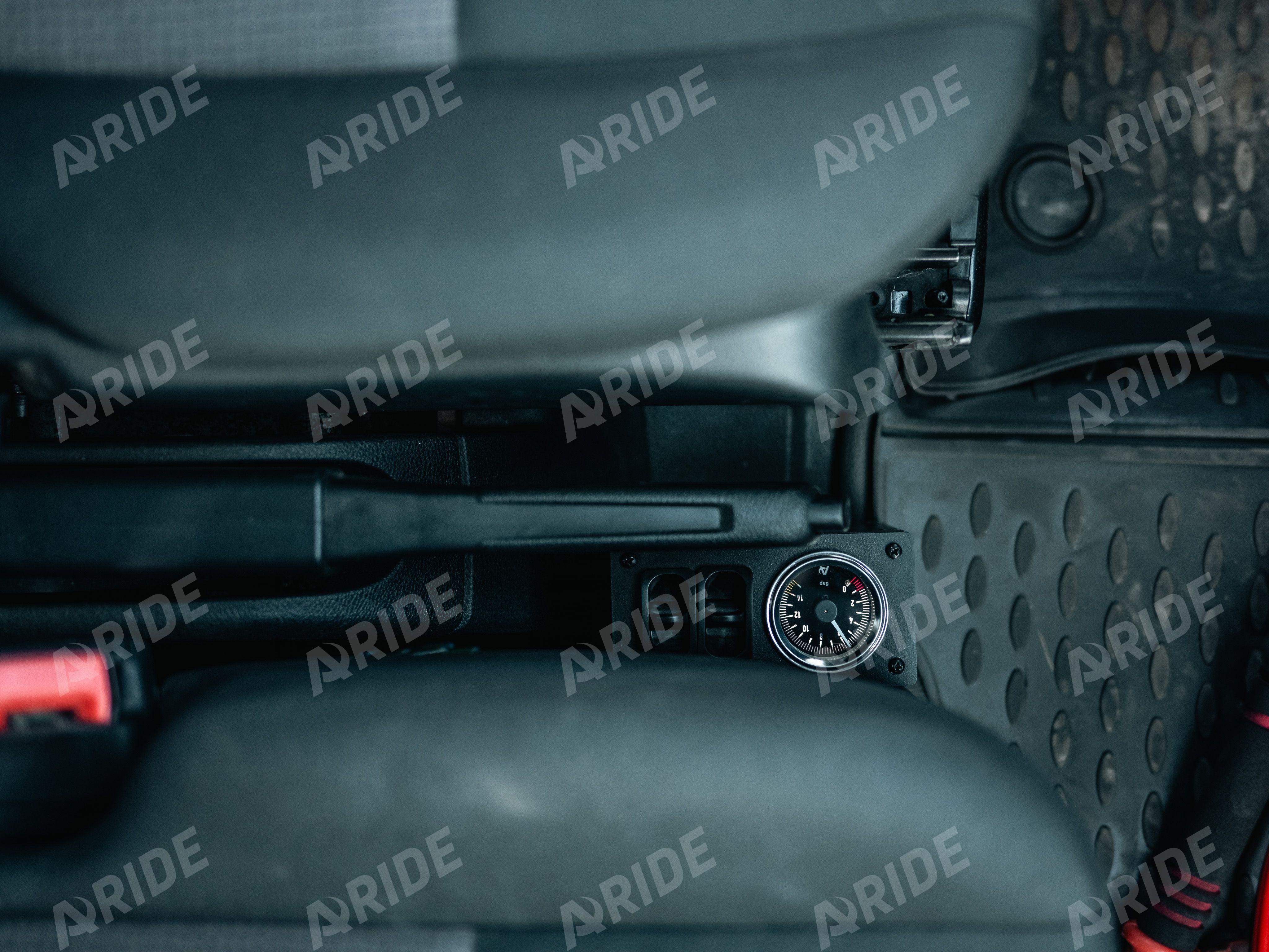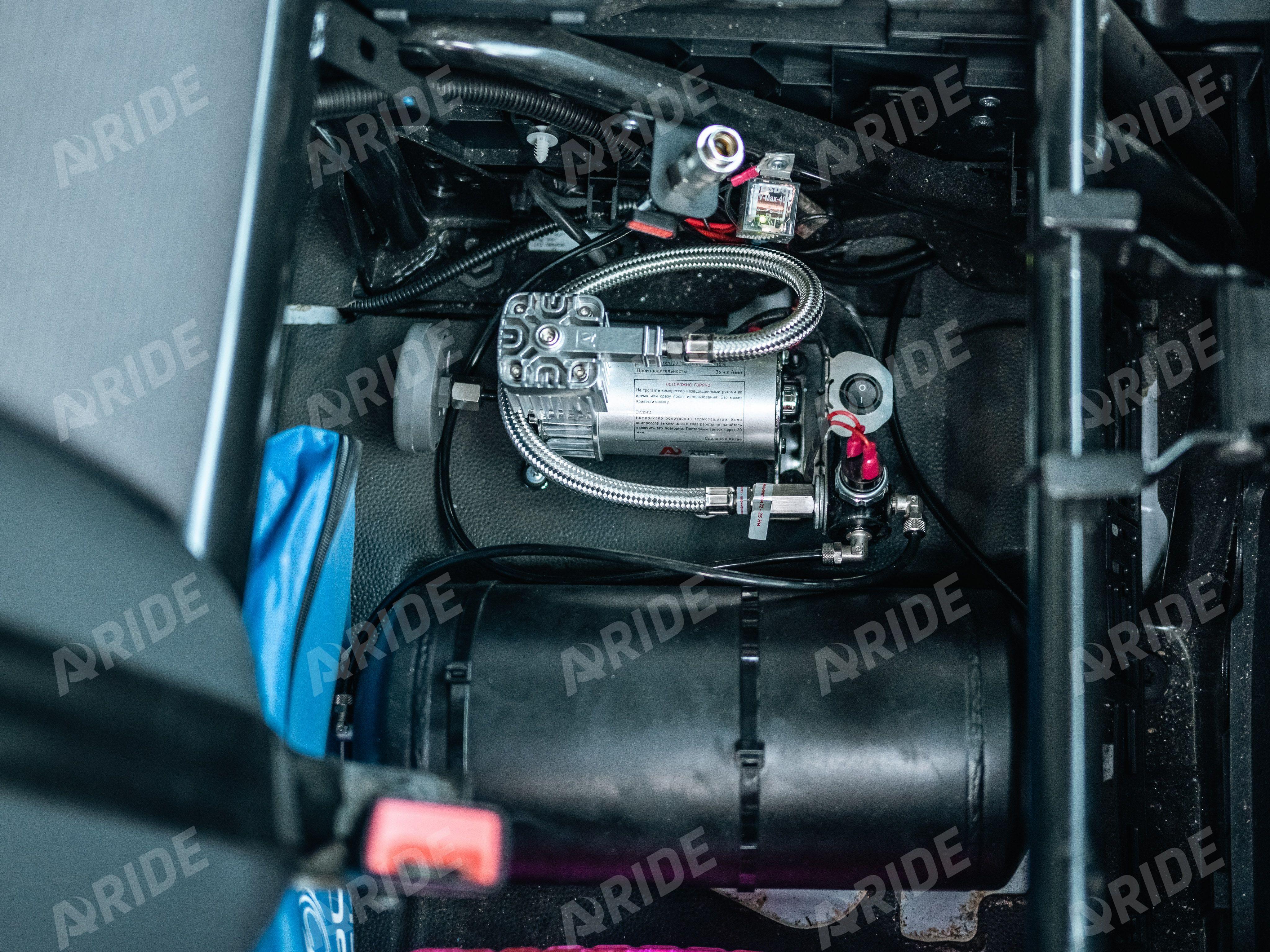 Все эти показатели возможно регулировать за счёт изменения давления в пневмоподушках. Именно для удобства регулировки, была установлена двухконтурная система управления. Она включает в себя мощный компрессор Арайд 100, ресивер на 5 литров, и информативный блок управления на два контура, с манометром и пневматическими клавишами.