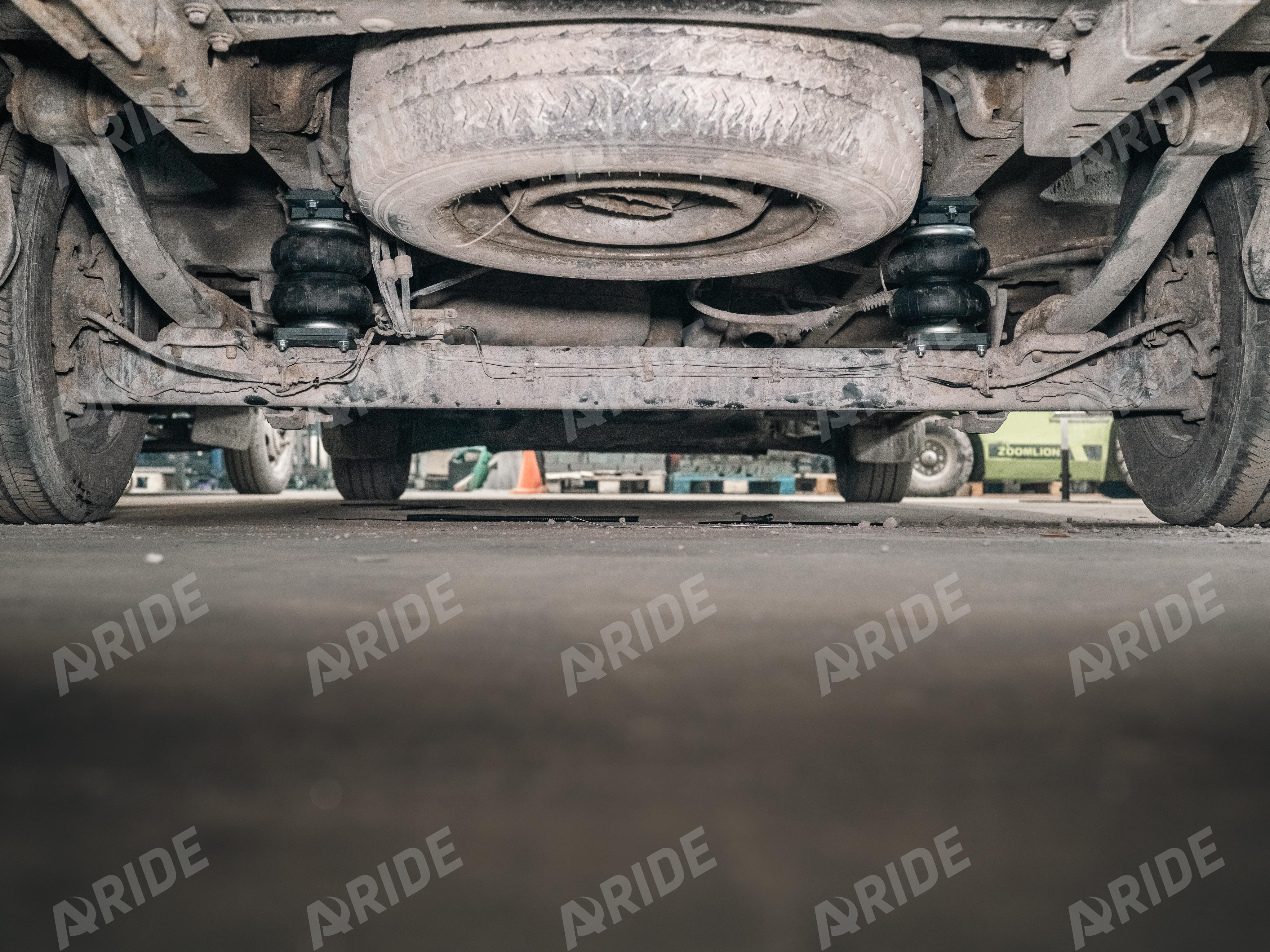 Комплект был установлен в дополнение к заводским рессорам. Монтаж пневматических подушек осуществлён при помощи специальных кронштейнов, которые изготавливаются под данное поколение автомобилей Форд Транзит. Кронштейны крепятся к интегрированной раме, через заводское крепление для отбойника, нижняя же часть устанавливается на балку, и кронштейны притягиваются к балке через заводской подпятник.