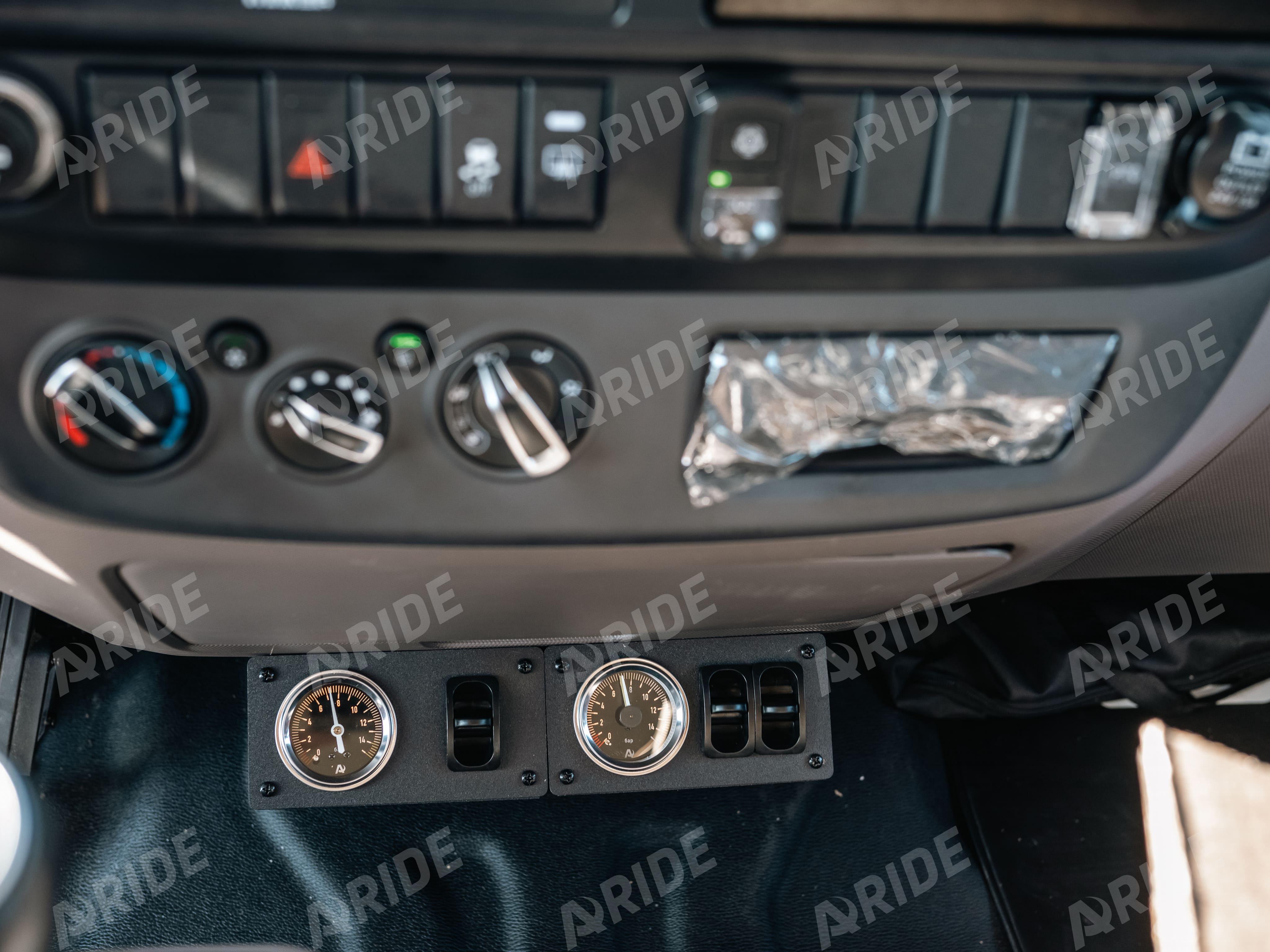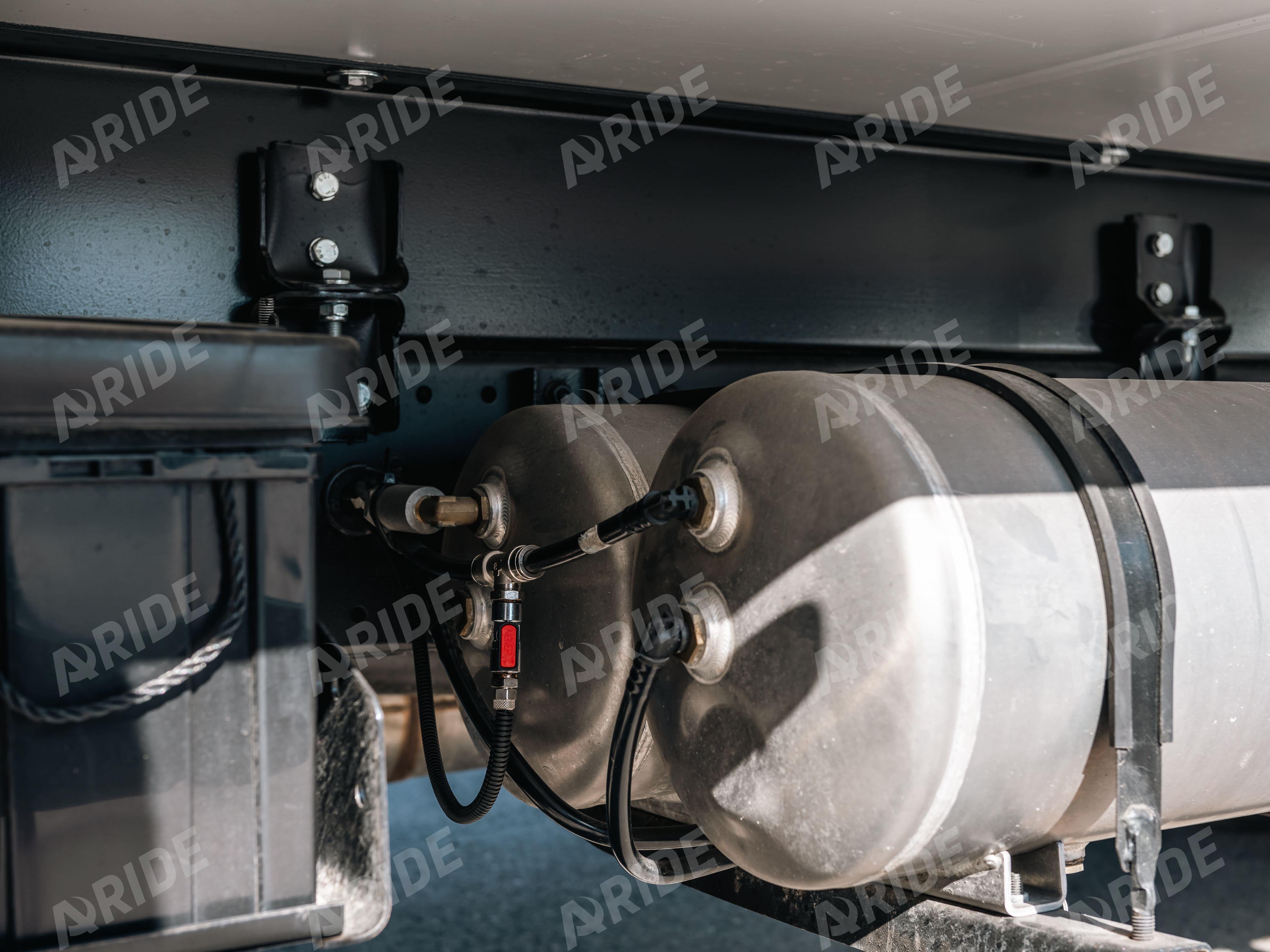 Машина совершенно новая, но клиент заранее позаботился о целостности рессор и установил два комплекта вспомогательной пневмоподвески. Оба комплект устанавливаются в дополнение к рессорному пакету, тем самым работают совместно с заводскими рессорами. Пневматические подушки берут на себя часть нагрузки, тем самым разгружая рессоры.