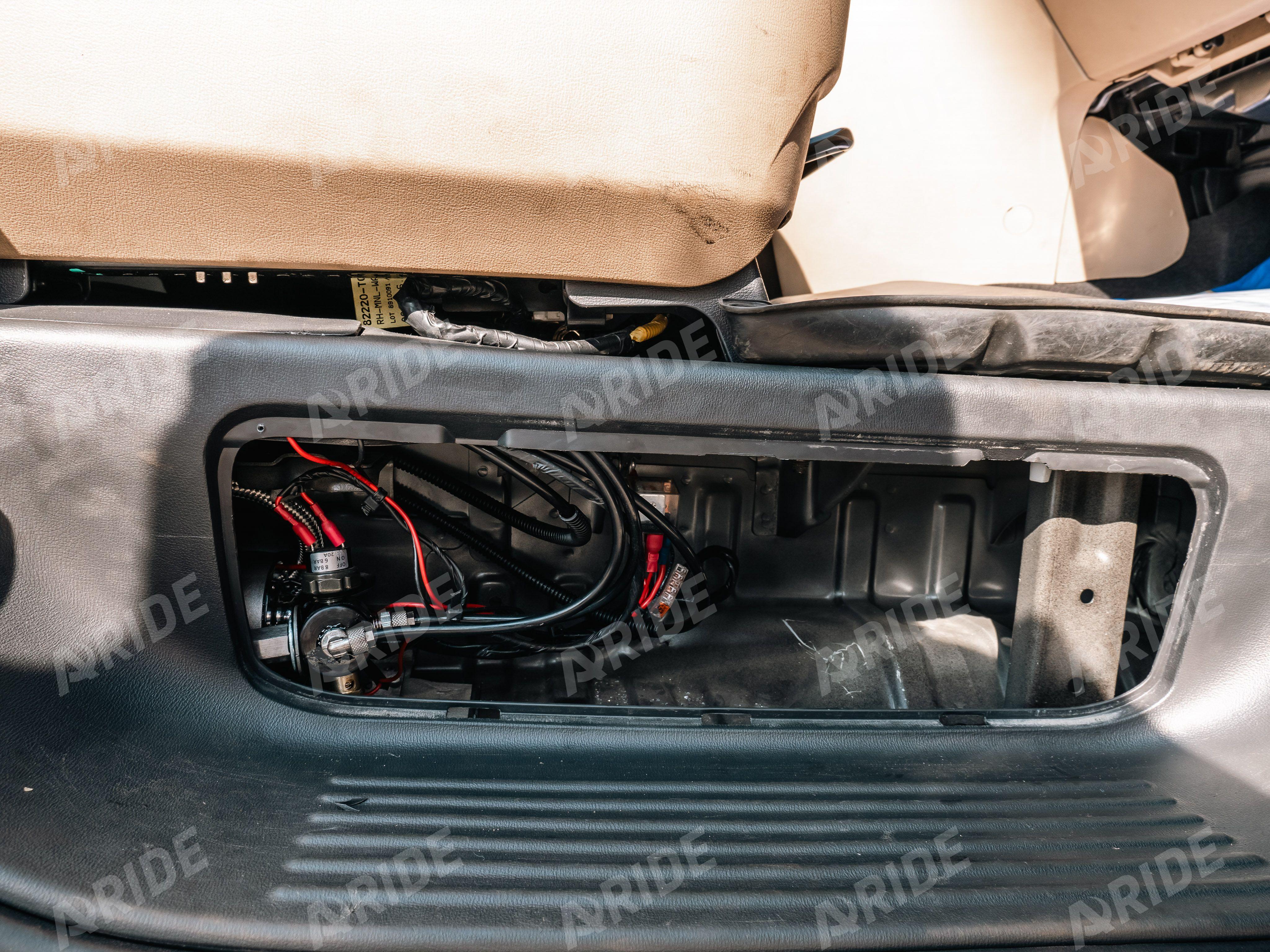 Давление регулируется при помощи установленной системы управления с электрическим компрессором. Сам компрессор установлен в пассажирскую подножку. Блок управления разместился между водительским и пассажирским сидением, для дальнейшего его перемещения в будущий подлокотник.