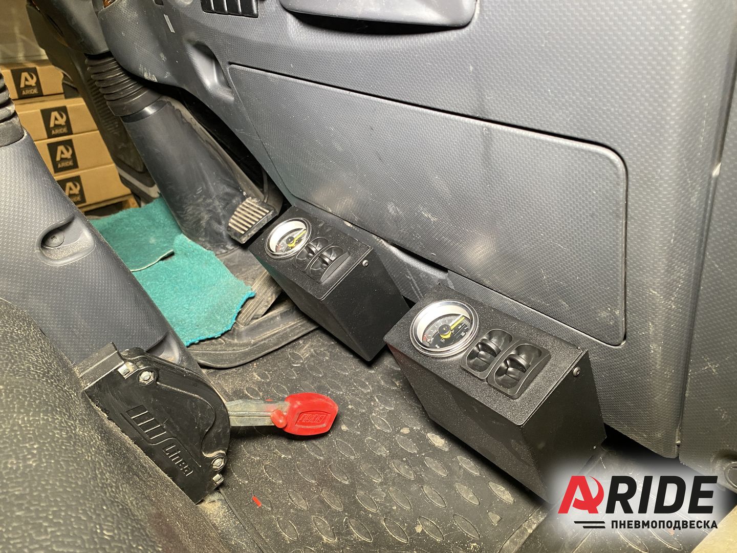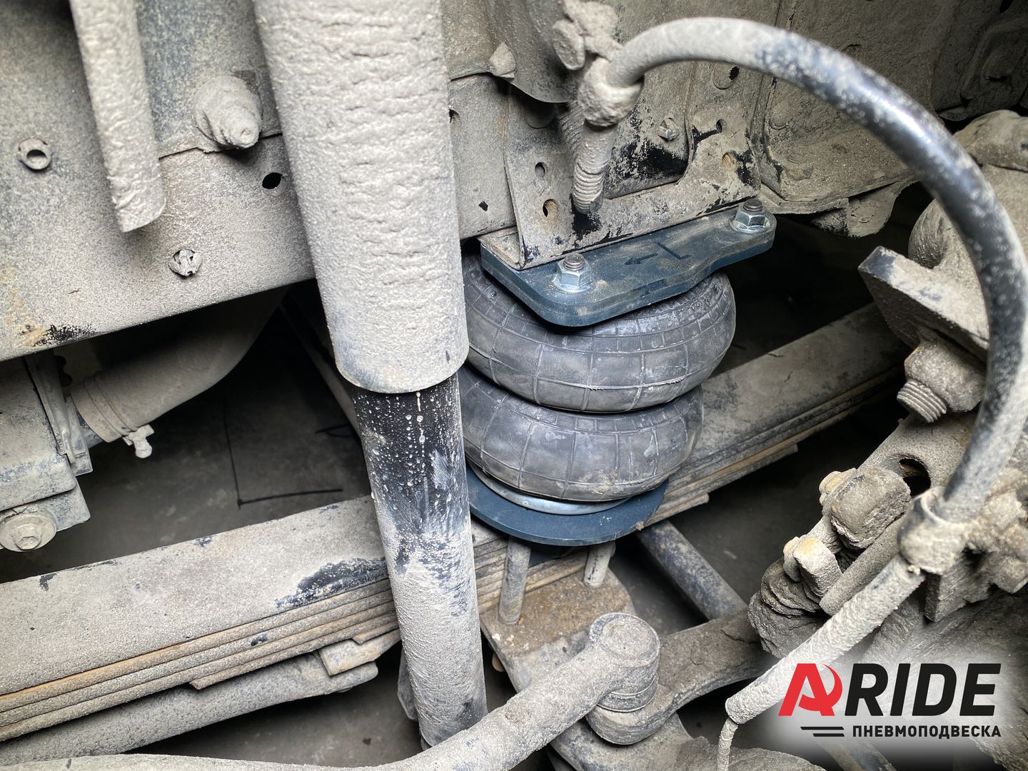 На данный автомобиль был установлен комплект на переднюю ось и на заднюю ось, а так же две двухконтурные системы управления для регулировки давления. Ключевым фактором для установки подушек стало то, что рессоры не справляются с нагрузкой. Автомобиль перевозит грузы, вес которых зачастую близок к 5 тоннам. А так же машина оборудована гидравлической установкой, вес которой равен 1500 килограмм. В силу этих обстоятельств вес приходится не только на задний пакет рессор, а так же и на передний.