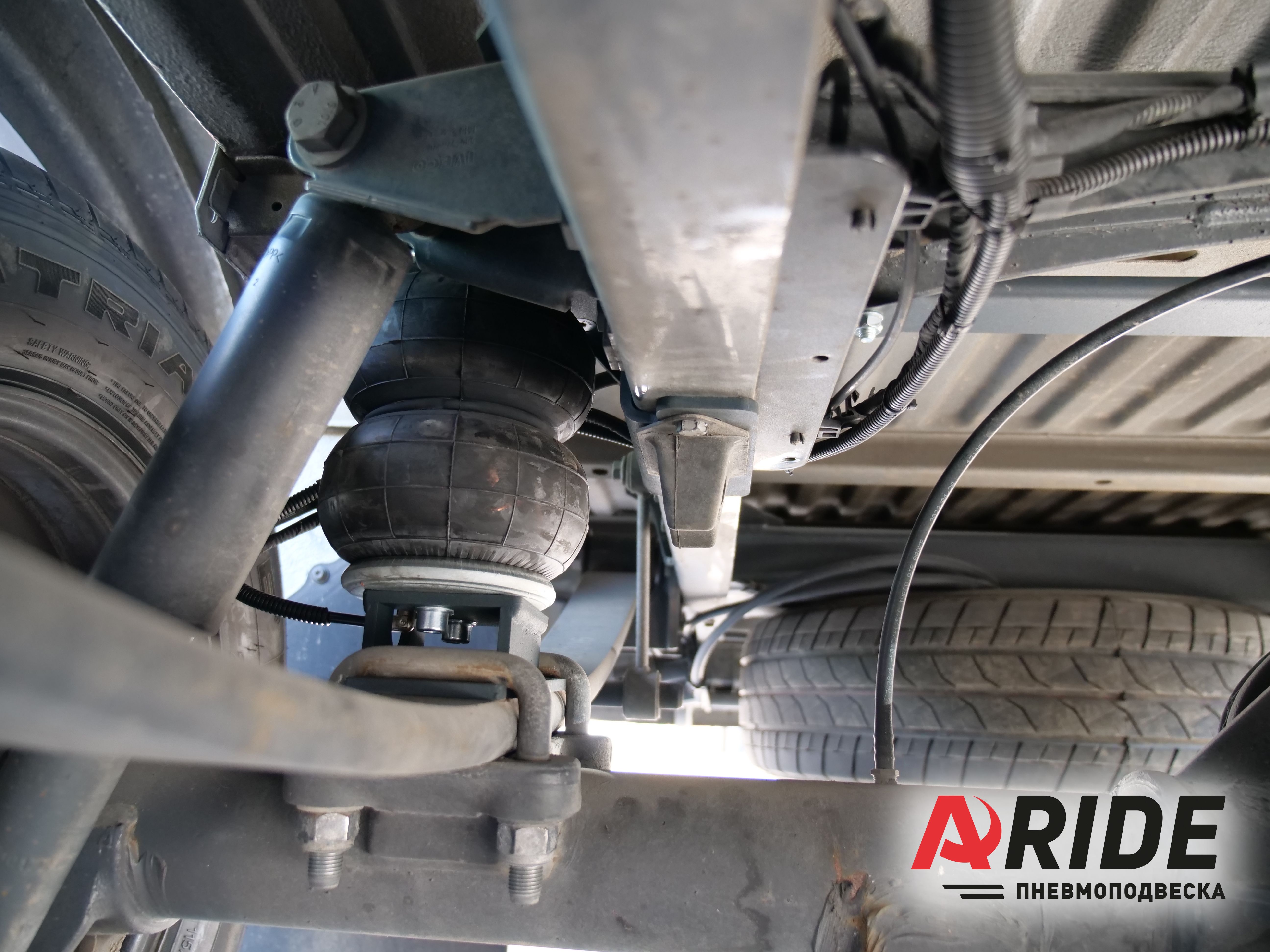 Чтобы не увеличивать количество листов рессор, но улучшить показатели по грузоподъёмности, было принято решение по установке вспомогательной пневматической подвески. Комплект пневматической подвески состоит из установочных кронштейнов, изготовленных специально под данную модель марки Iveco, а так же пневматических подушек, которые крепятся к кронштейнам. Кронштейны крепятся к интегрированной раме, а так же притягиваются к рессоре при помощи стремянных болтов.