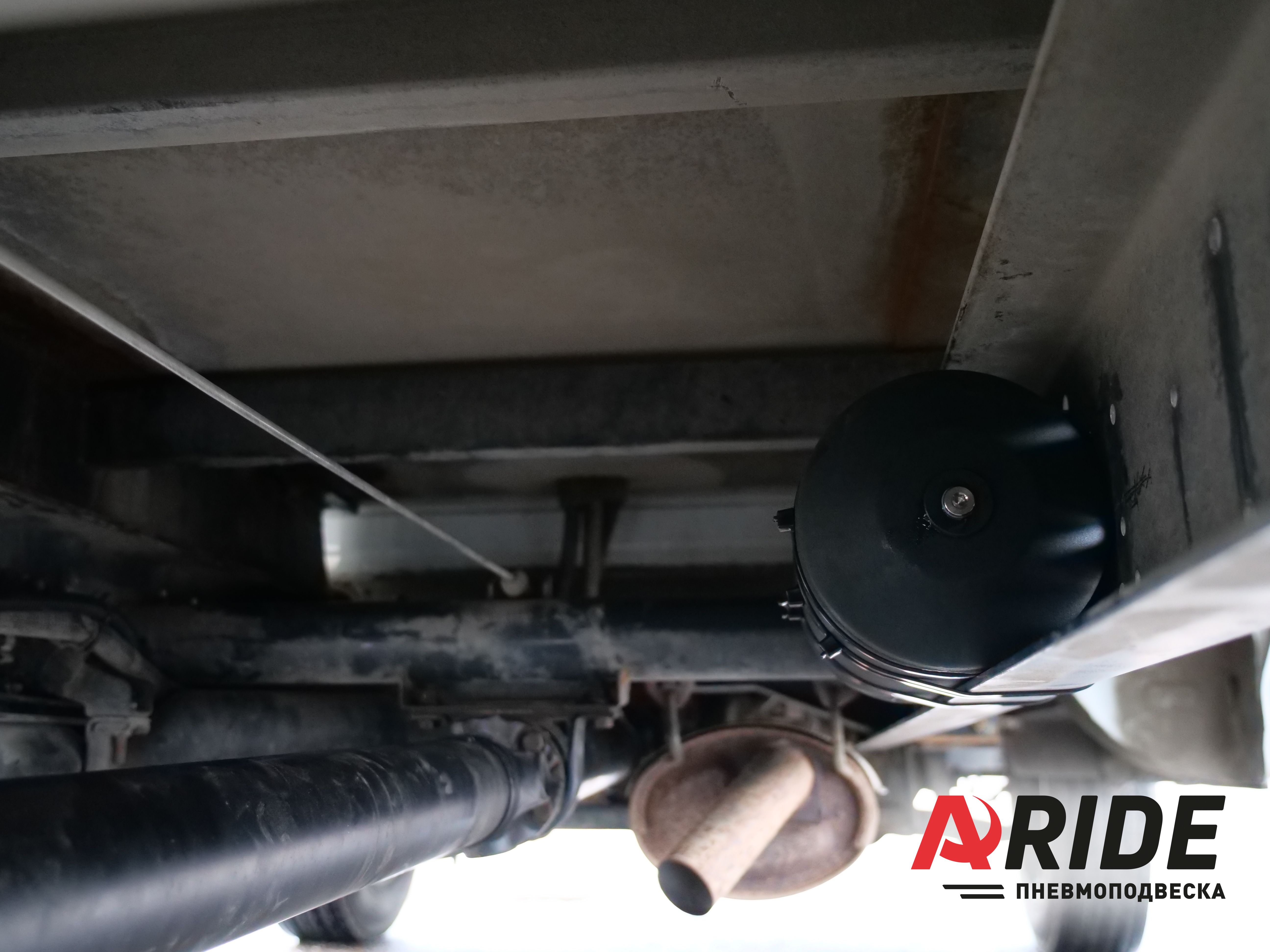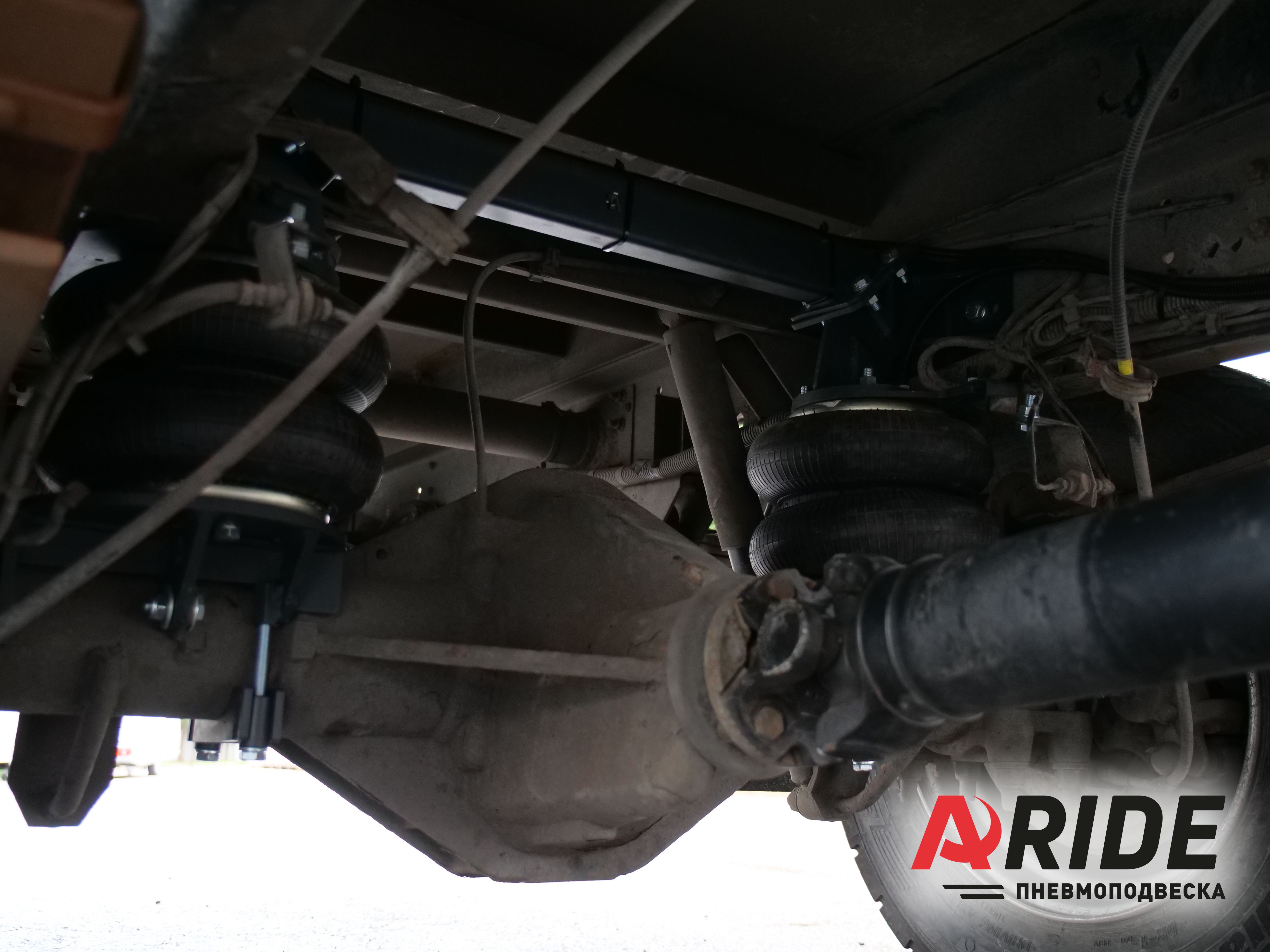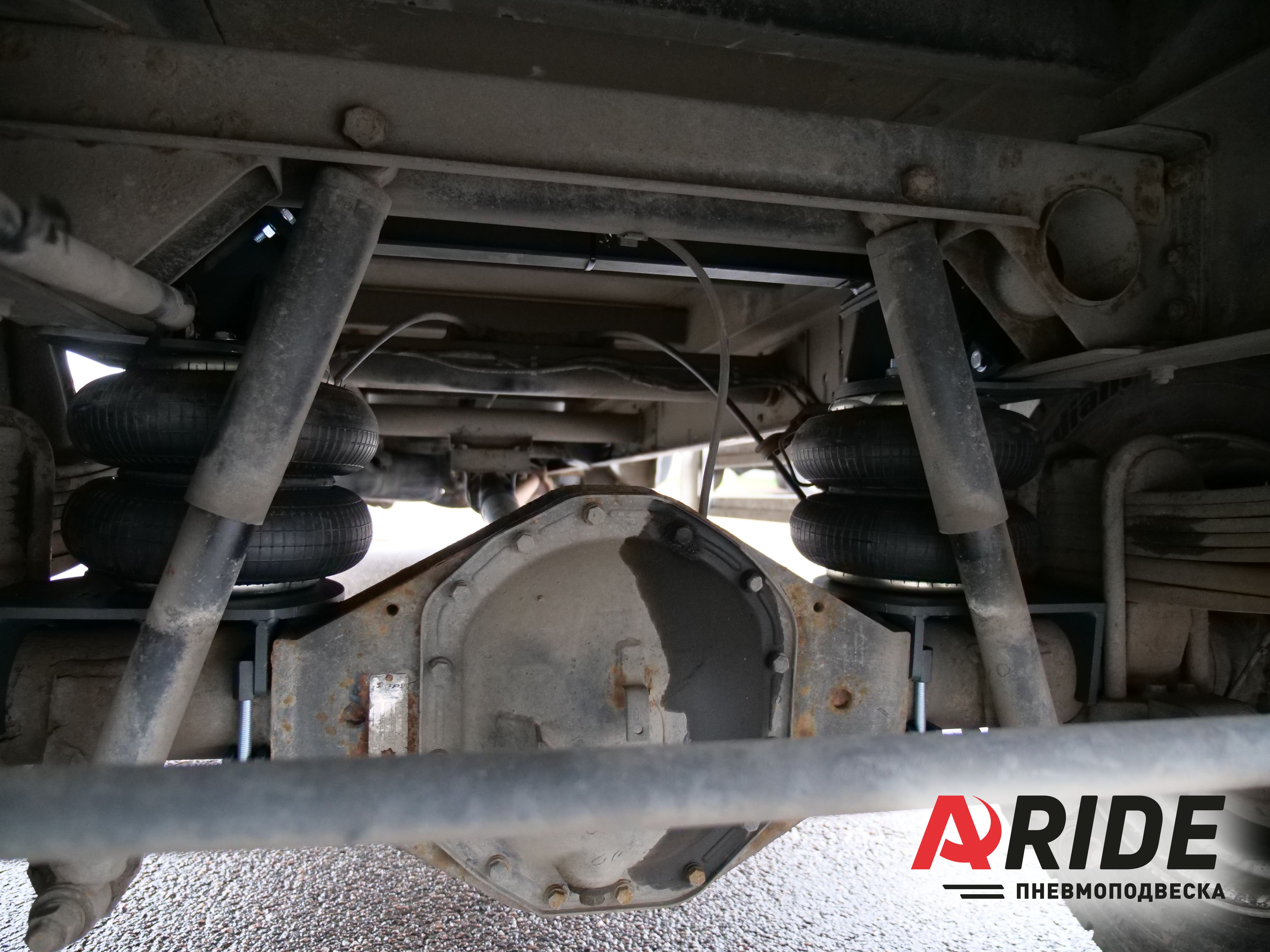 Комплект был установлен на заднюю ось. В нём используются пневматические подушки 250/2, которые в паре способны компенсировать до 4000 килограмм нагрузки с заднего рессорного пакета. Для того что бы обеспечить высокую прочность и надёжность всей конструкции, кронштейны выполняются из стали, толщиной 6 и 8 миллиметров. Верхние кронштейны крепятся к раме, и притягиваются через заводские отверстия в ней.