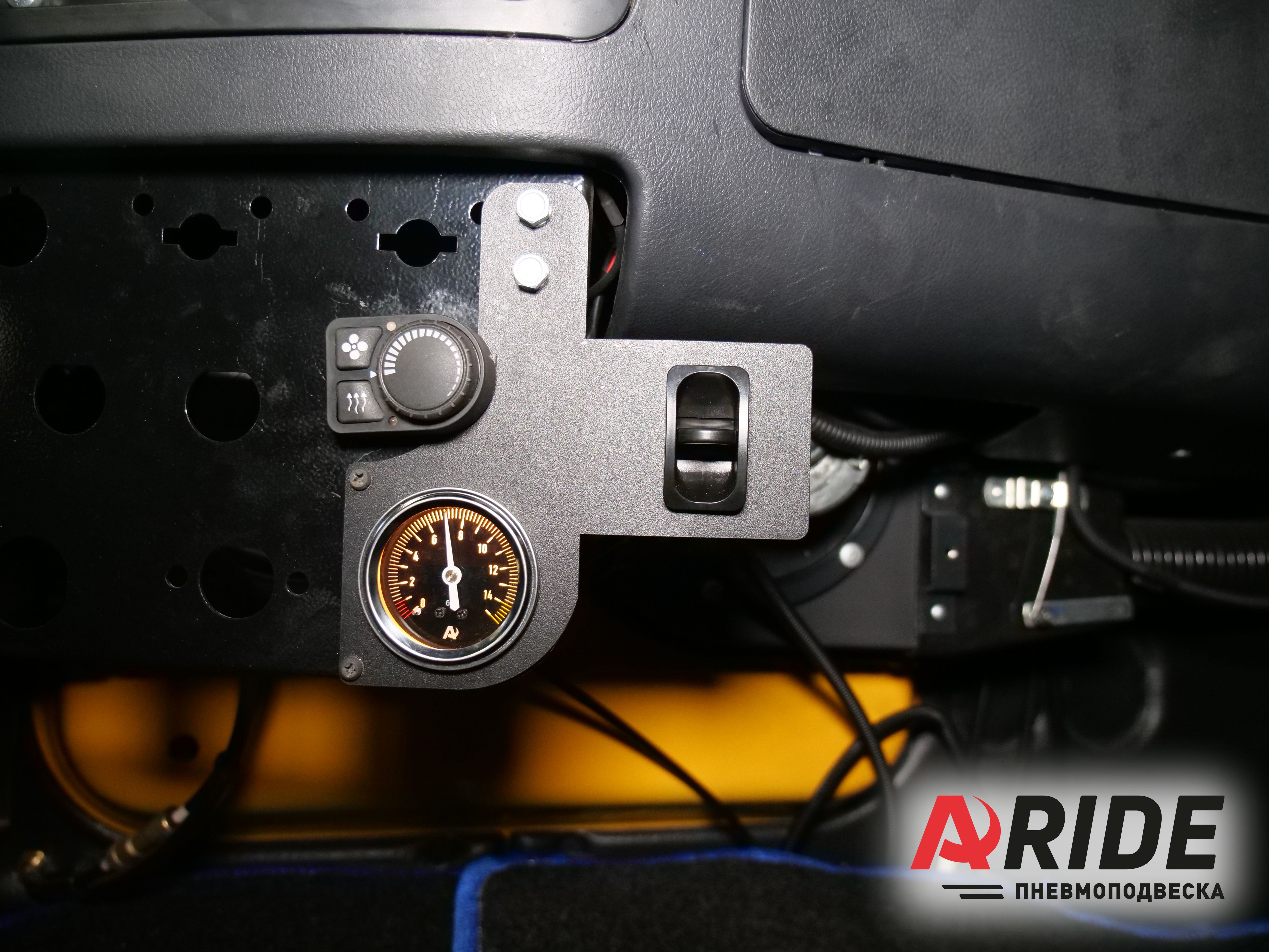Установка манометра и пневматической клавиши была произведена на центральную консоль, при помощи специальной панельки для автомобилей семейства КАМАЗ.