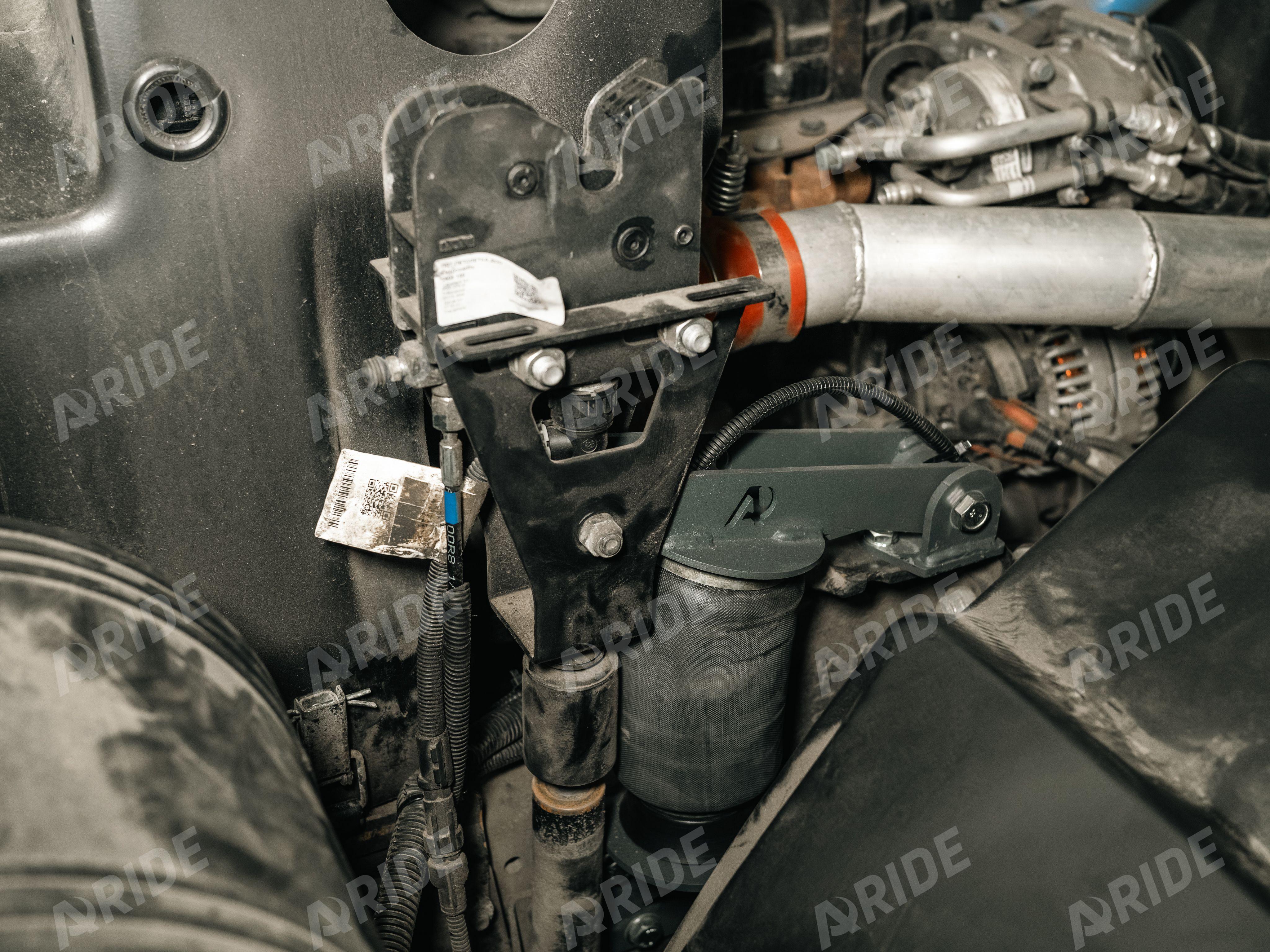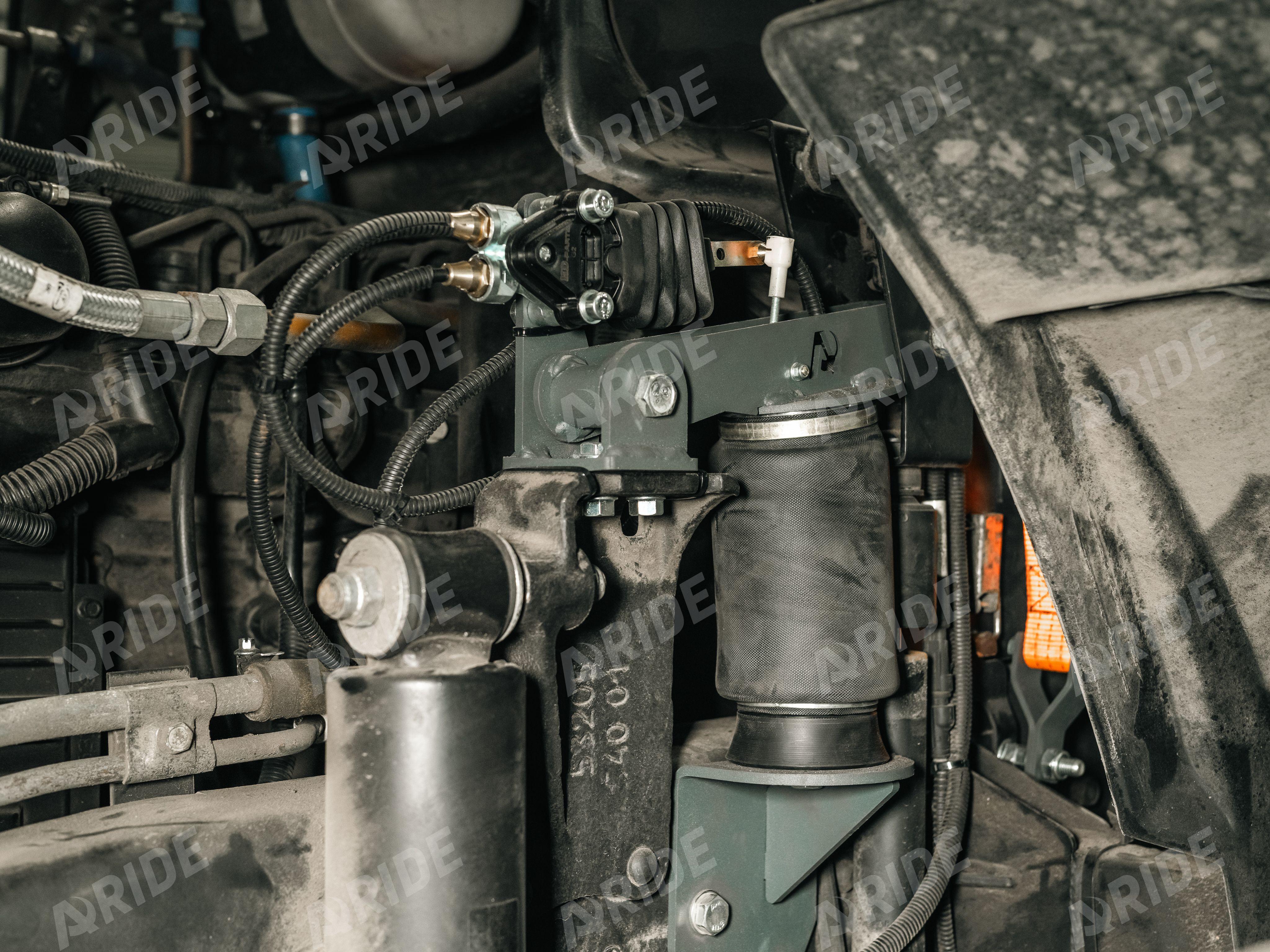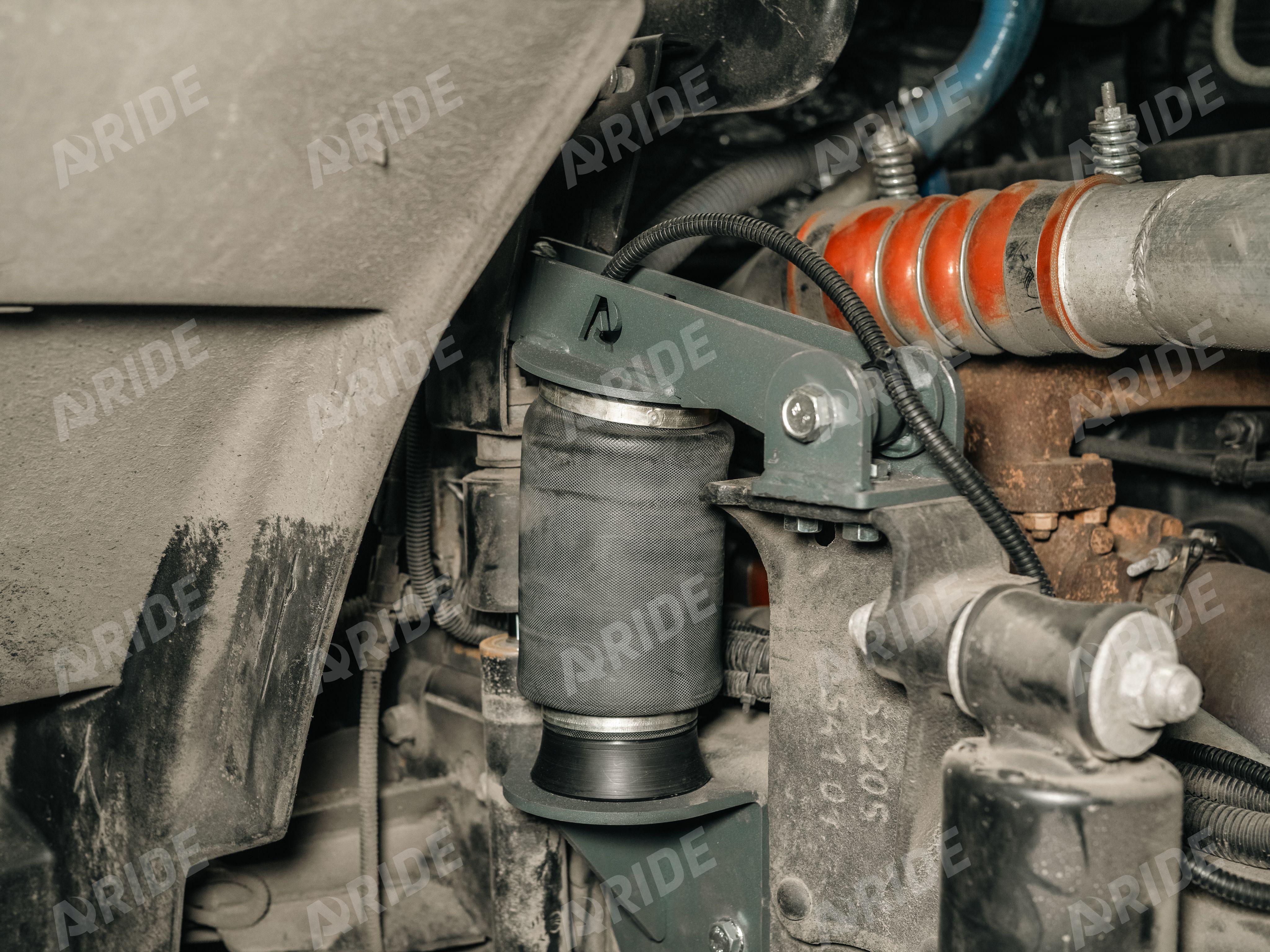 Для установки пневматических подушек, необходимо демонтировать заводские рессоры под кабиной. Комплект пневмоподвески с одной стороны крепится к раме и заводскому креплению основного амортизатора, а с другой стороны крепится к замку кабины, который расположен над амортизатором кабины автомобиля. При таком расположении пневматической подушки, удаётся добиться должного комфорта, которого так не хватает при эксплуатации автомобиля с заводским рессорным пакетом. Данный комплект оборудован краном уровня пола, который при любой загрузке обеспечивает правильное (комфортабельное) расположение и уровень кабины, относительно рамы и дорожного полотна. Воздух к пневматическим подушкам подводится от штатного ресивера, который расположен на раме, в левой части автомобиля.