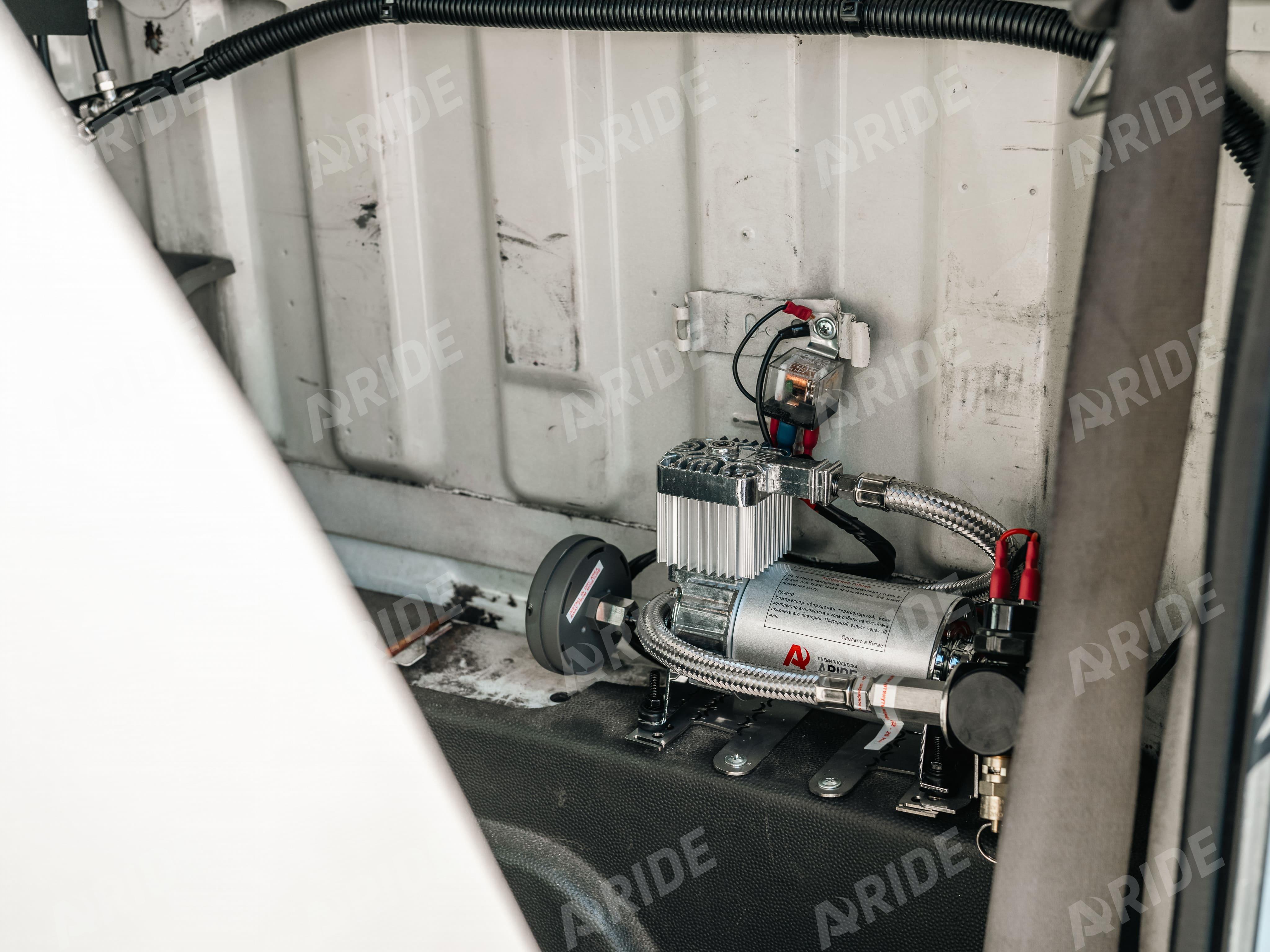 Для регулировки давления в пневматических подушках, была установлена двухконтурная система управления. Опять же из-за ограниченного пространства, но в данном случае уже в кабине, компрессор был расположен за спинкой водительского сидения. Блок управления был установлен между водительской и пассажирской спинкой.