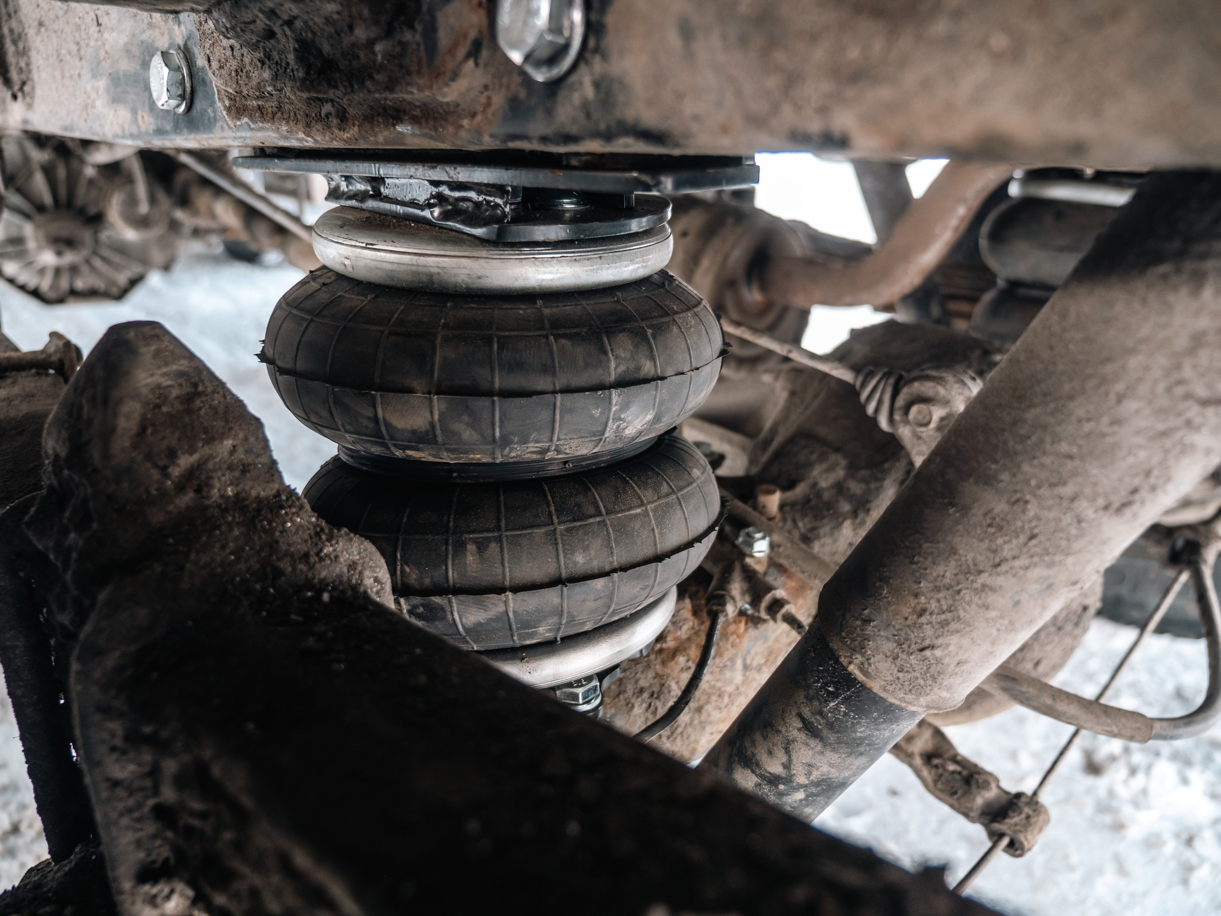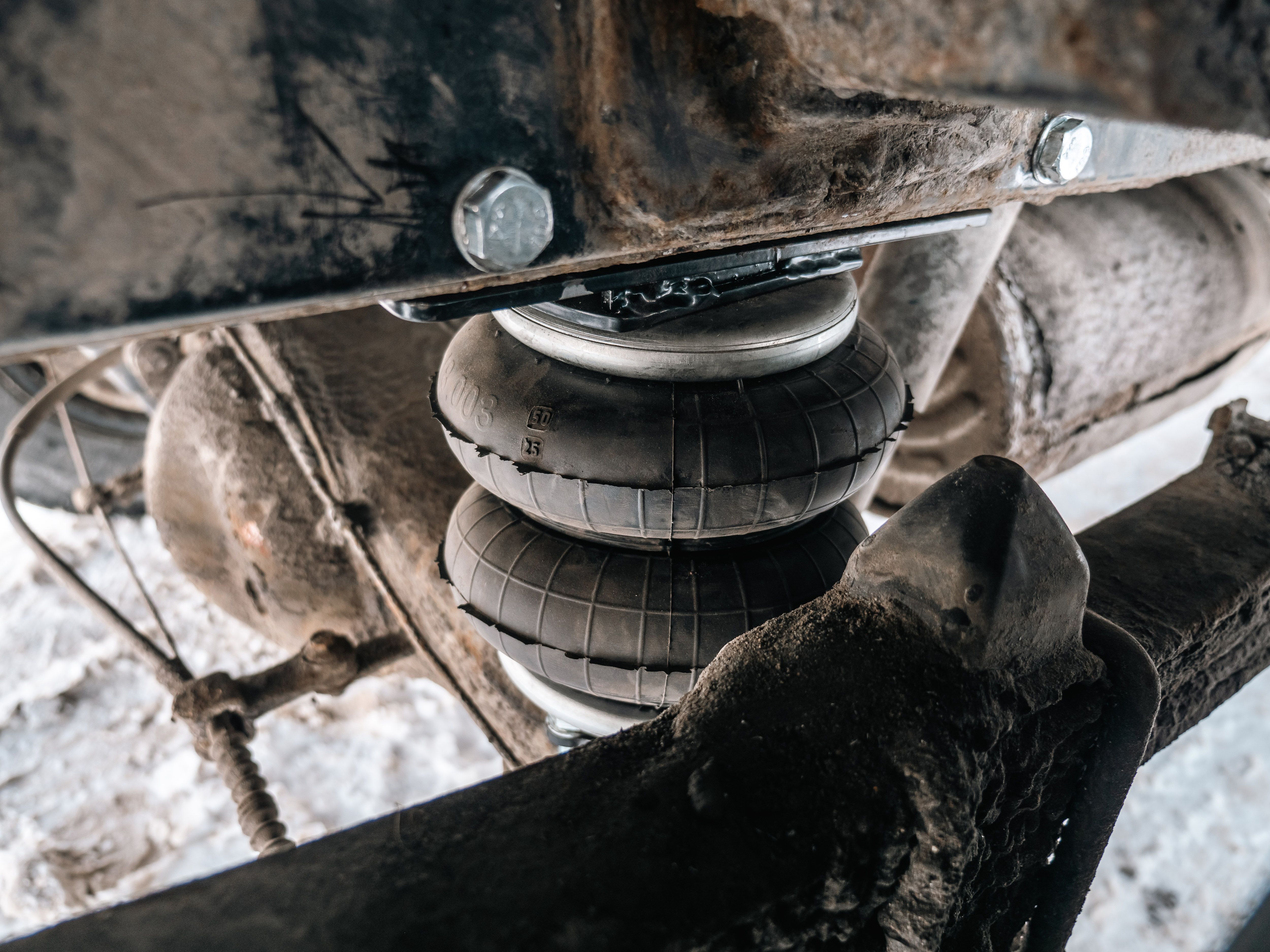 Пневмоподушки были установлены в дополнение к заводским рессорам. Нижние кронштейны "садятся" на мост, а верхние упираются в раму. Пневмоподушки являются дополнительной - третьей точкой опоры. Они работают совместно с заводским рессорным пакетом. Тем самым они снимают часть нагрузки с рессор и защищают их от износа.