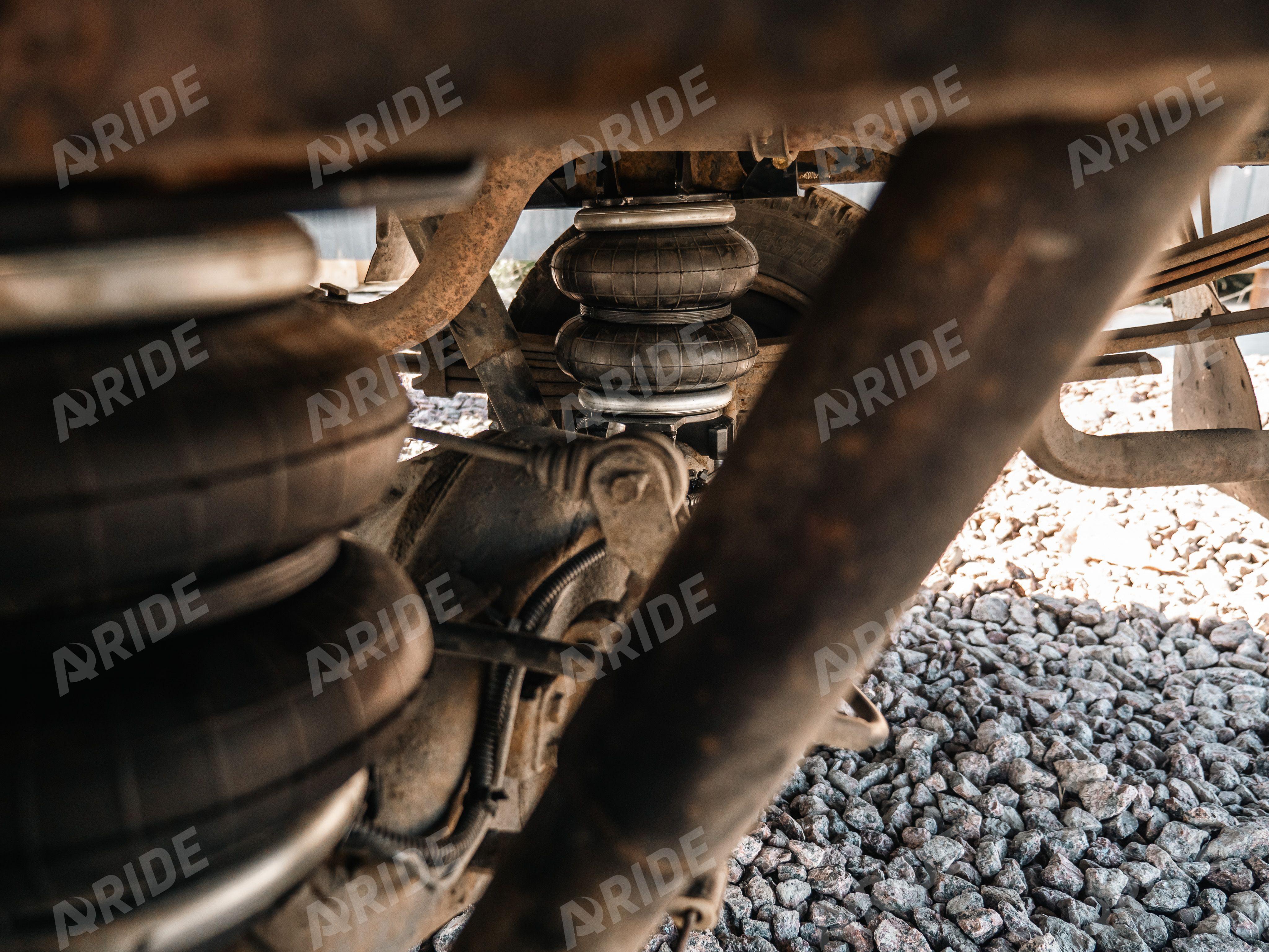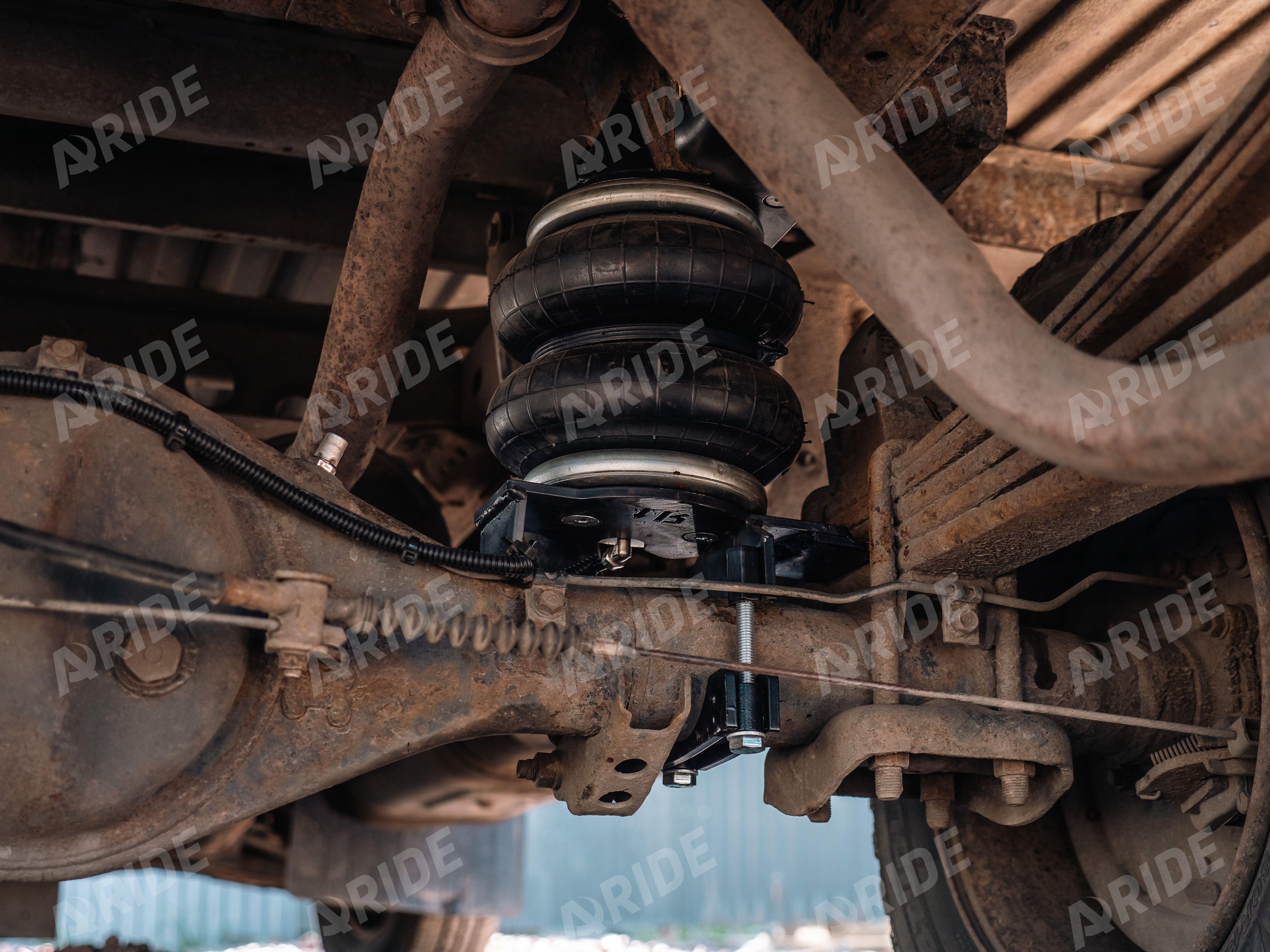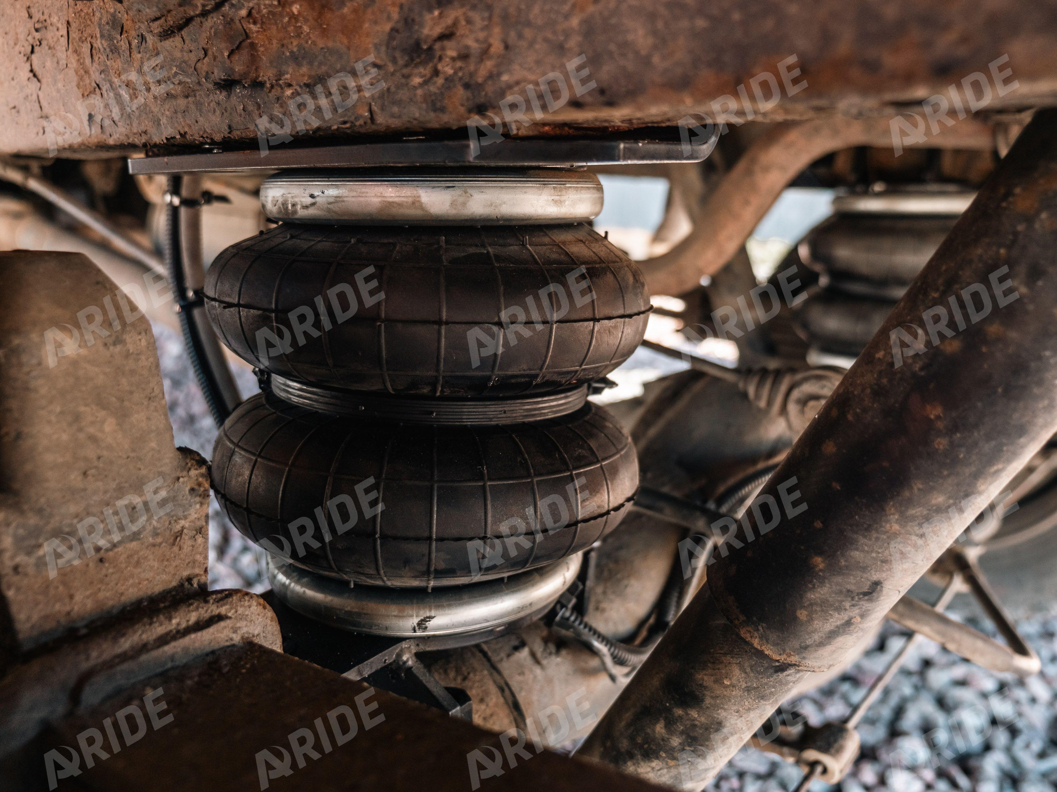 Нашими конструкторами был разработан комплект на заднюю ось, в дополнение к заводским рессорам. Пневмоподушки монтируются между рамой и мостом. Такой стандартный конструктив позволяет равномерно распределить нагрузку между рессорами и пневматическими подушками. Грузоподъёмность каждого пневмоэлемента - 2000кг при давлении в нём - 8 бар.