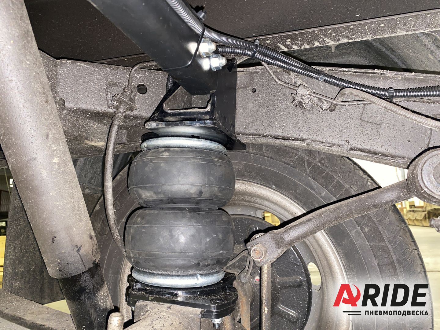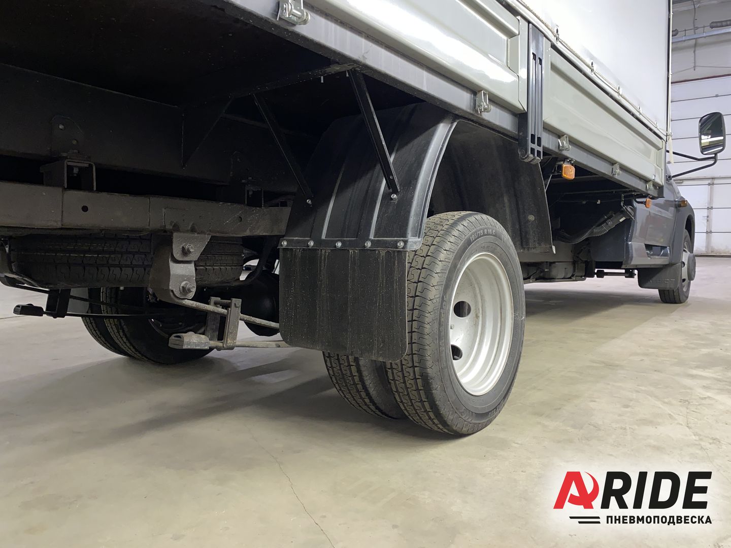 Установка вспомогательной пневмоподвески на автомобиль УАЗ Profi Полуторка. Автомобиль имеет двухскатную ошиновку. С завода автомобиль оснащён двухлистовым пакетом рессор. Полная разрешённая масса данного автомобиля не должна превышать 3500 килограмм. При вместимости кузова более 10 кубических метров, и грузоподъёмности примерно равно 1000 килограмм, заводской пакет рессор быстро придёт в негодность. Для того чтобы защитить пакет рессор от износа, на заднюю ось был установлен комплект вспомогательной пневмоподвески.