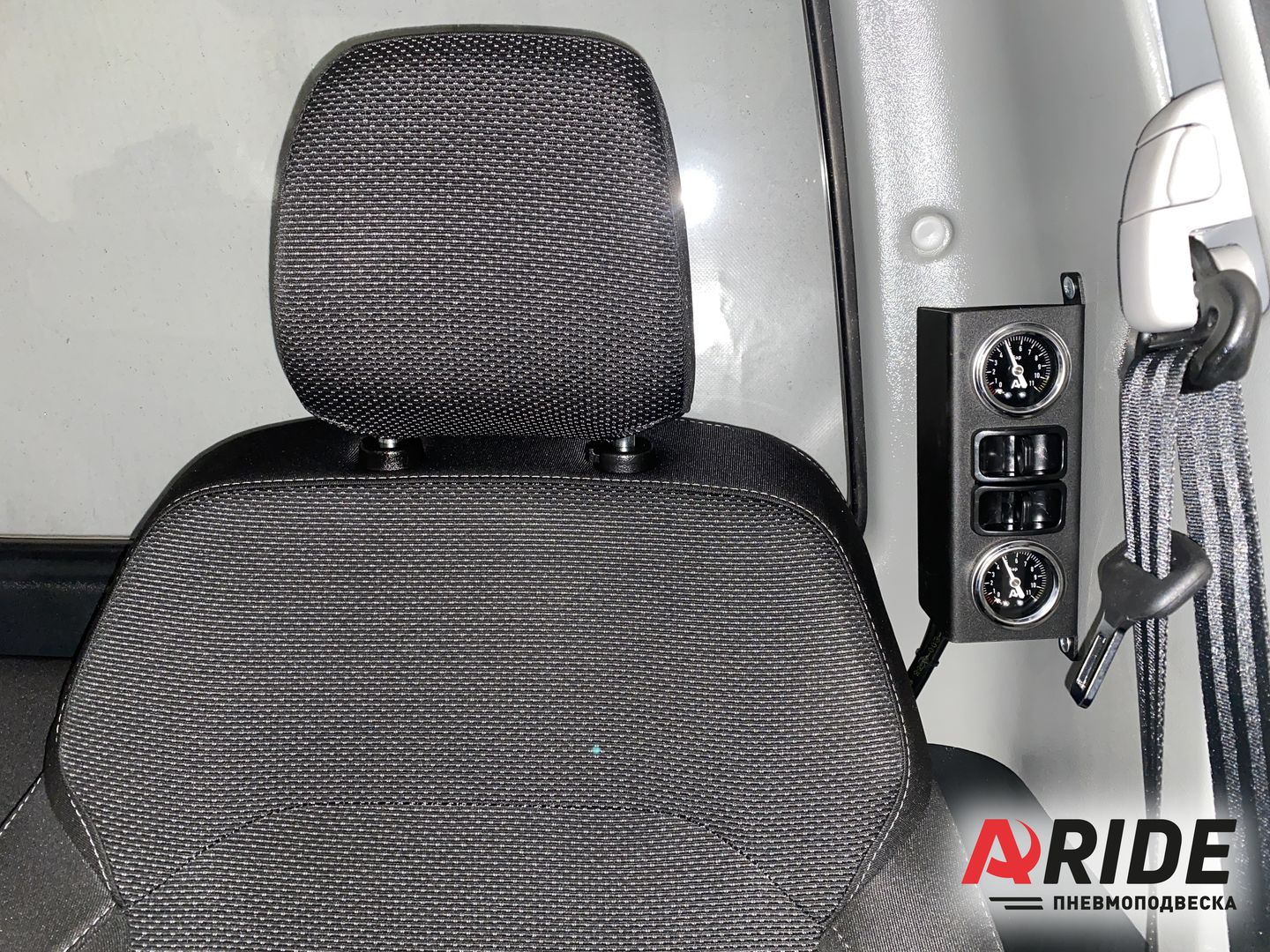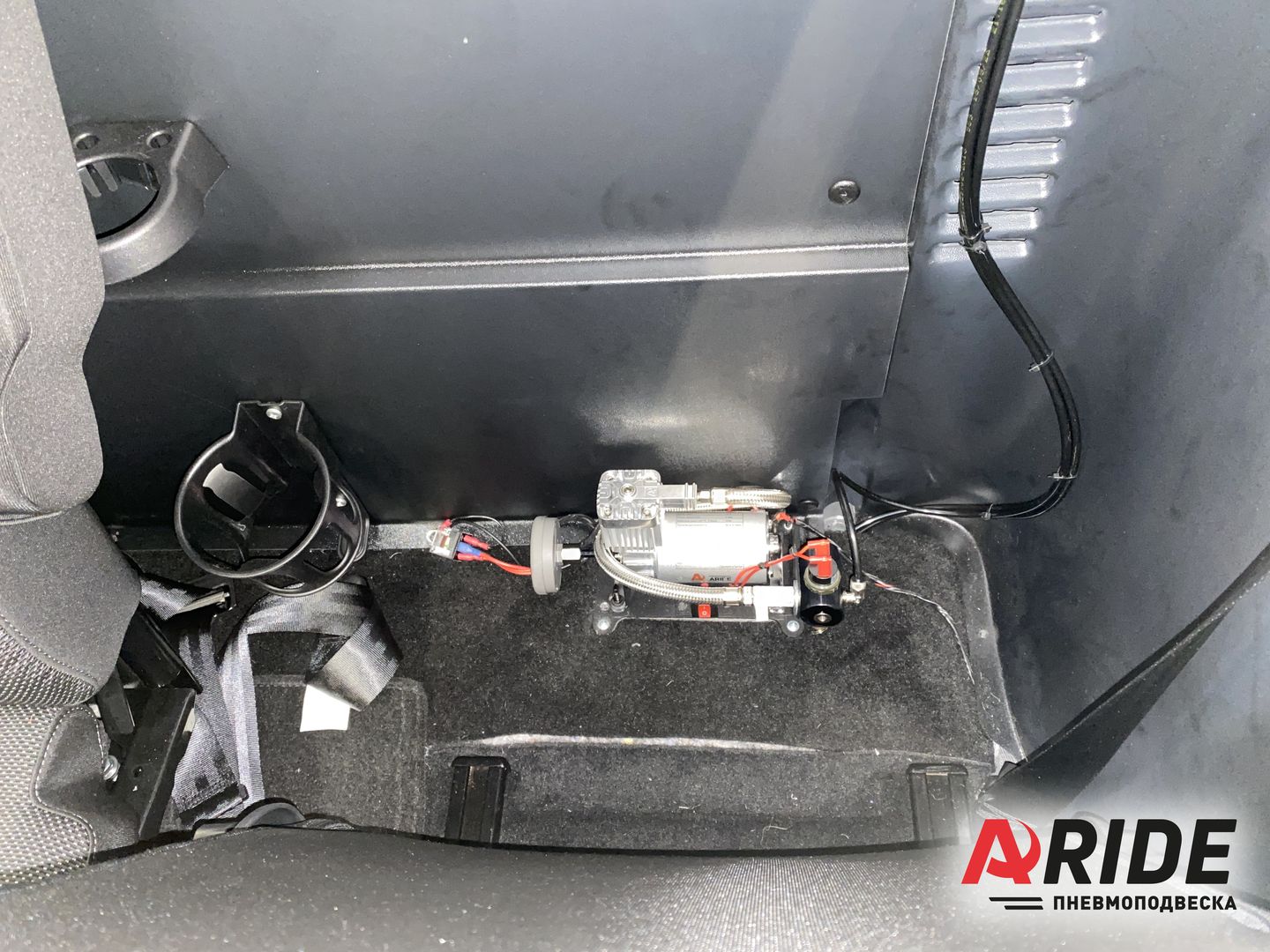Управление пневматическими подушками реализовано за счёт двухконтурной системы управления - 2.Эконом. В данном автомобиле не так много места для размещения компрессора и блока управления. Cамым оптимальным местом для установки компрессора, было выбрано место за водительским сидением, а блок управления был установлен на стойке, слева от водительского сидения. Данная система позволяет регулировать давление отдельно в каждом пневмоэлементе. Это положительно скажется на управляемости автомобиля, он станет менее подвержен боковой раскачке. А так же при двухконтурной системе, появляется возможность выравнивания автомобиля при его неравномерной загрузке.