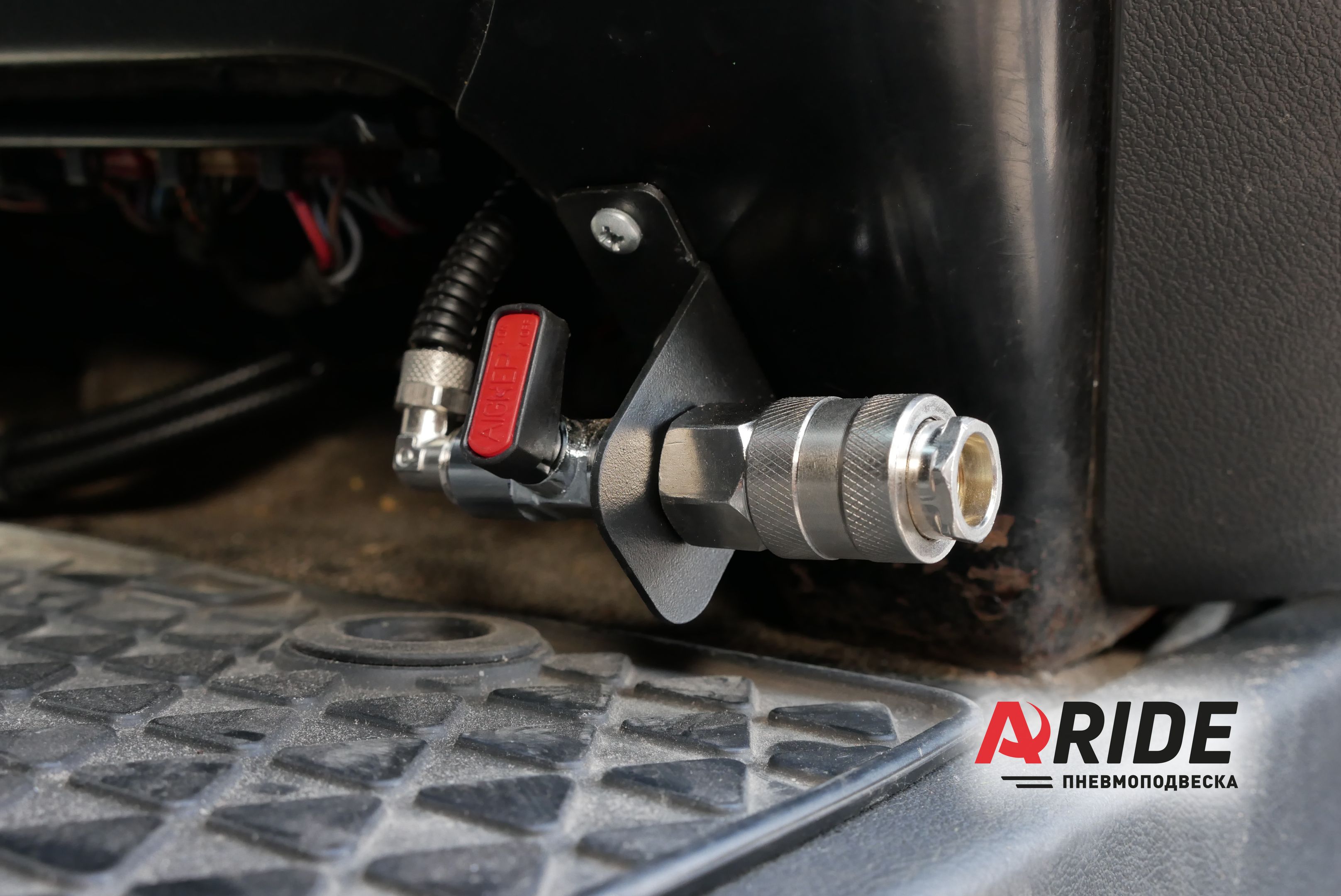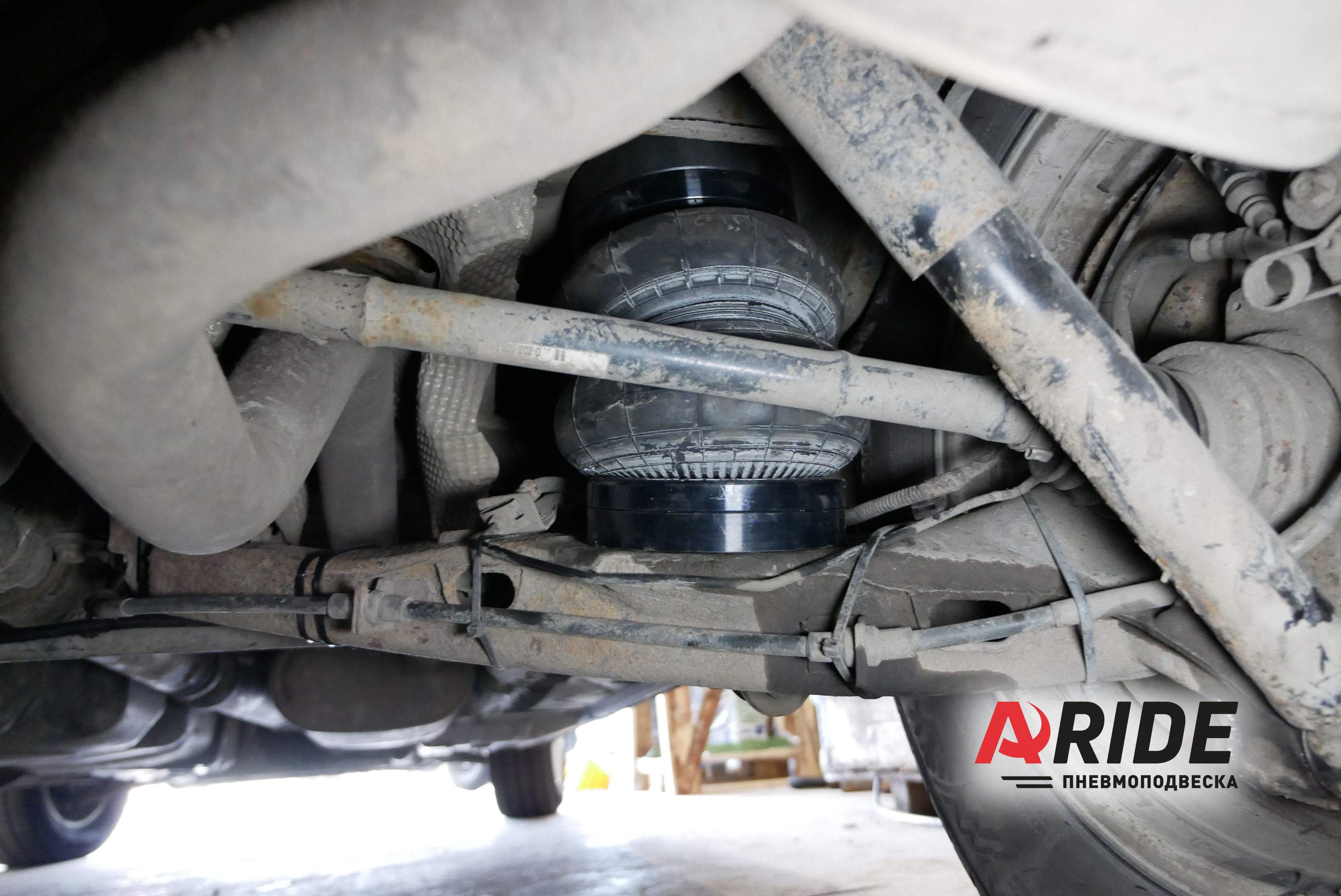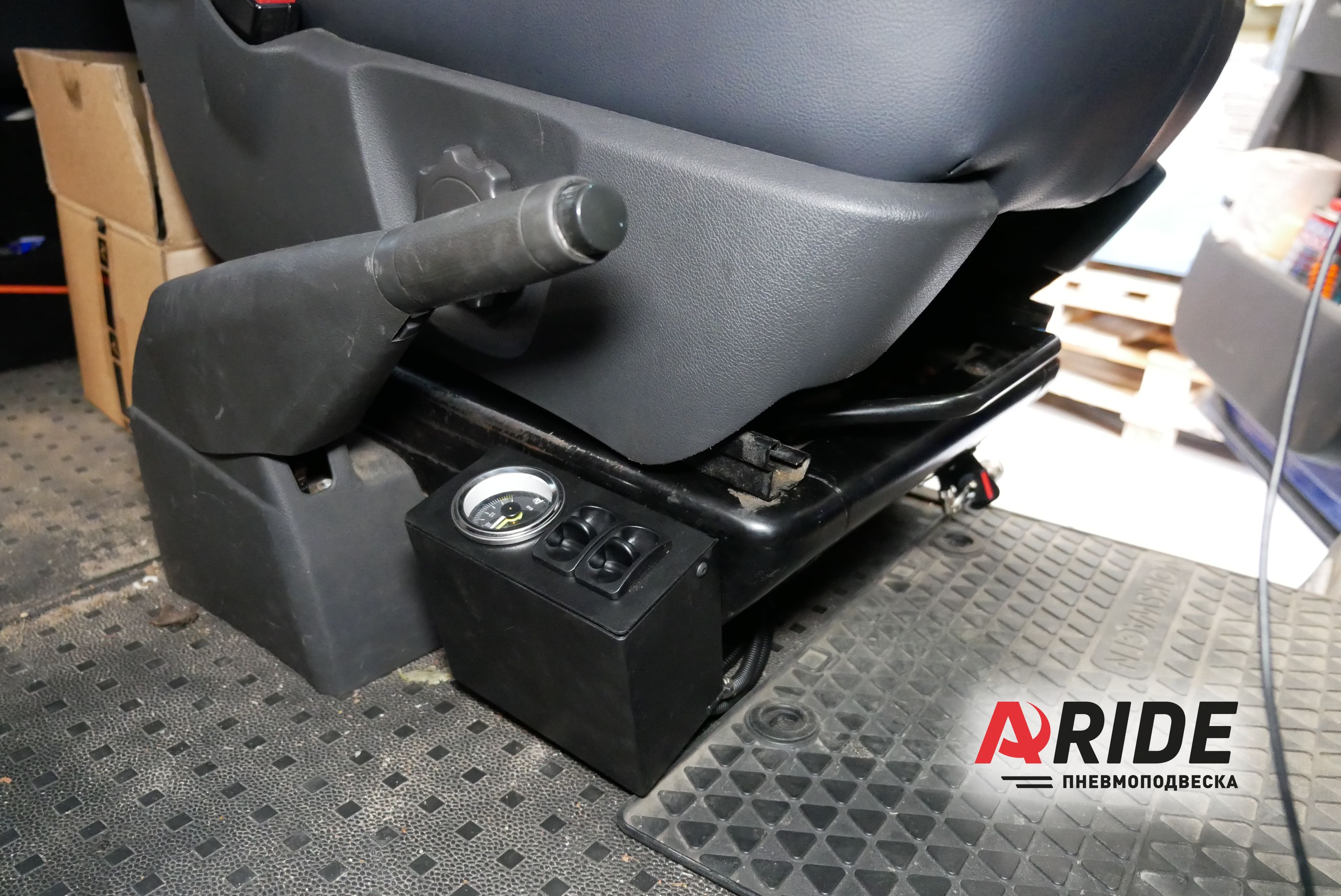 Для управления давлением в пневмоэлементах была выбрана двухконтурная система 2.120.ПС. Данная система оснащена высокопроизводительным компрессором ARIDE 100C и пятилитровым ресивером. Ключевым плюсом данной системы является то, что в ресивере всегда поддерживается давление 8 атмосфер, это обеспечивает очень быстрое нагнетание воздуха в пневмоподушки. Блок управления пневмоподвеской расположен справа от водительского сидение. Ресивер, компрессор, датчики, всё расположилось под задним рядом сидений.