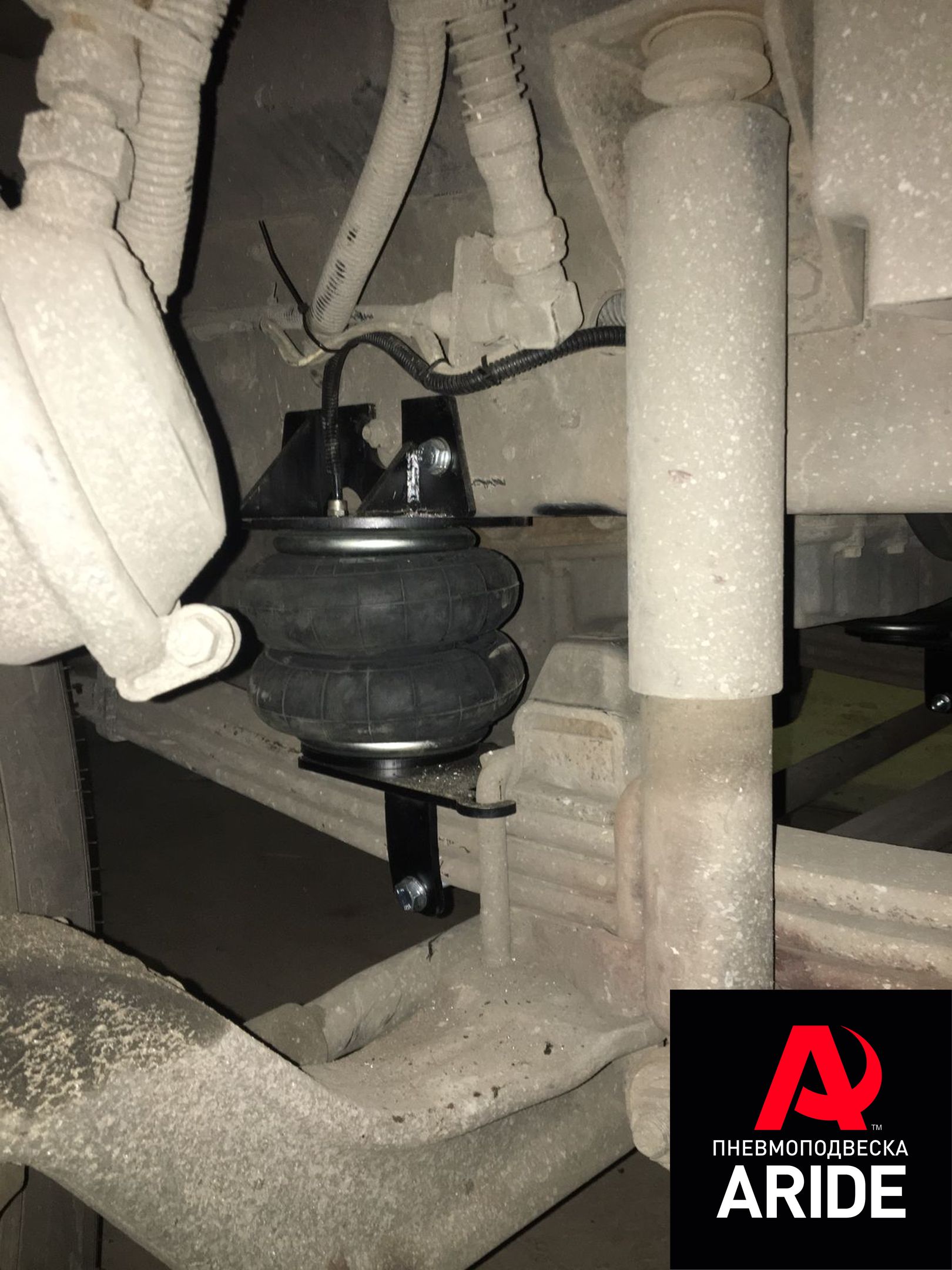С помощью пневмоподвески нам удалось компенсировать с рессор по передней оси до 3000 кг, и по задней оси до 4000кг. Верхние кронштейны обоих комплектов были установлены и закреплены в заводские отверстия в раме. На передней оси нижние кронштейны закреплены за стремянные болты и полностью обхватывают пакет рессор и зажимаются с нижней части болтом. На задней оси нижние кронштейны пневмоподвески стоят на чулке моста и закреплены за штатные болты крепления амортизаторов.
