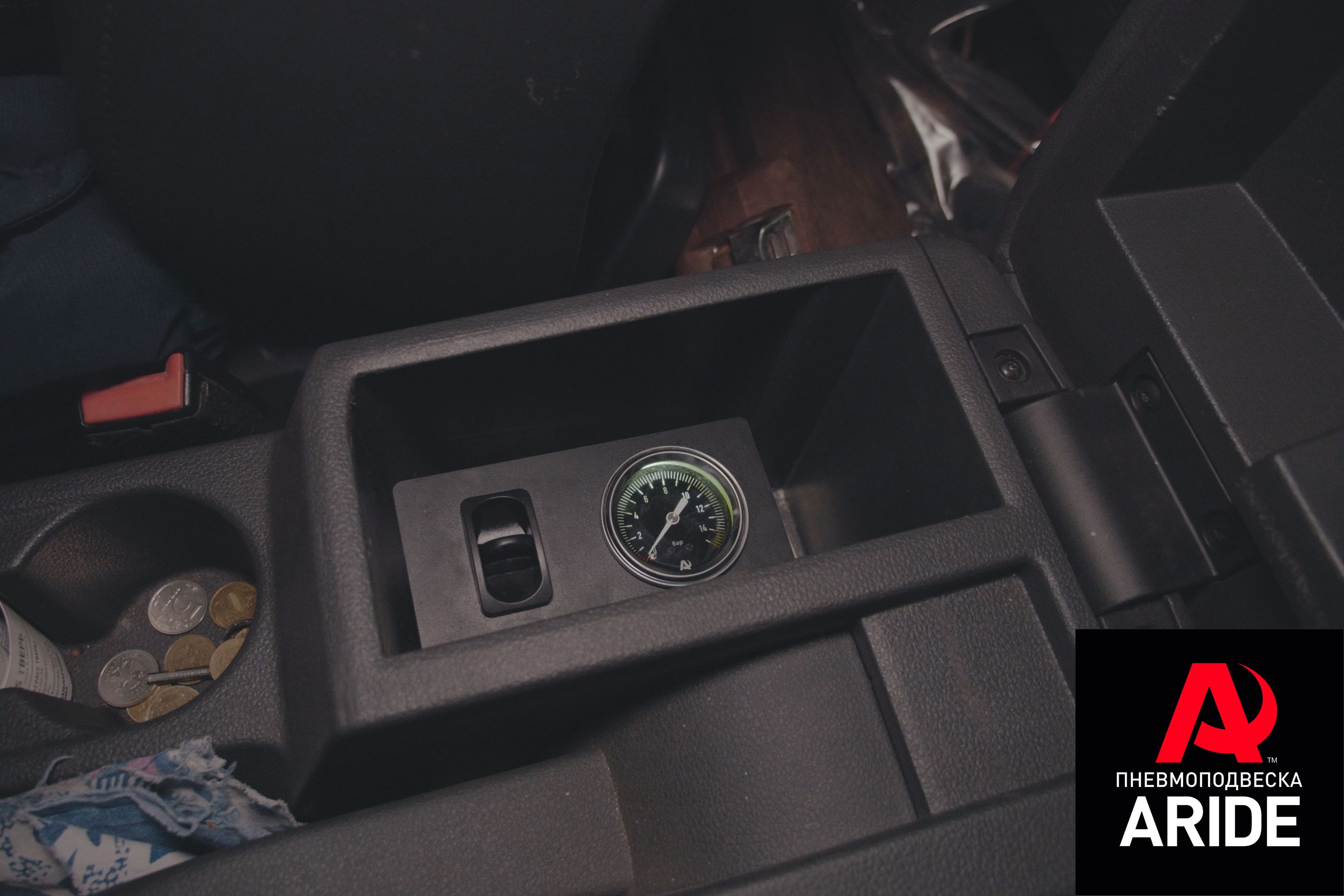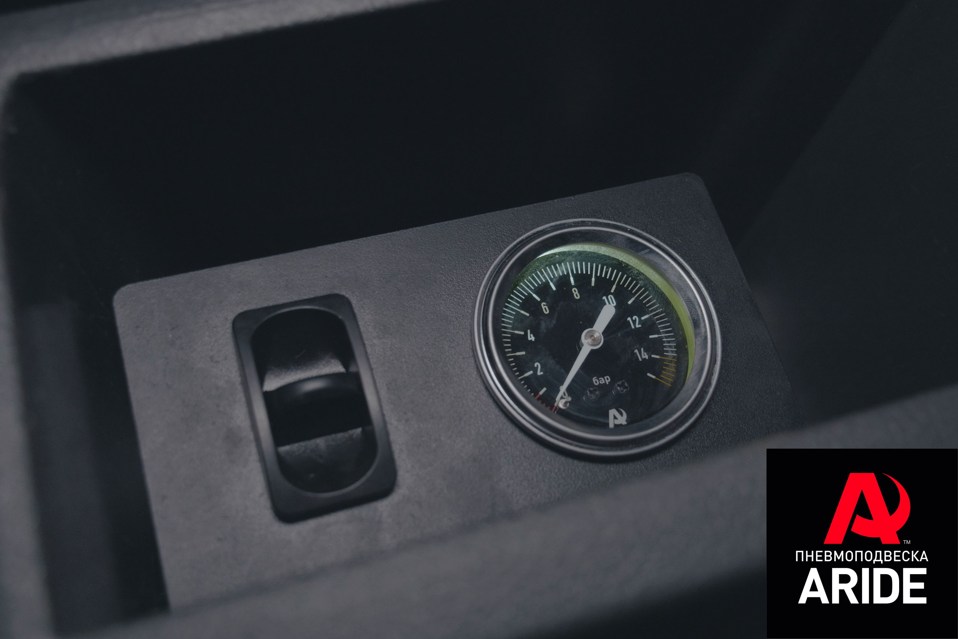 Для управления данной пневмоподвеской, была установлена одноконтурная система управления. Манометр и пневмоклавиша были установлены в подлокотник. А компрессор разместился за задним рядом сидения, это самое удобное и практичное место для установки компрессора в пикапах. Так же для быстродействия, моментального поступления воздуха в подушки, данная система оборудована 5ти литровым ресивером, который быдл закреплён на днище авомобиля.