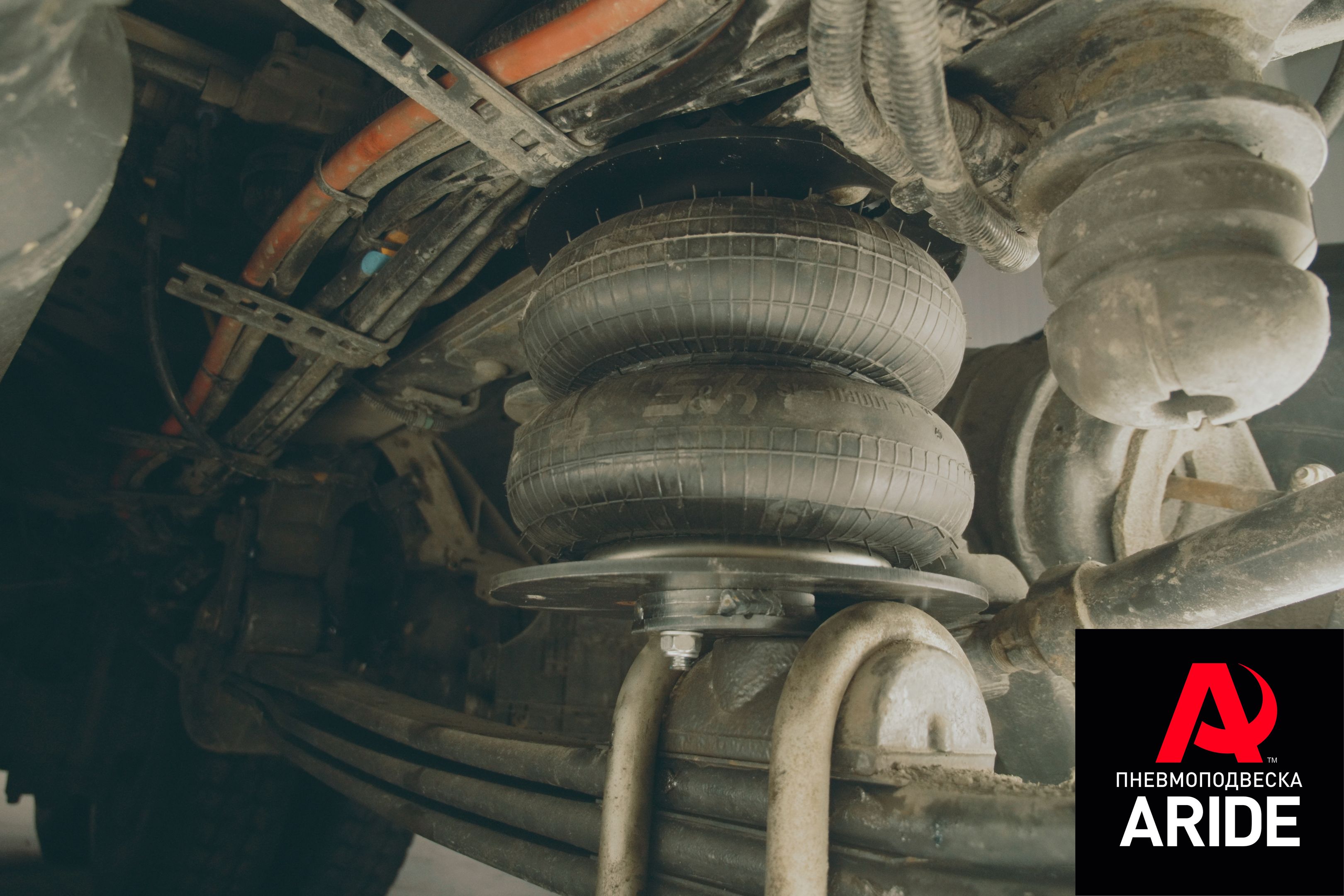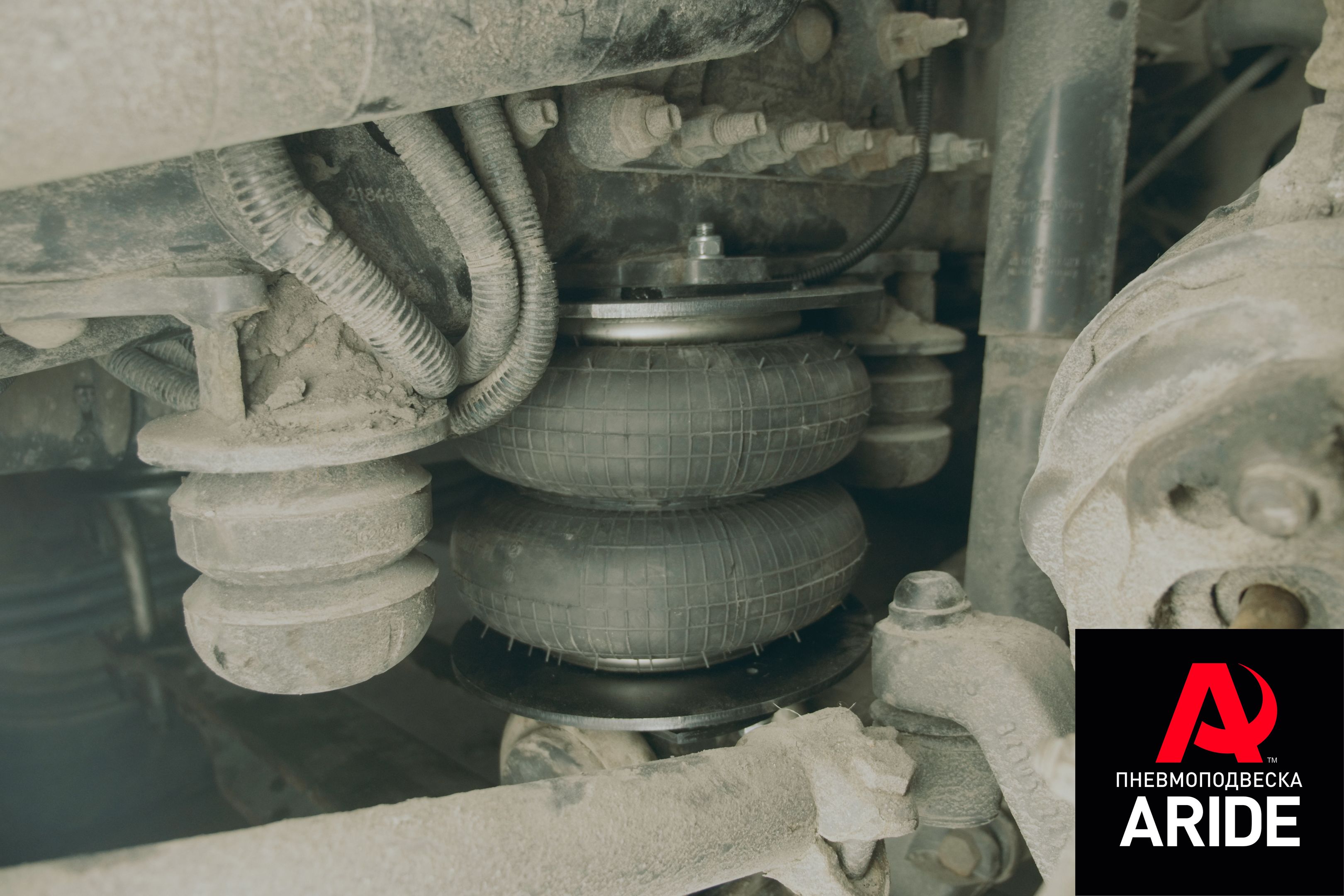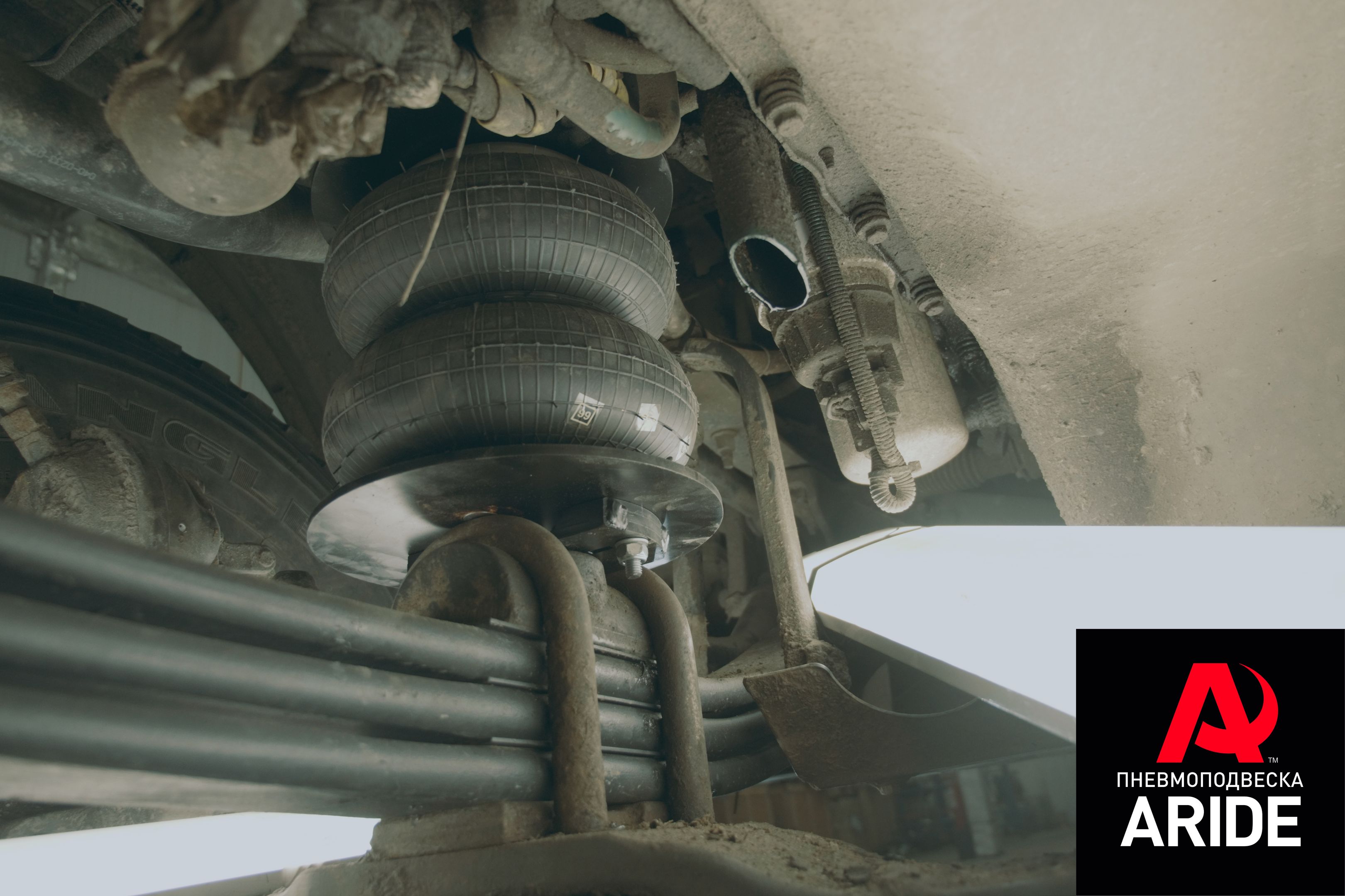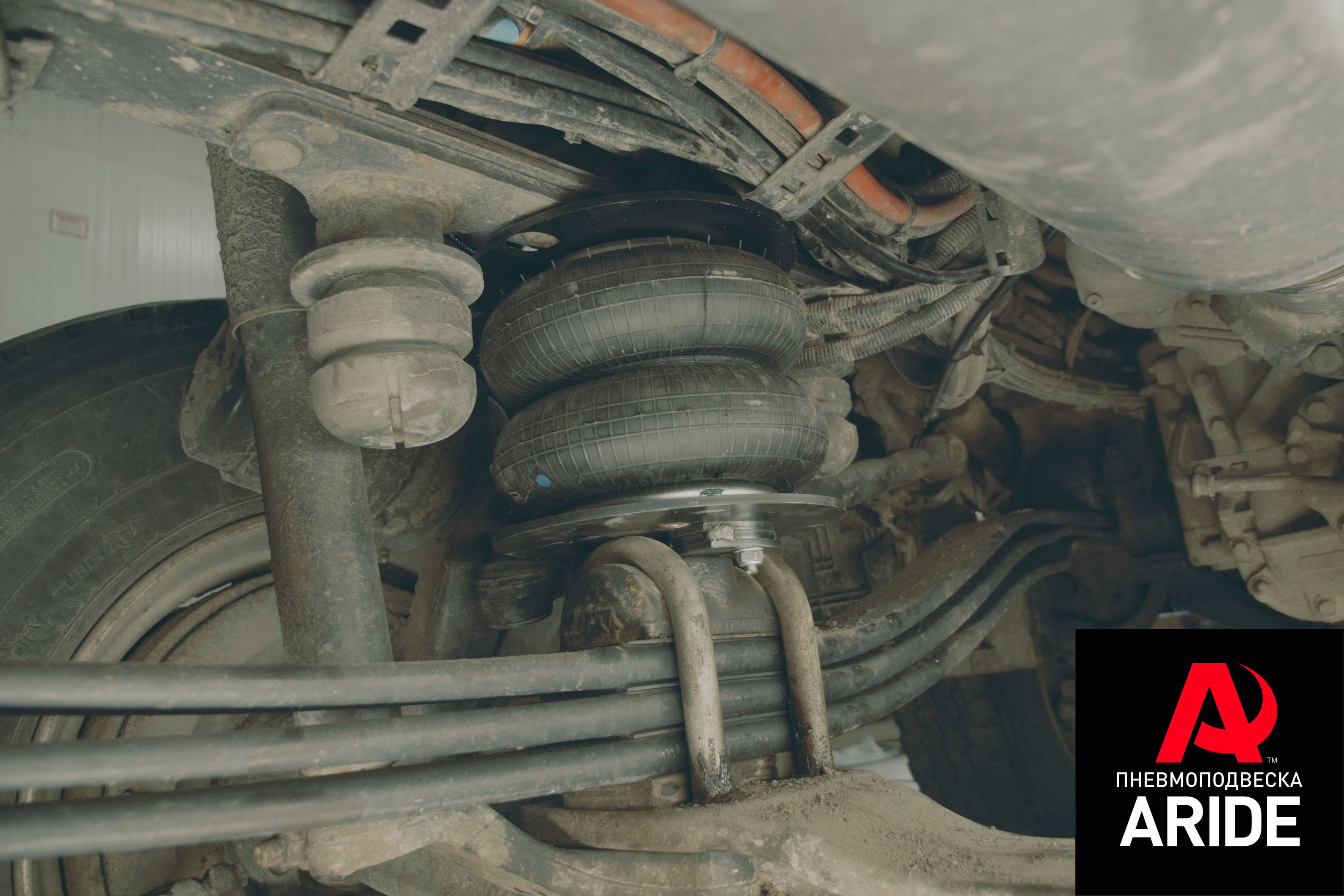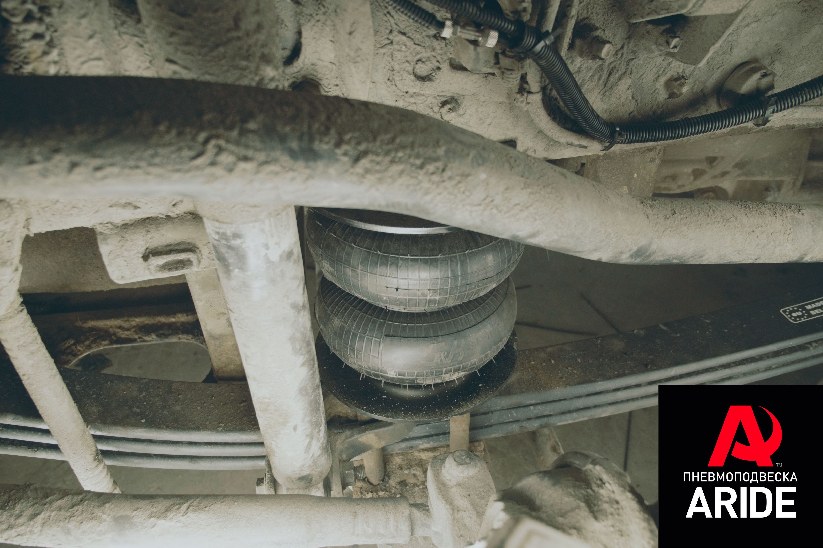Перед началом установки, заказчик поменял все четыре пакета рессор на передних осях. Далее по готовым размерам, нашими специалистами был разработан и смонтирован комплект вспомогательной пневмоподвески. Конструкция получилось достаточно надёжная и имеет большой запас прочности. Все четыре верхних кронштейна надёжно крепятся к массивной раме. Нижние же кронштейны так же надёжно закреплены к штатной проставке-креплению амортизатора. А она в свою очередь обхватывается стремянными болтами и надёжно крепится к пакету рессор. Такой установкой кронштейнов нам удалось достичь максимального КПД пневмпоэлементов. Так как нижняя часть подушки упирается в балку, мы смогли равномерно разгрузить листы рессор. Создать дополнительную точку опоры. При давлении в 8 атмосфер, каждая подушка способна компенсировать до 2000кг.