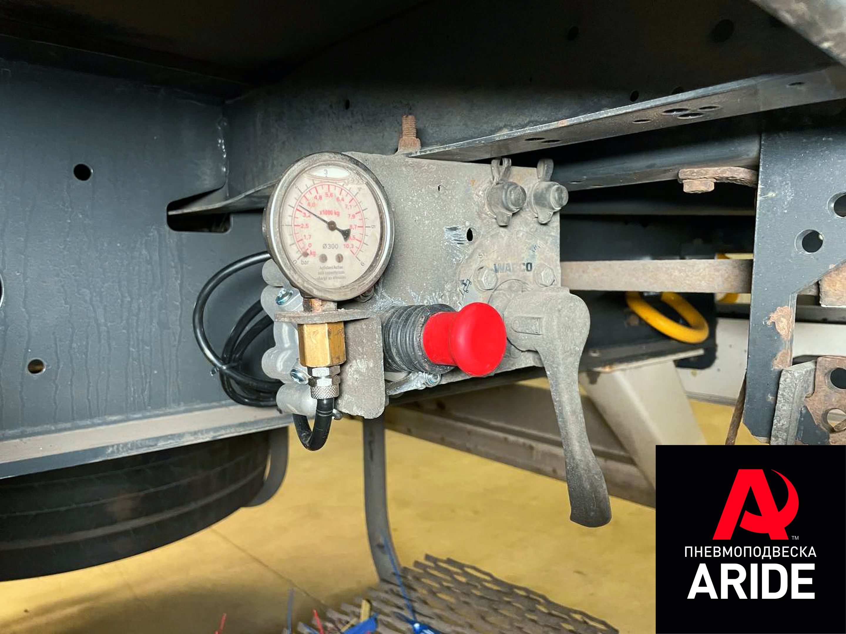 Так же нашими мастерами была установлена система управления механизмом подъёма оси полуприцепа. Кран управления устанавливается в заводские места, рядом со штатным краном управления пневмоподушками.