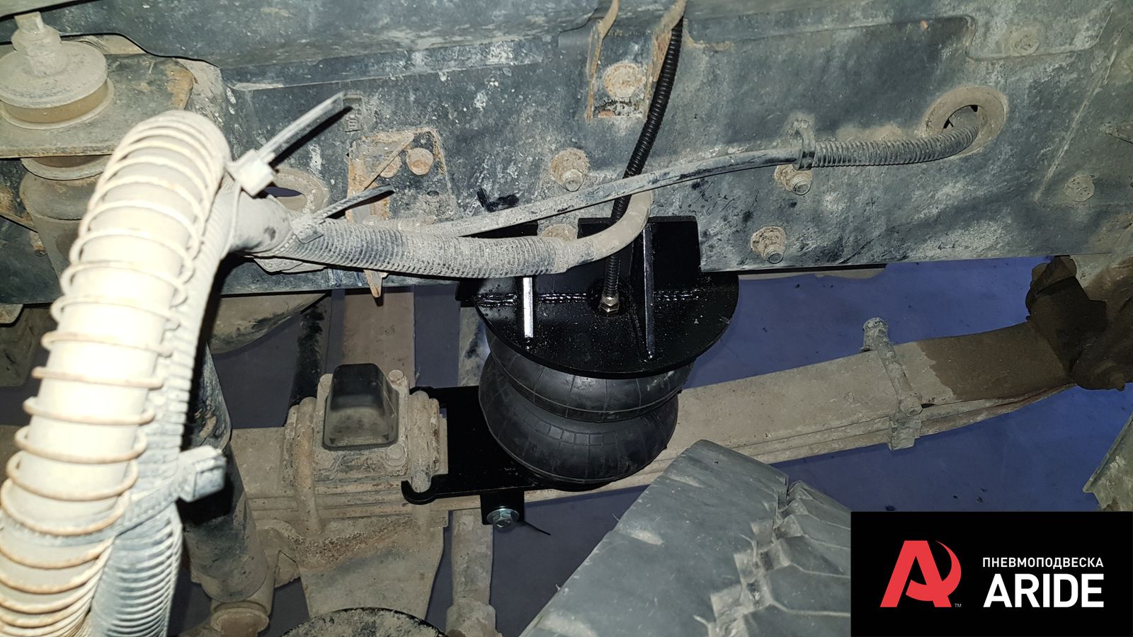Установка передних пневмоподушек на Хендай HD120 для компенсирования высокой нагрузки на переднюю ось из-за установленной крано-манипуляторной установки.
