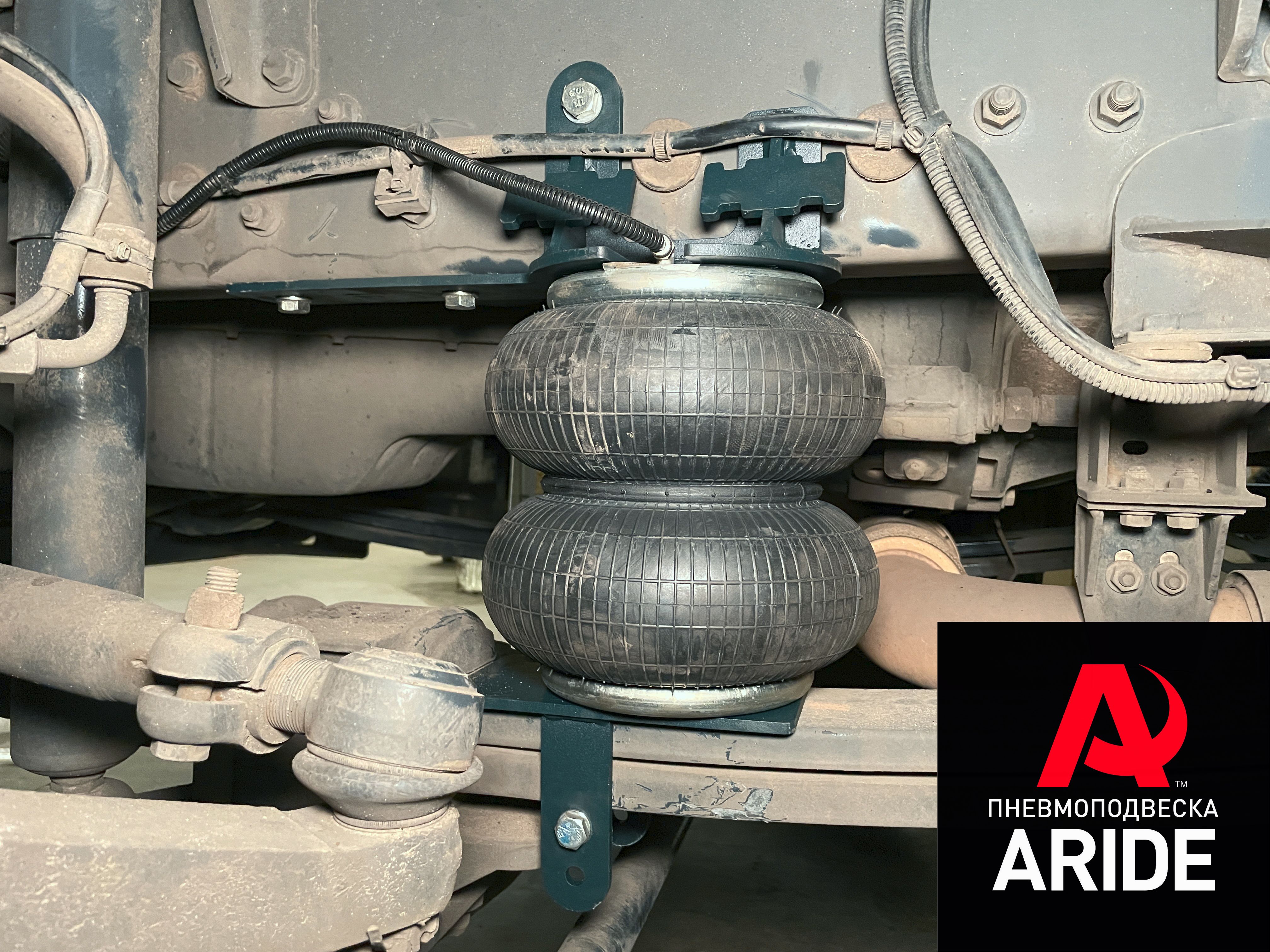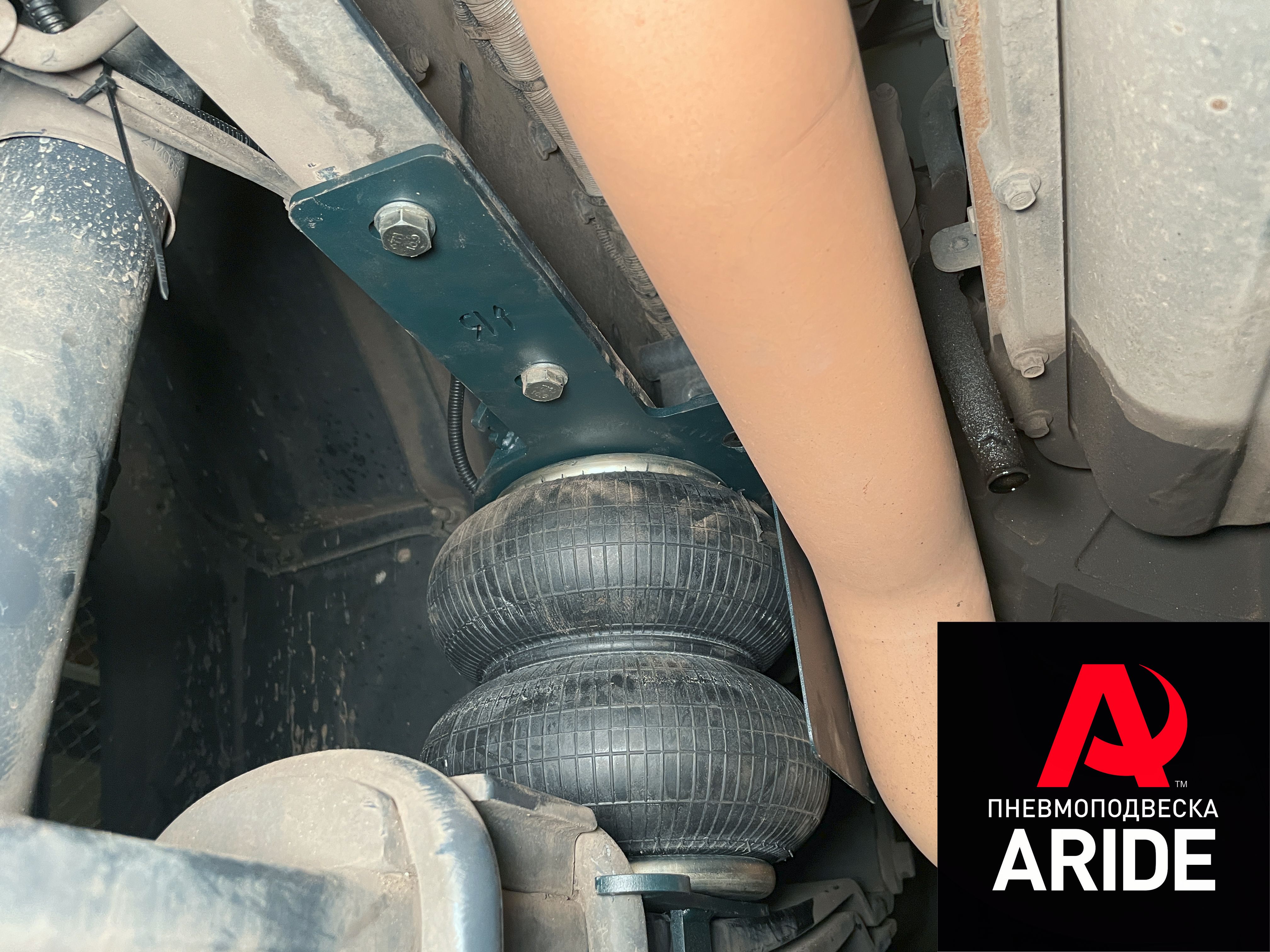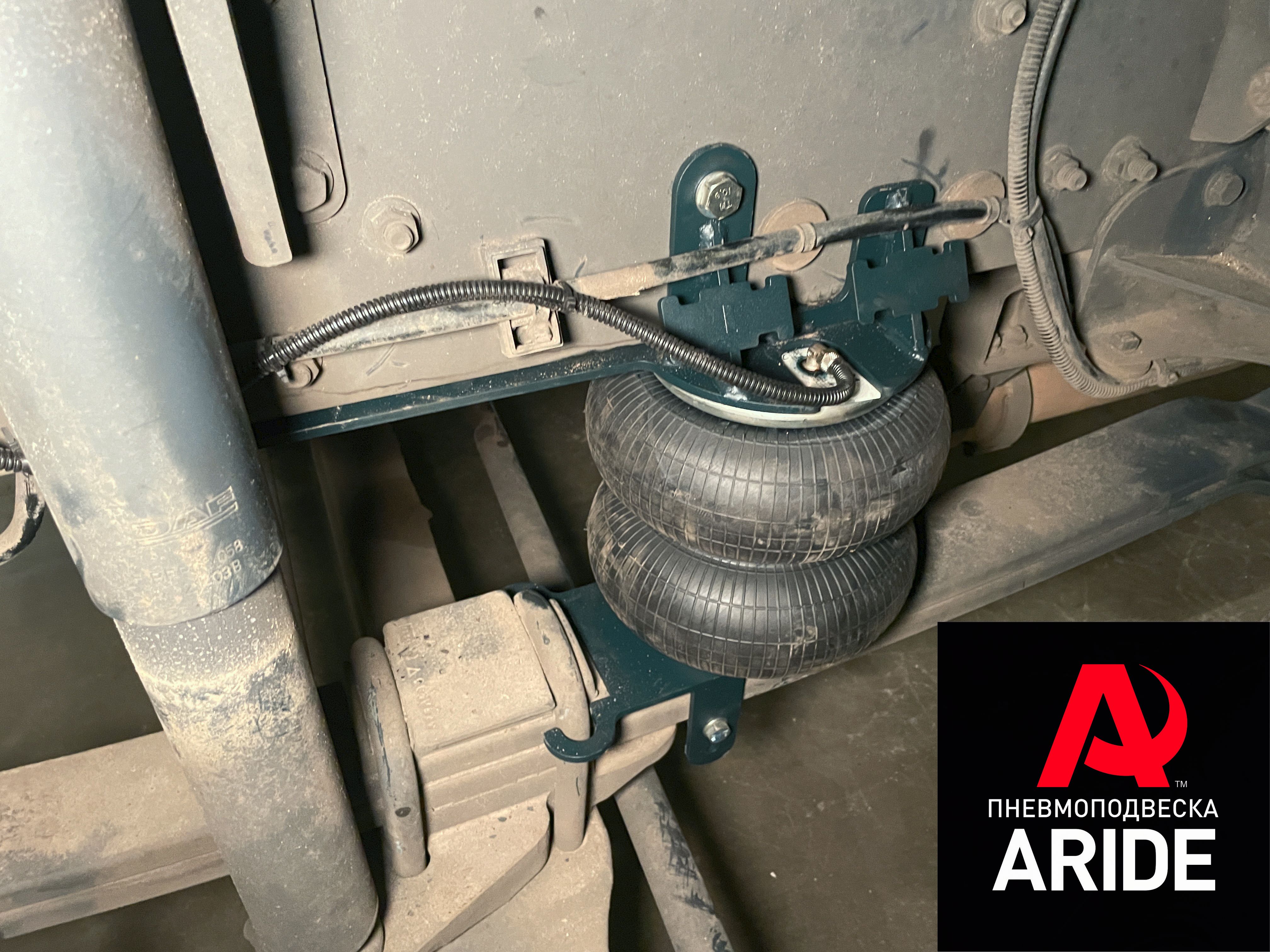 Для решения данной проблемы, нашими мастерами из установочного центра был смонтирован комплект вспомогательной пневмоподвески на переднюю ось. Неотъемлемым преимуществом данного комплекта является то, что в нём используются пневмоподушки 250/2, каждая из которых способна компенсировать до 2000 килограмм нагрузки с каждой стороны на передней оси. Пневмоподушки устанавливается при помощи специальных кронштейнов, которые изготавливаются индивидуально под каждую марку и модель авто. В данном проекте верхние кронштейны крепятся к раме через заводские отверстия при помощи болтовых соединений. Нижние кронштейны устанавливаются на рессорный пакет, обхватывая его, так же нижние кронштейны зацепляются за стремянные болты.