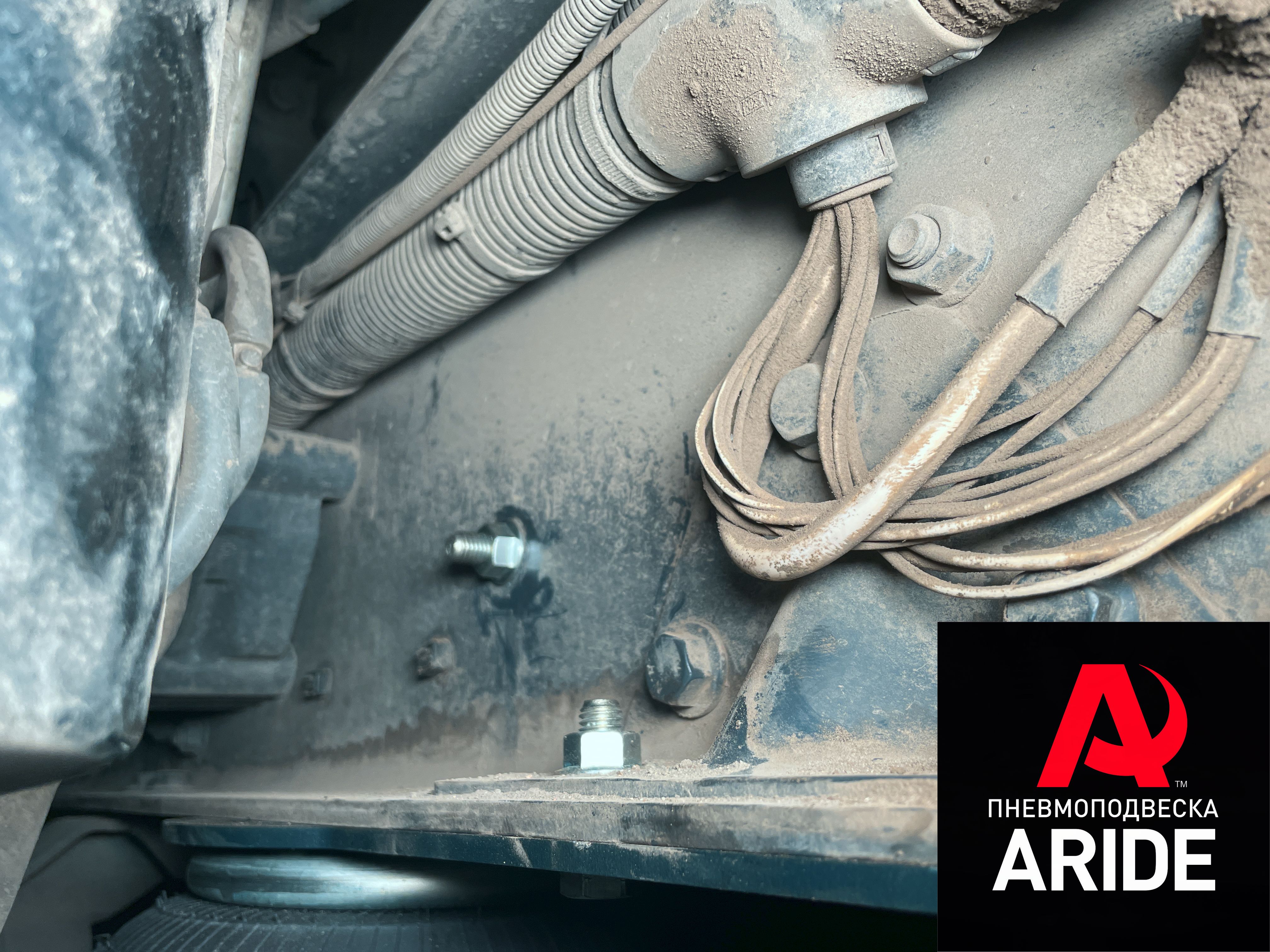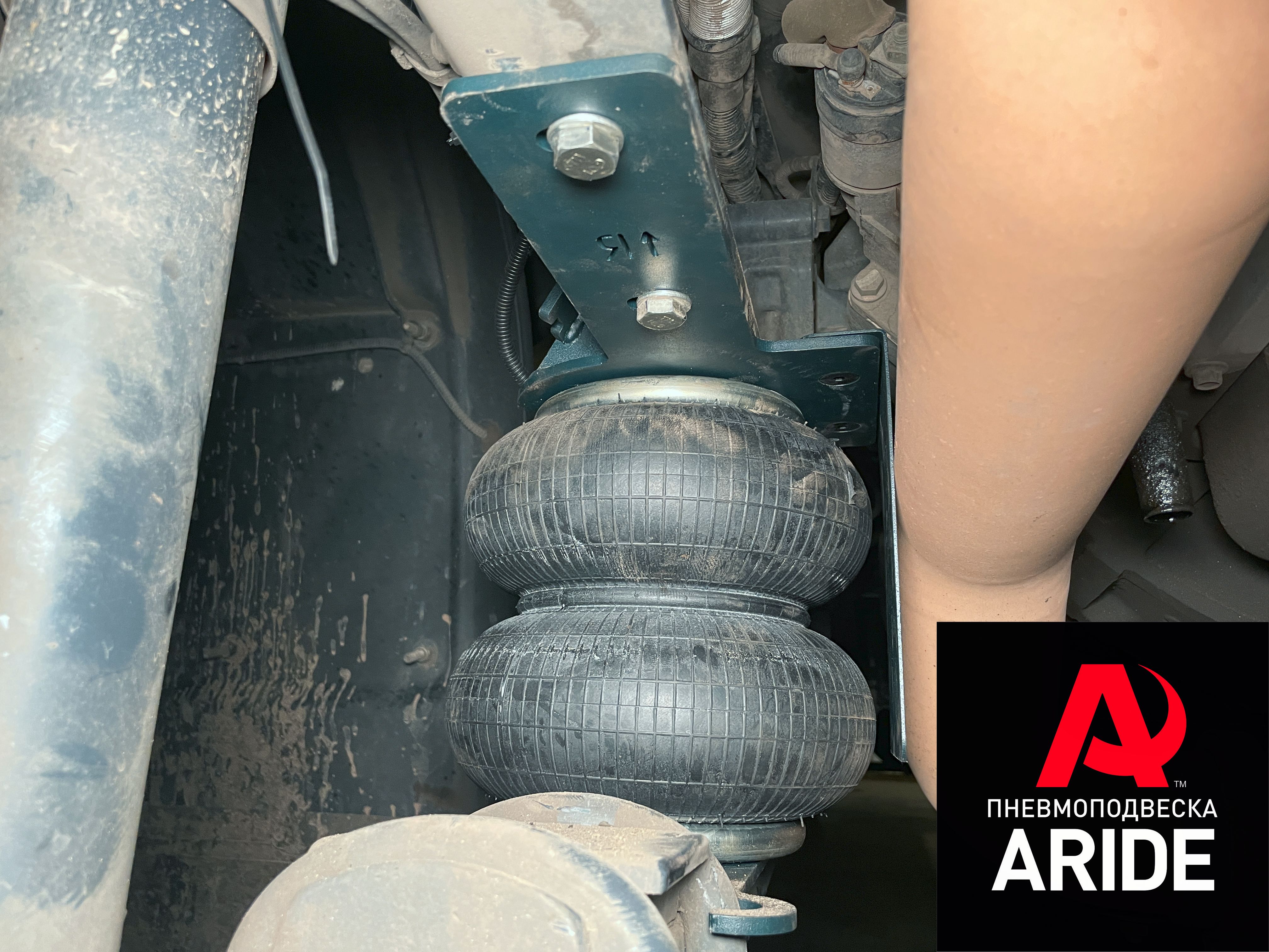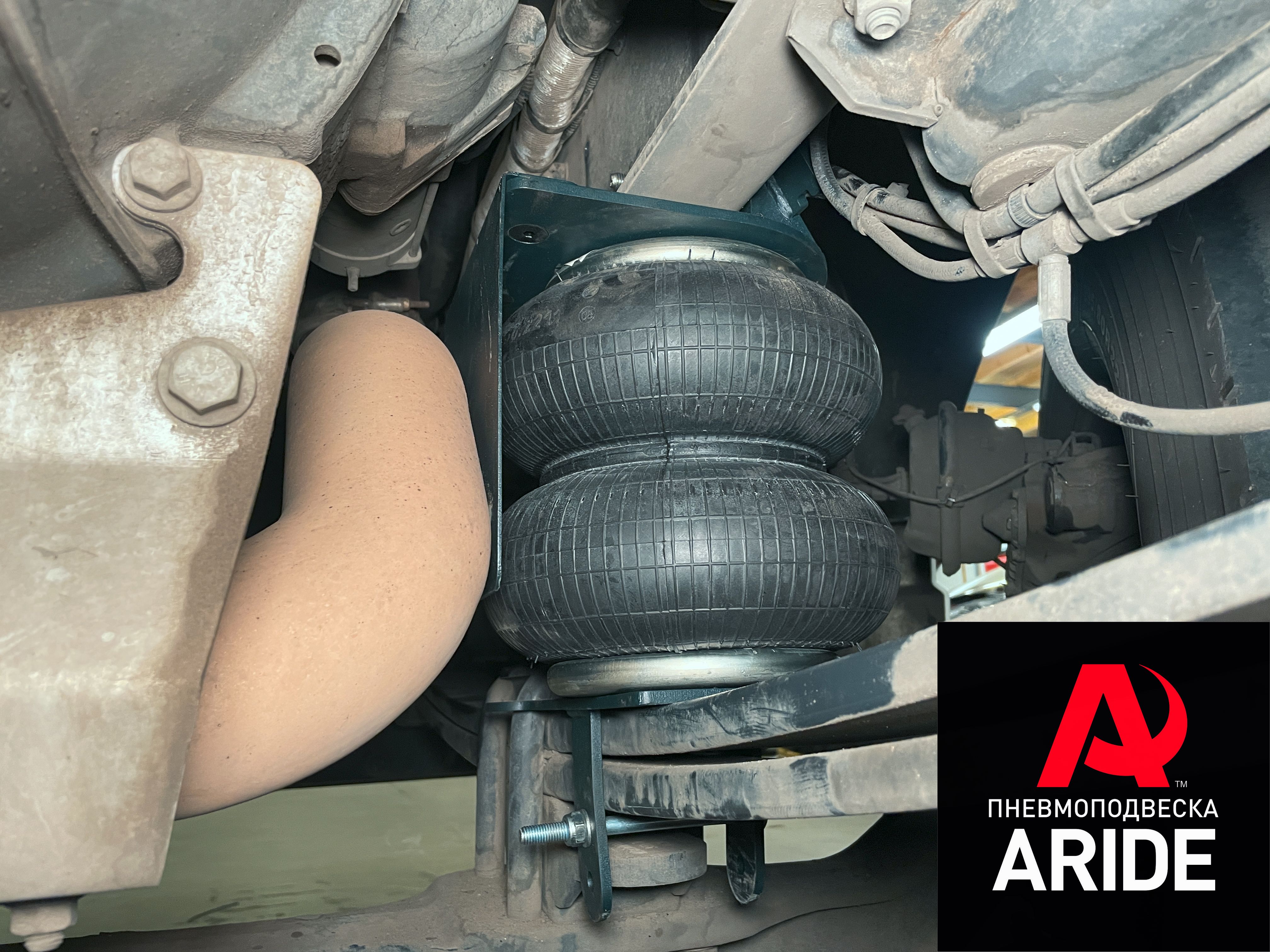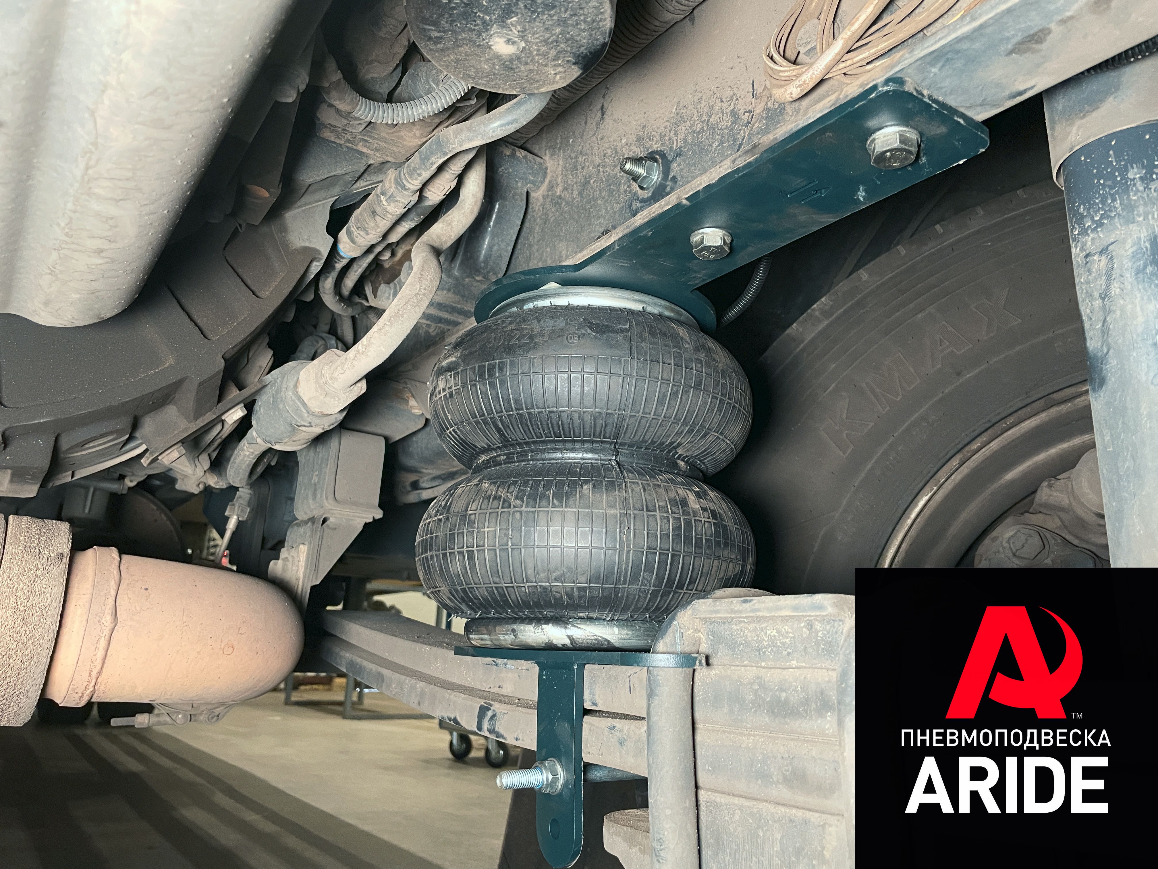 Для решения данной проблемы, нашими мастерами из установочного центра был смонтирован комплект вспомогательной пневмоподвески на переднюю ось. Неотъемлемым преимуществом данного комплекта является то, что в нём используются пневмоподушки 250/2, каждая из которых способна компенсировать до 2000 килограмм нагрузки с каждой стороны на передней оси. Пневмоподушки устанавливается при помощи специальных кронштейнов, которые изготавливаются индивидуально под каждую марку и модель авто. В данном проекте верхние кронштейны крепятся к раме через заводские отверстия при помощи болтовых соединений. Нижние кронштейны устанавливаются на рессорный пакет, обхватывая его, так же нижние кронштейны зацепляются за стремянные болты.