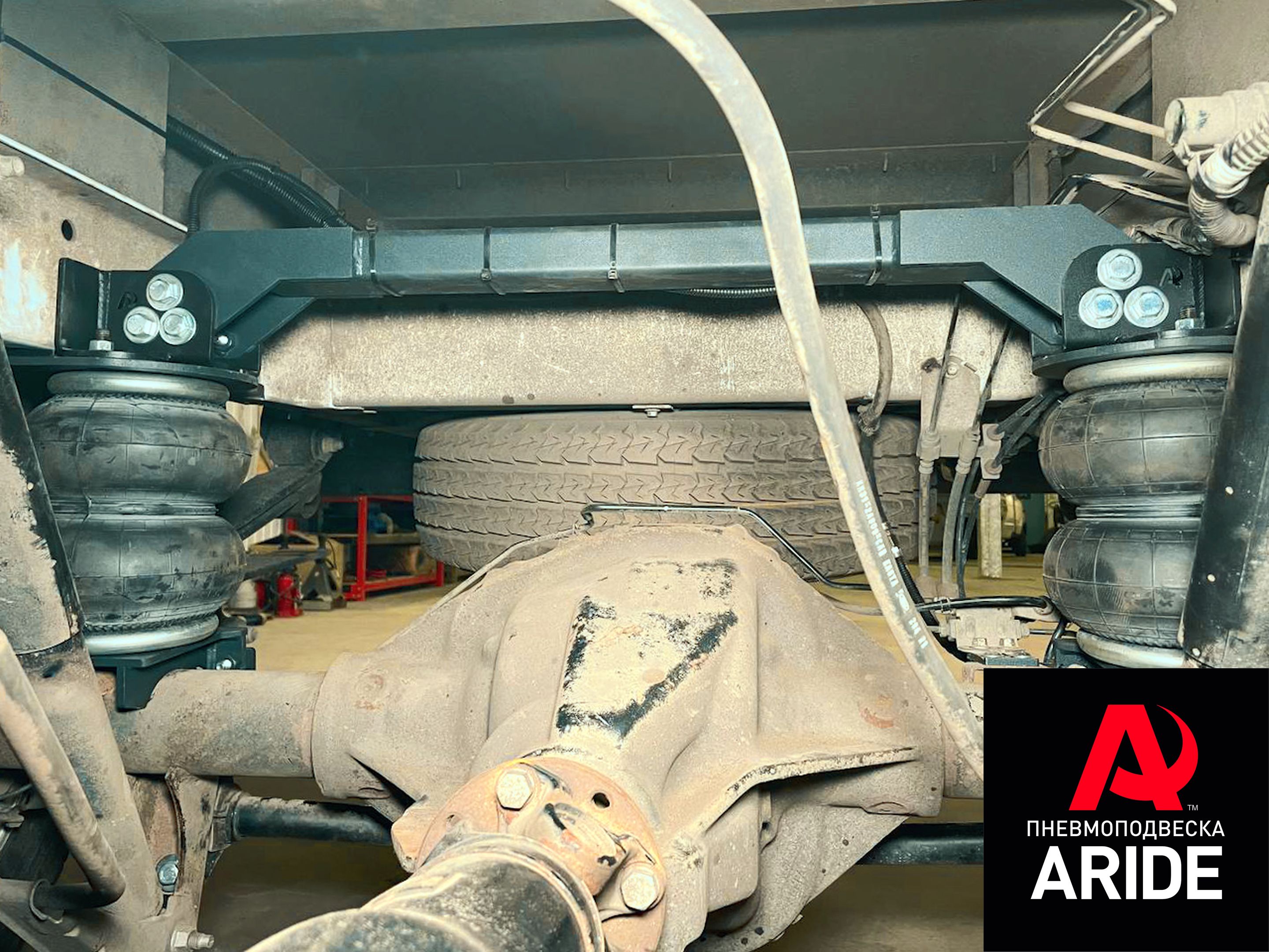 На данный авто, нашими мастерами был установлен комплект пневмоподвески на заднюю ось, комплект снимает нагрузку до 3000кг с задней оси, что в свою очередь сильно облегчает работу рессорам. Комплект выполнен из 6мм стали, все соединения металла надёжно проварены. Комплект устанавливается между рамой и мостом автомобиля. Верхние кронштейны устанавливаются на раму и крепятся через резьбовые отверстия, куда раньше крепился заводской отбойник. Дополнительно верхние кронштейны соединяются между собой поперечным усилителем, для большей жёсткости конструкции. Нижние кронштейны устанавливаются на мост, и притягиваются через болтовое соединение к заводскому креплению стабилизатора.