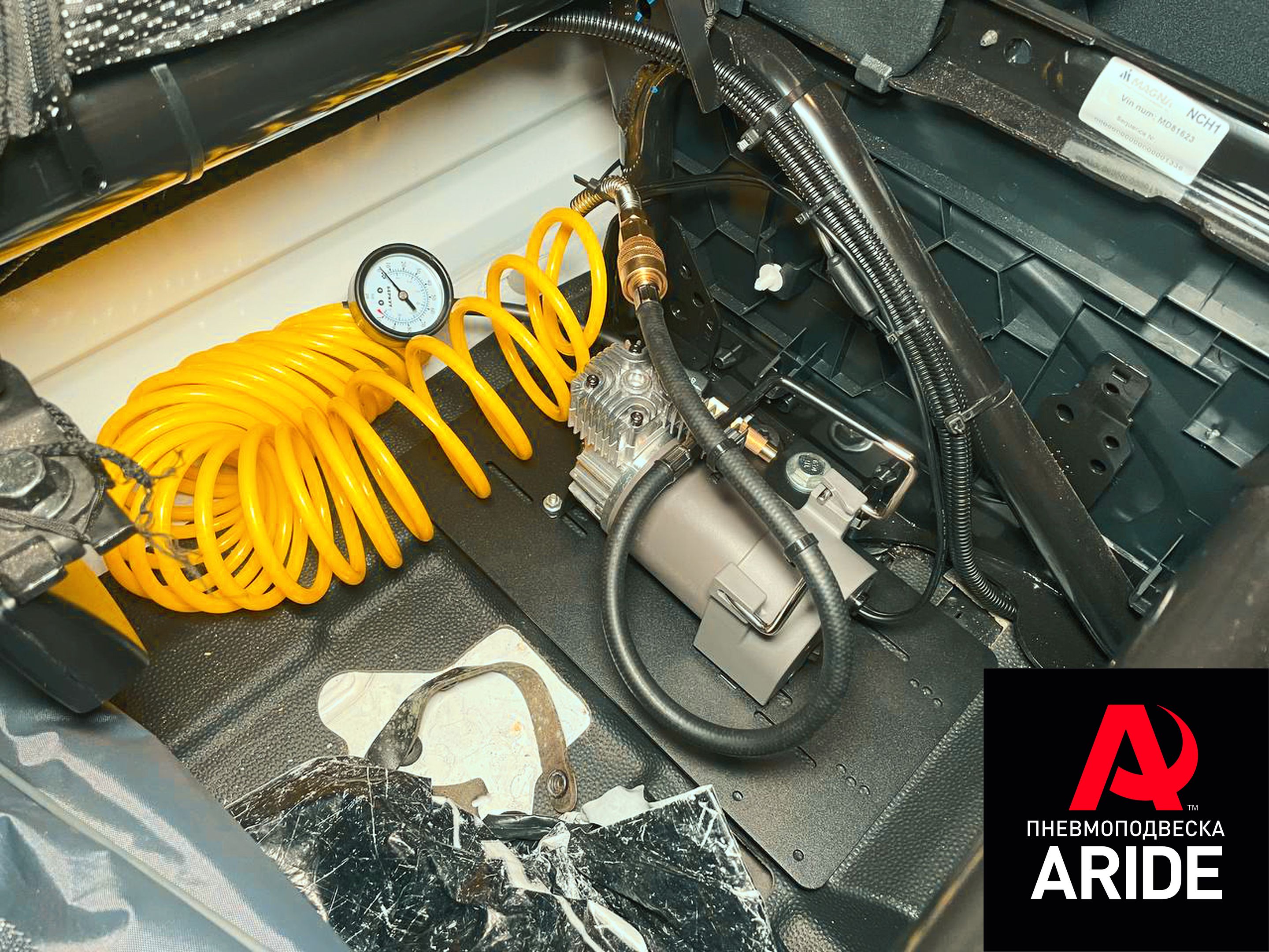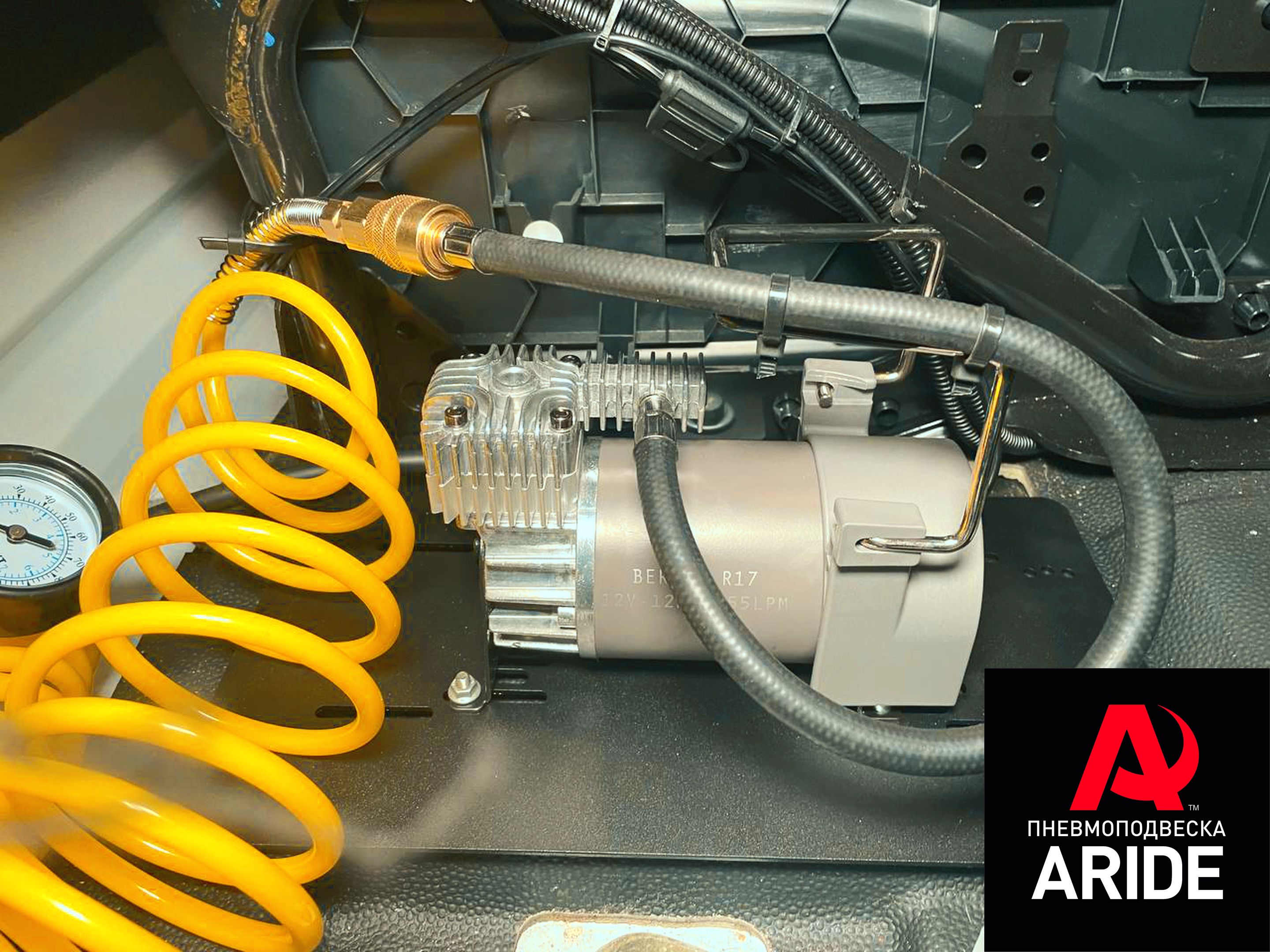 Дополнительно клиенту был установлен компрессор Berkut R17. Компрессор установили под пассажирским сидением. На нём установлен витой шланг, при помощи которого возможно производить не только накачку пневмоэлементов, но и всех колёс.
