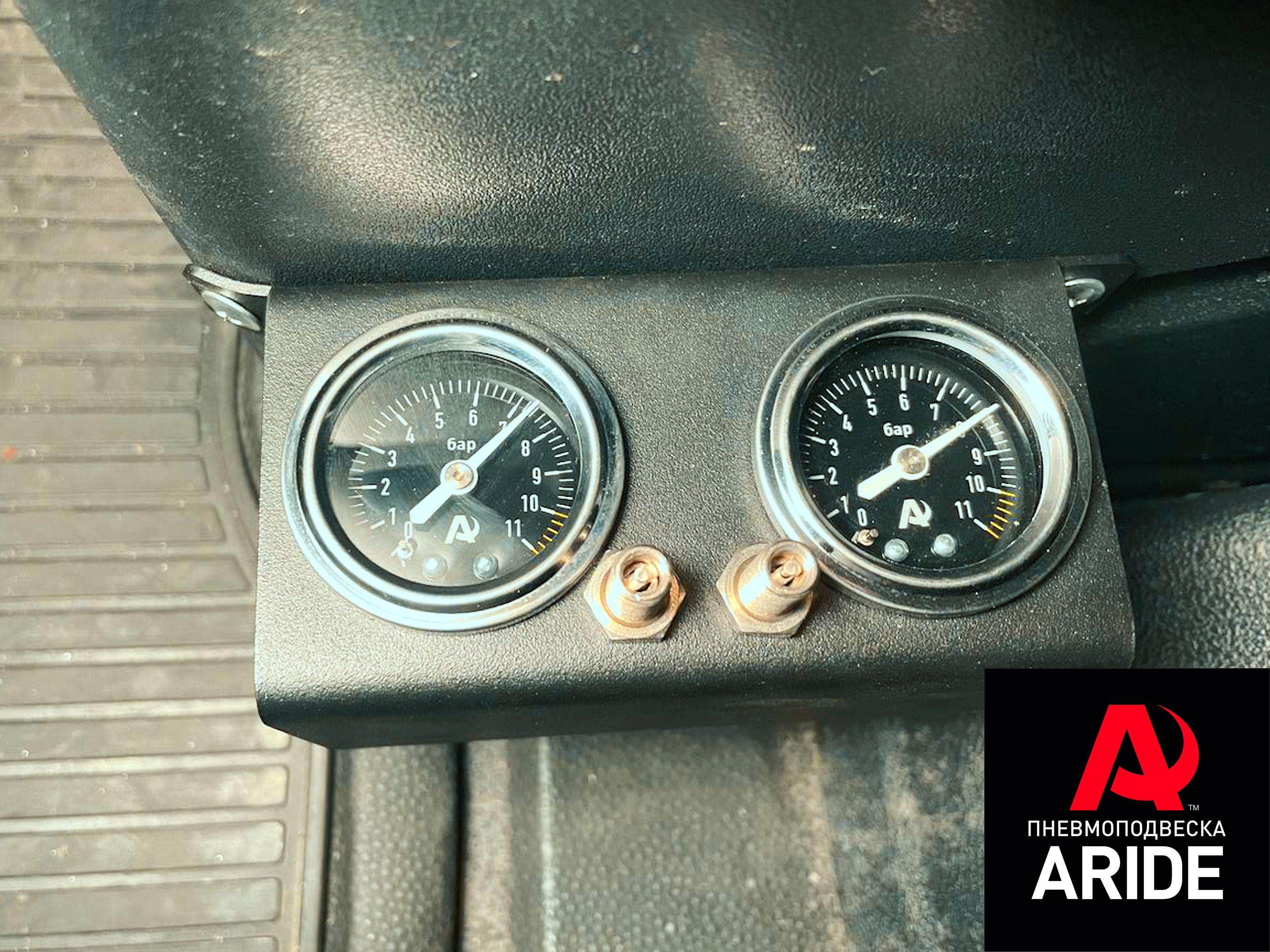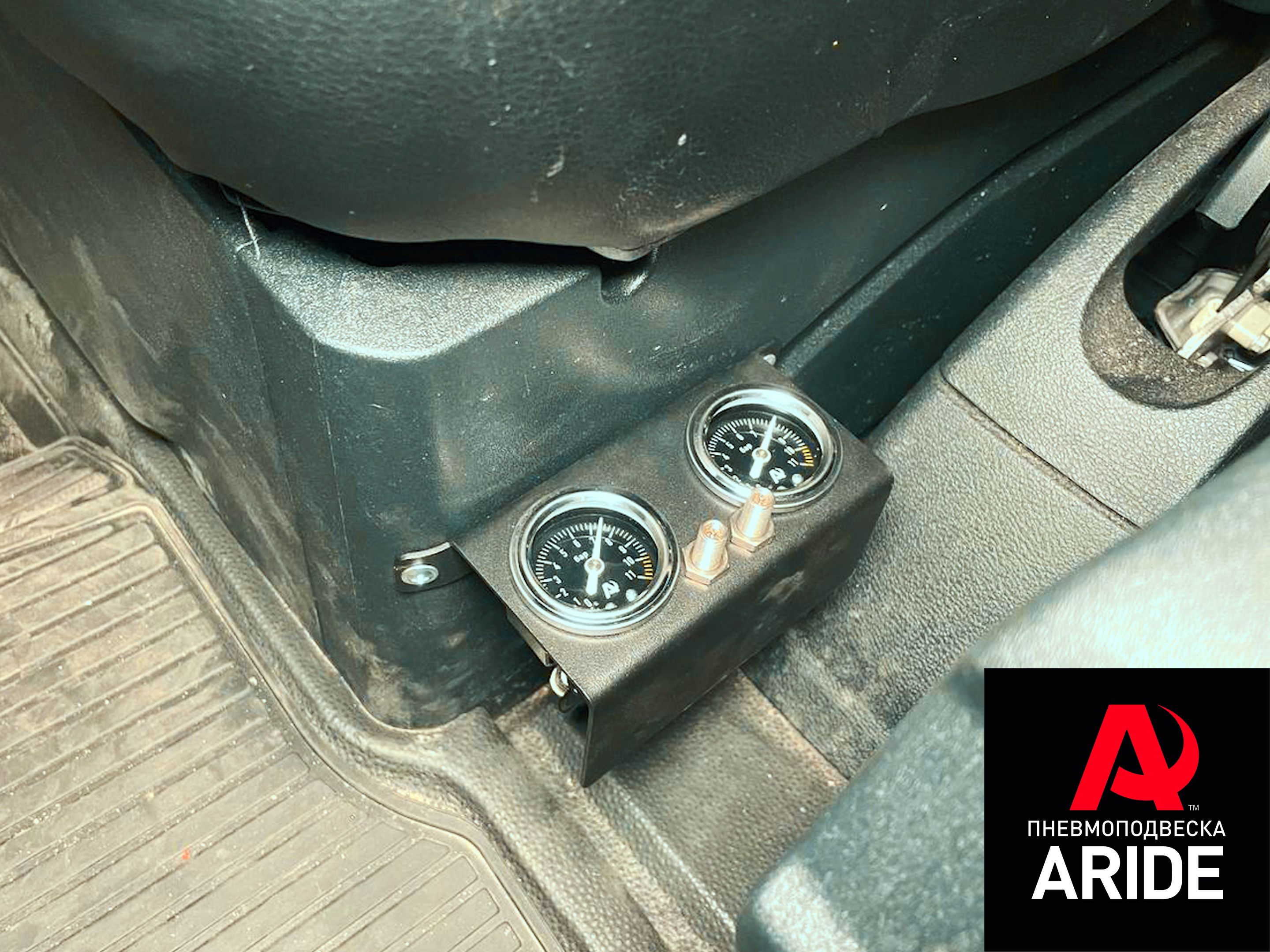 Для отслеживания давления, клиенту была установлена двухконтурная система 2.ПМ. Она подключается к пневмоэлементам. Состоит она их двух манометров и двух ниппелей, которые устанавливаются в металлическую панель, которая в данном случае крепится к нише под пассажирским сидением.