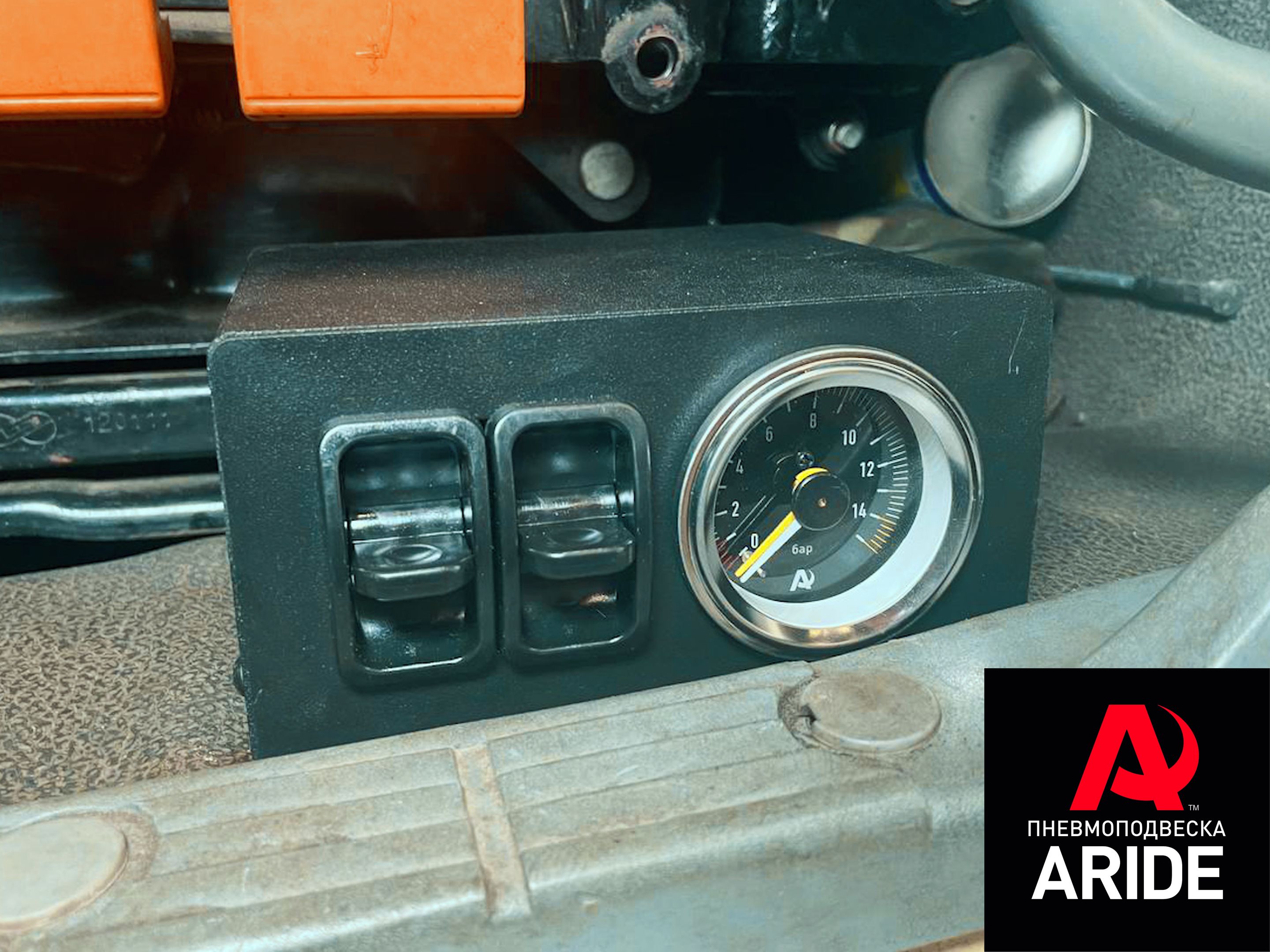 Для управления давлением в пневмоподушках на данном автомобиле используется двухконтурная система управления 2.ОБ.ПС. Это без компрессорная система управления, которая подключается к заводской воздушной системе. Для безопасного подключения к штатному ресиверу всегда используется шаровый кран. Блок управления данной системой состоит из двухстрелочного манометра с подсветкой и двух пневмоклавиш. Данный блок управления устанавливается слева от водительского сидения.