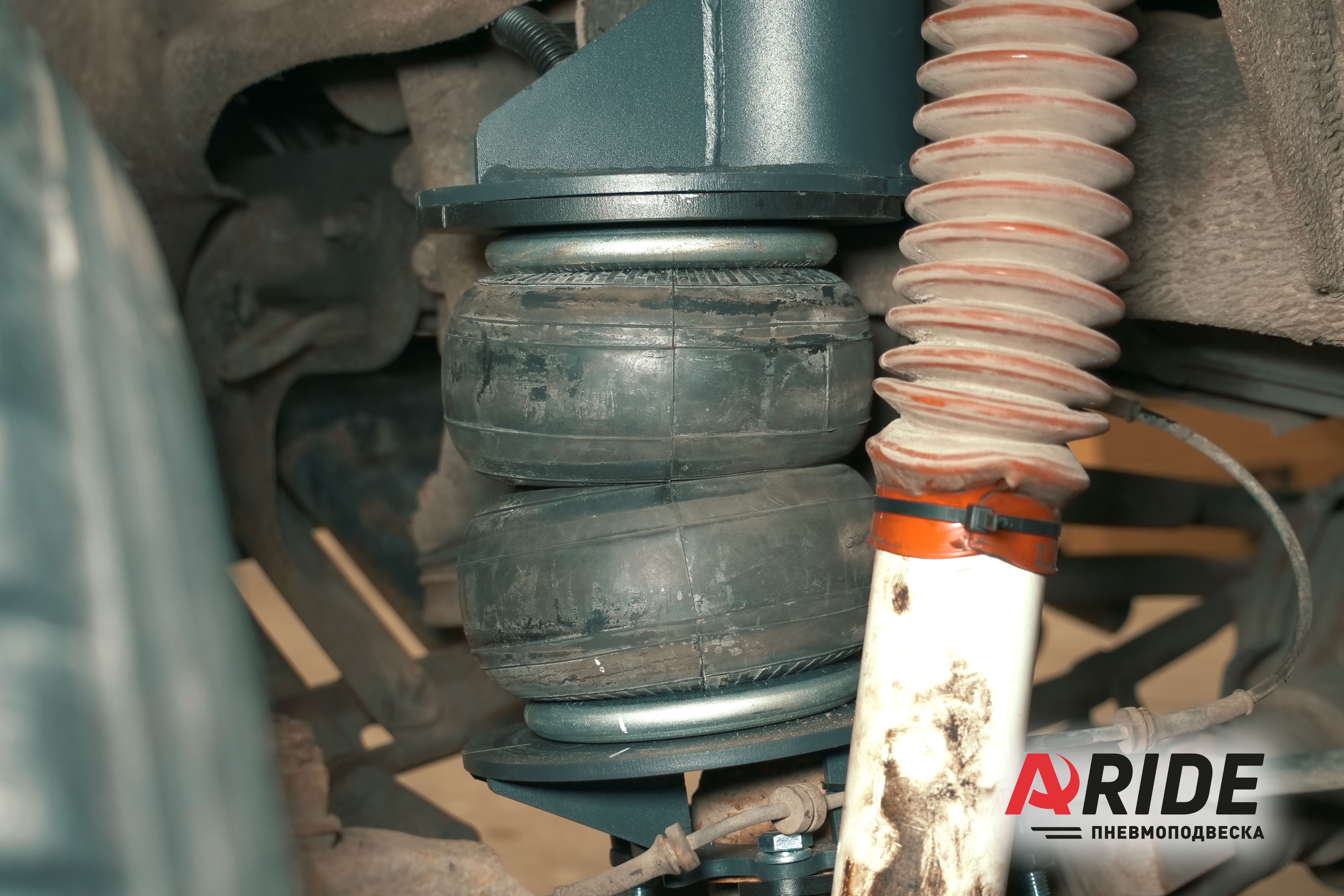 В данном проекте была произведена установка пневматических подушек на переднюю ось. Пневмоподушки устанавливаются вместо заводских пружин. Для монтажа комплекта достаточно демонтировать заводские пружины, и на их посадочные места установить новые кронштейны и пневмоэлементы. Всё устанавливается без каких либо доработок. Верхние кронштейны надеваются на заводские чашки крепления пружины. Нижние кронштейны так же надеваются на чашки, только уже на мосту, и дополнительно притягиваются обхватами при помощи болтов. Пневмоэлемент крепится за счёт двух болтов на верхнем фланце, и одном на нижнем.