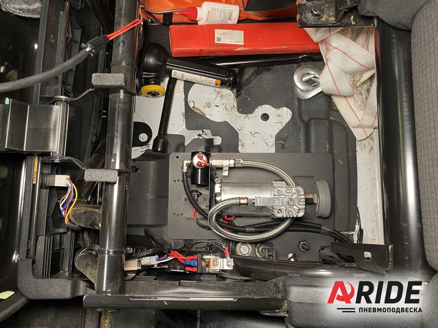В качестве управления была выбрана и установлена двухконтурная система 2.Эконом. Компрессор, реле, датчики устанавливаются под пассажирским сидением, через специальную пластину, которая так же изготавливается под данные автомобили. Она повторяет все контуры и линии, для обеспечения максимального прилегания, а так же крепится к нижней части сидения через болтовое соединение. В данной системе используется компрессор - ARIDE 100C.