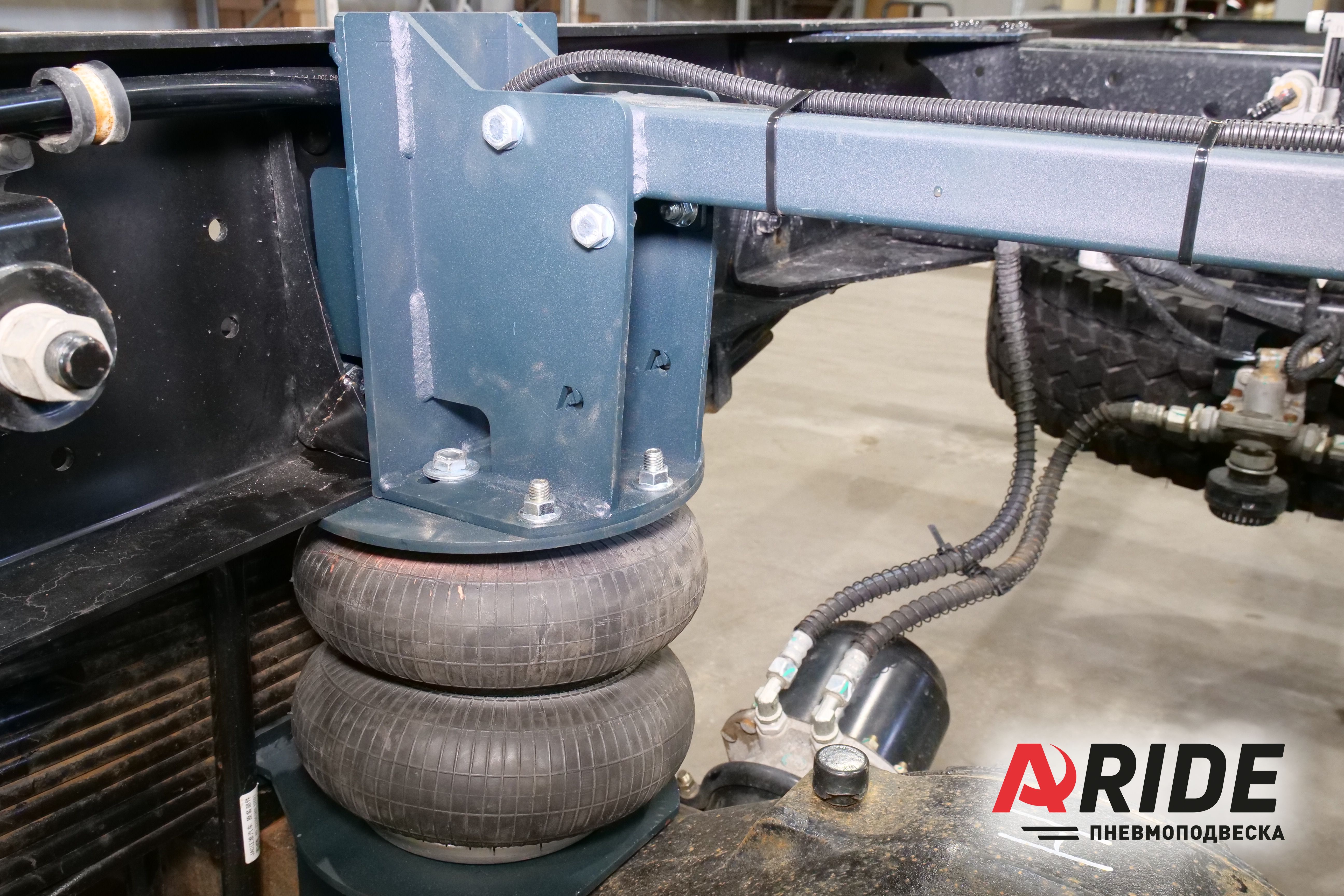 В данном проекте интересно то, что автомобиль приехал к нам ещё без фургона, просто "голое" шасси. Это позволяет не только более удобно установить комплект, а так же намного быстрее, ведь доступ к мосту и раме ничем не ограничен. Как это принято, комплект на заднюю ось устанавливается между мостом и рамой. Крепление осуществляется через заводские отверстия в раме, а так же за счёт обхватов моста. Для уменьшения вращающего момента, комплект включает в себя поперечный усилитель. В данном проекте используются пневматические подушки 250/2, грузоподъёмность каждой составляет 2000 килограмм при давлении в 8 атмосфер.